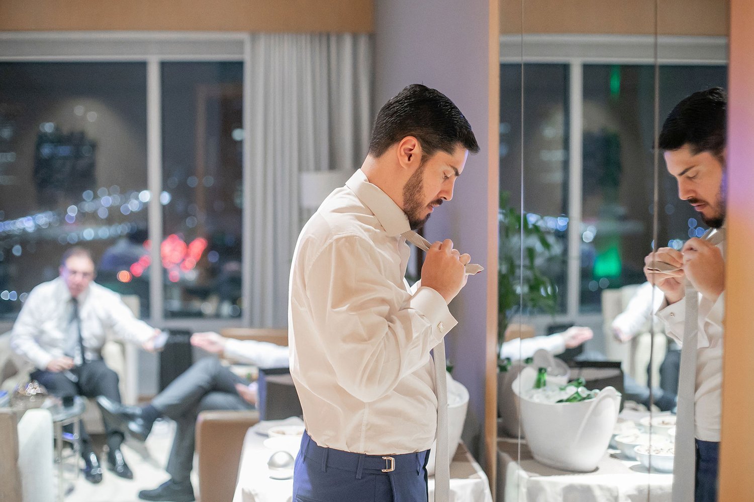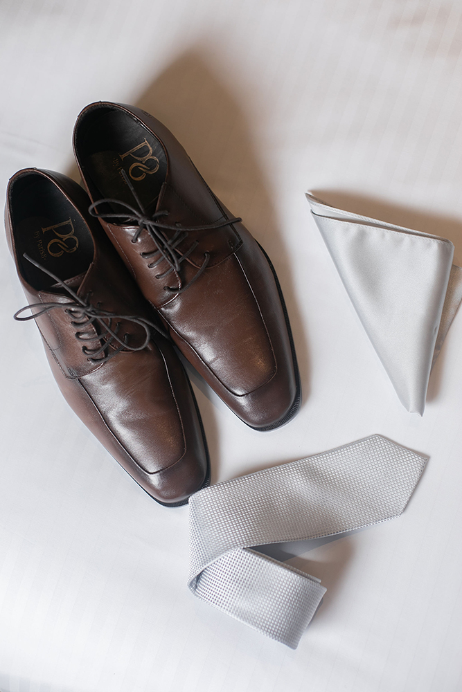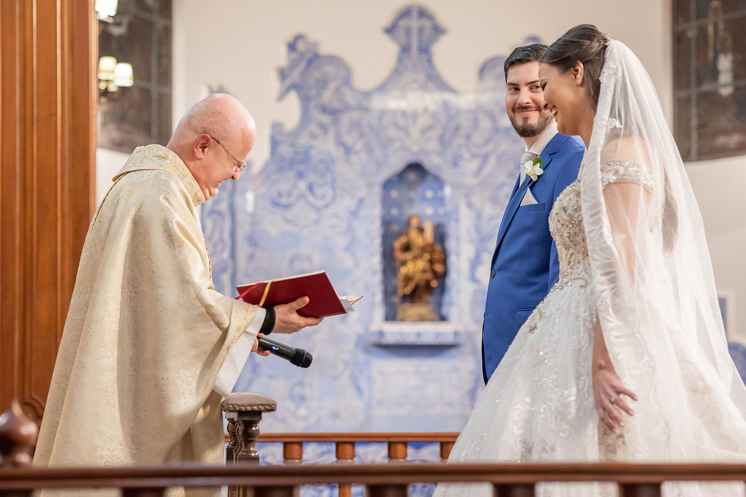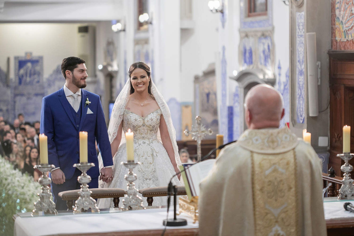 Já o noivo optou pelo traje azul com gravata branca, também muito elegante e adequado para a cerimônia na Nossa Senhora do Brasil.