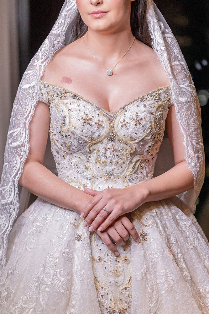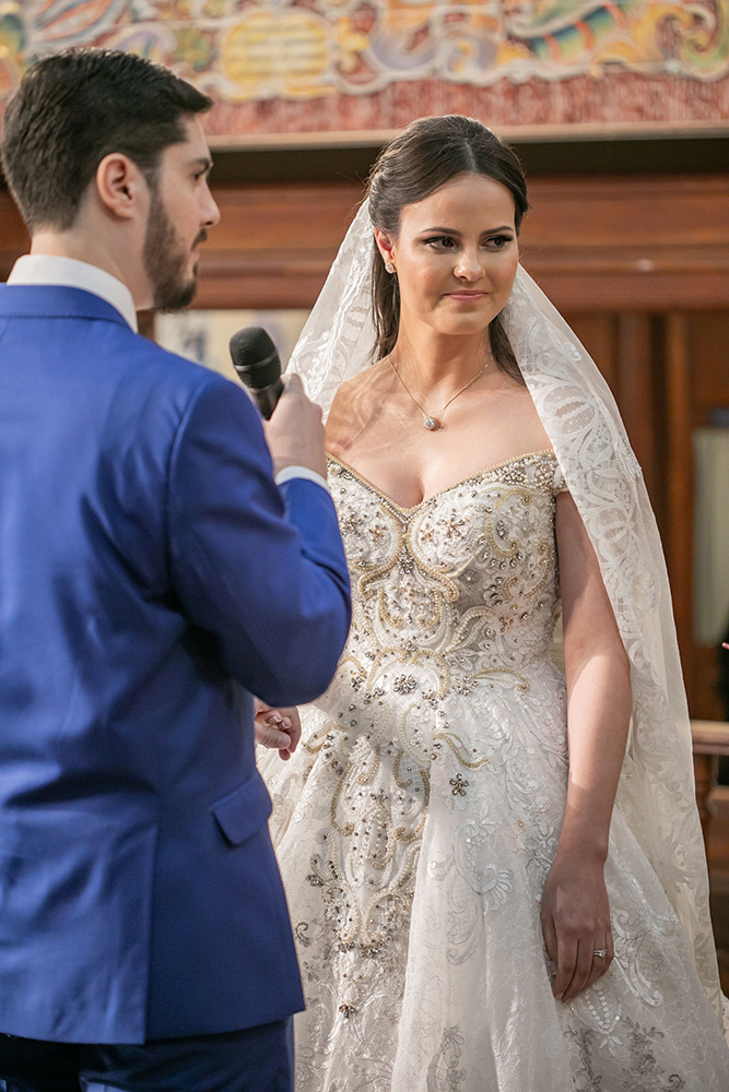 Aline ficou lindíssima! O vestido de noiva bordado e o véu longo são a perfeita combinação entre o clássico e o contemporâneo.