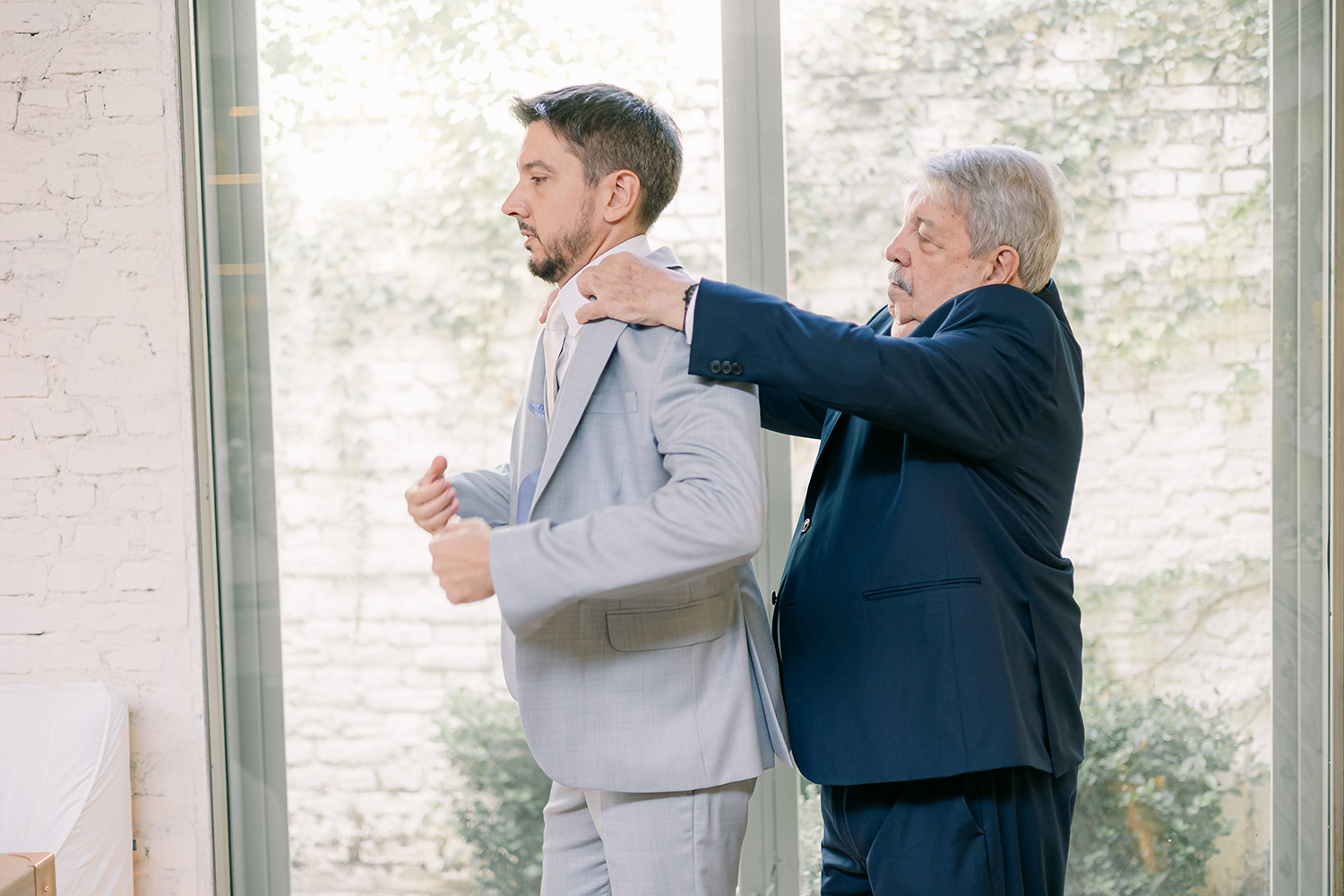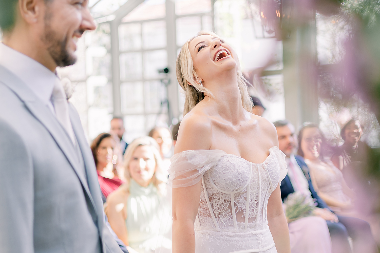 A escolha do celebrante foi uma das mais difíceis. Depois de muito procurar, encontramos o Paulo Godoy, que fez uma celebração perfeita, exatamente como sonhávamos. Queríamos algo que fosse leve, pois no mês anterior ao casamento eu tive duas perdas importantes, a de uma amiga e da minha cachorrinha de 16 anos, que levaria as alianças. Nós pedimos que a celebração as homenageasse, mas que mantivesse uma leveza. E foi exatamente assim. A cerimônia foi animada e ao mesmo tempo emocionante.