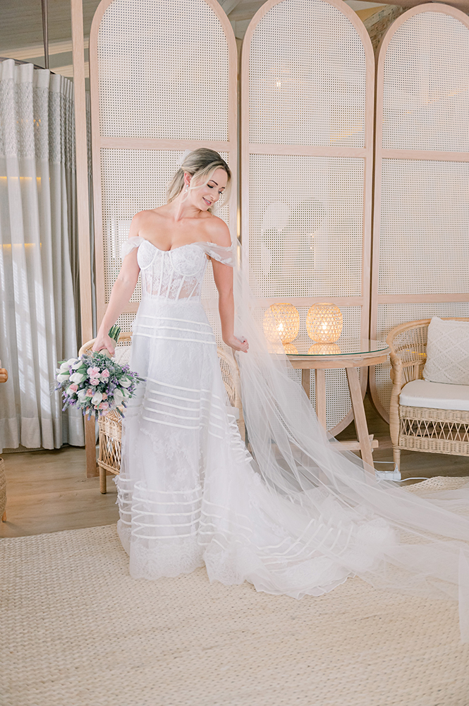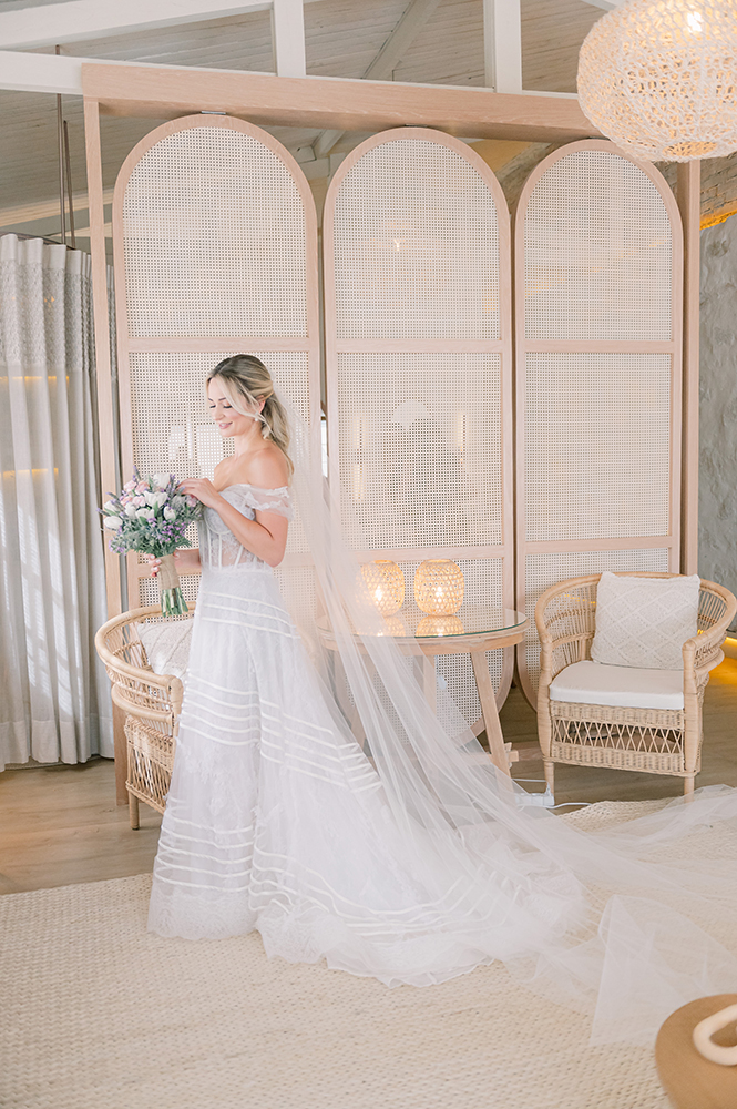Após escolher o local, foi a vez do vestido. Eu já tinha uma ideia do que queria (um vestido bem fluido, delicado e com renda), e quando fui à Casamarela Noivas, encontrei exatamente o que procurava. Sem dúvida foi amor à primeira vista!