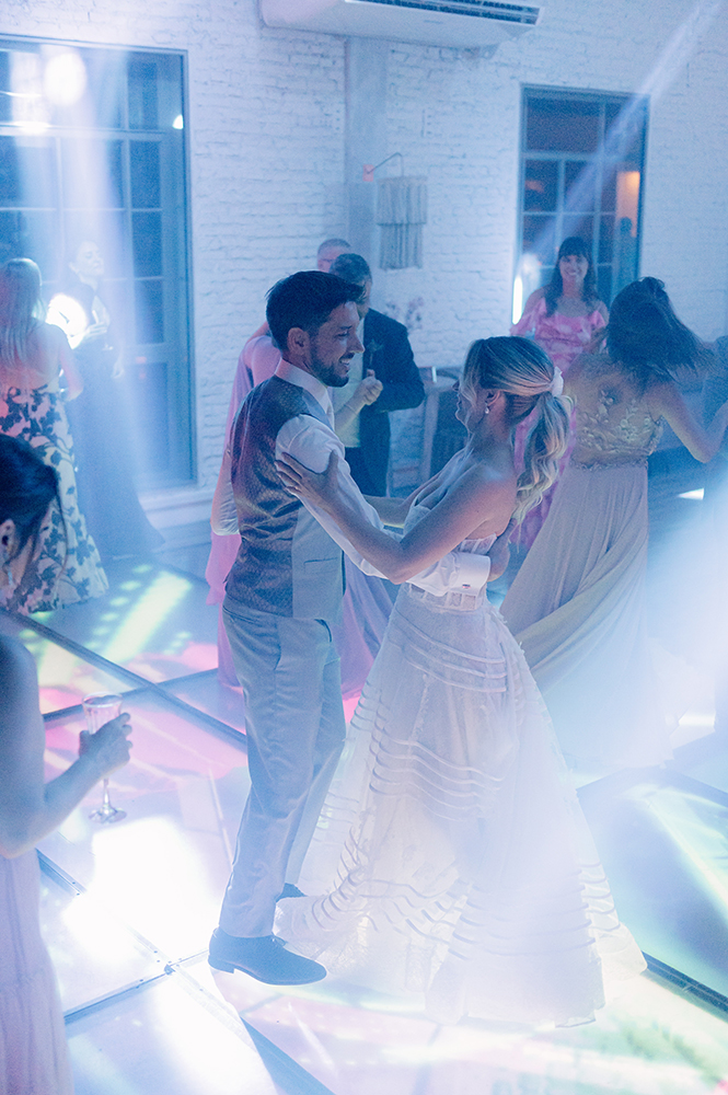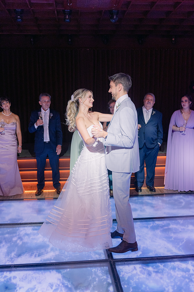 Para a dança dos noivos, decidimos fazer aulas de Lindy Hop com o Cesar Munhoz, pois no início do nosso namoro vimos uma apresentação de dança dele e do grupo That Swing Dance Company e combinamos que um dia aprenderíamos. Nós fizemos aulas semanais durante seis meses e a coreografia ficou ótima. O Cesar foi muito paciente e atencioso com a gente e nos últimos dias ensaiamos intensamente. O resultado ficou muito legal. O noivo arrasou na dança e ficou super feliz com a performance.