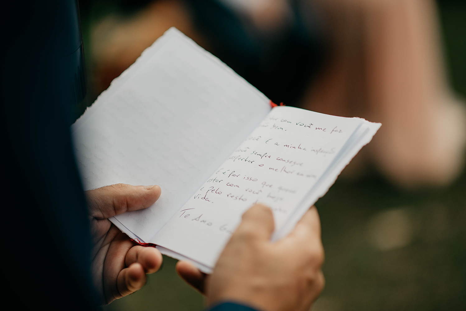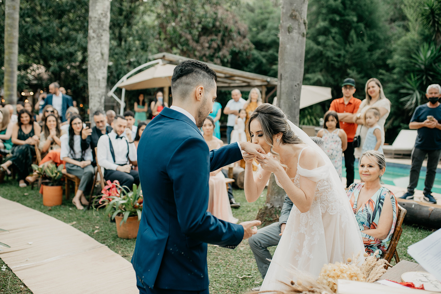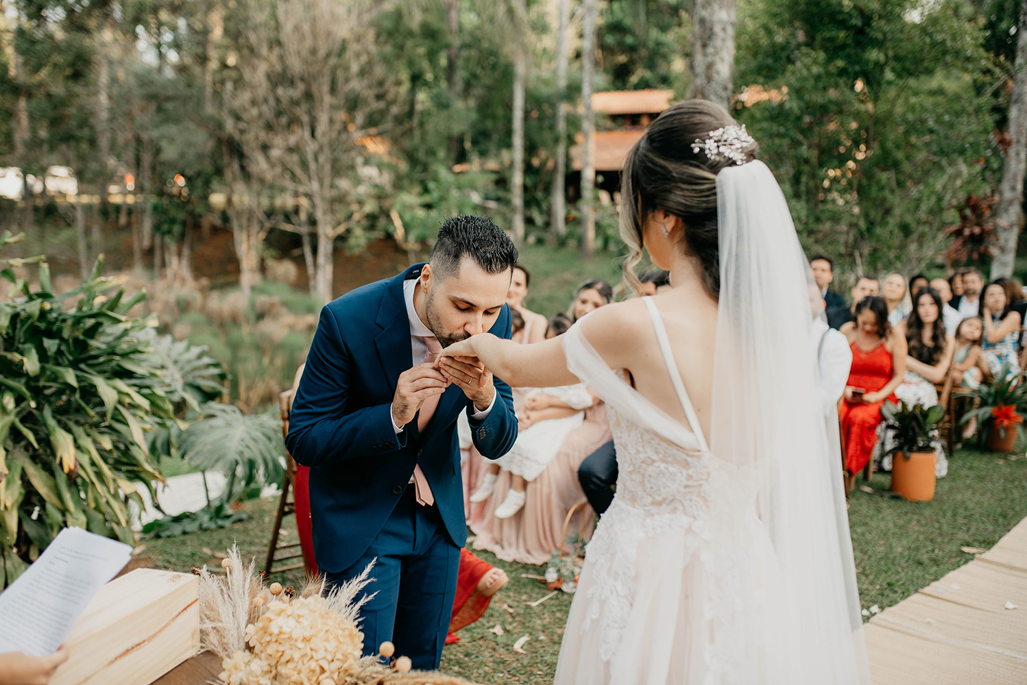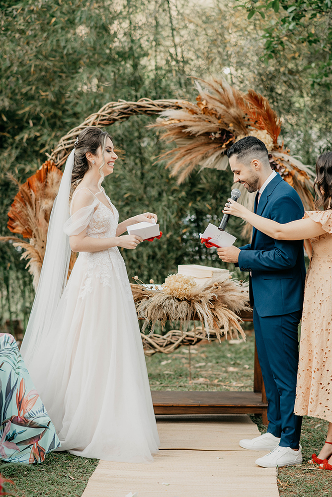 A celebração foi feita por uma grande amiga, que aceitou o desafio sem nunca ter feito algo parecido. Em resumo, saiu tão bem que vários convidados querem chamá-la para celebrar o casamento.