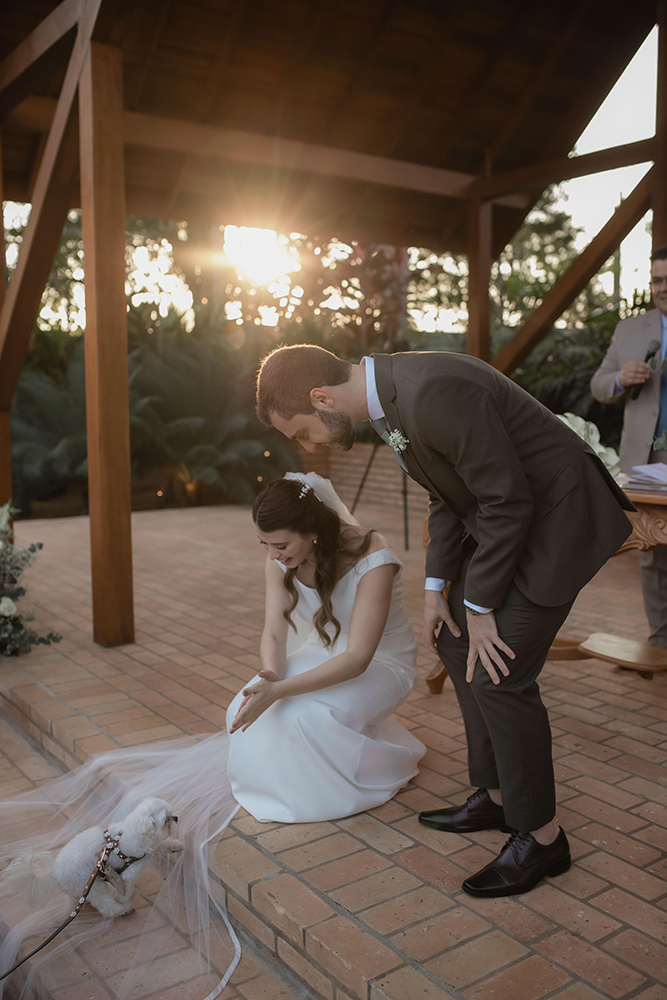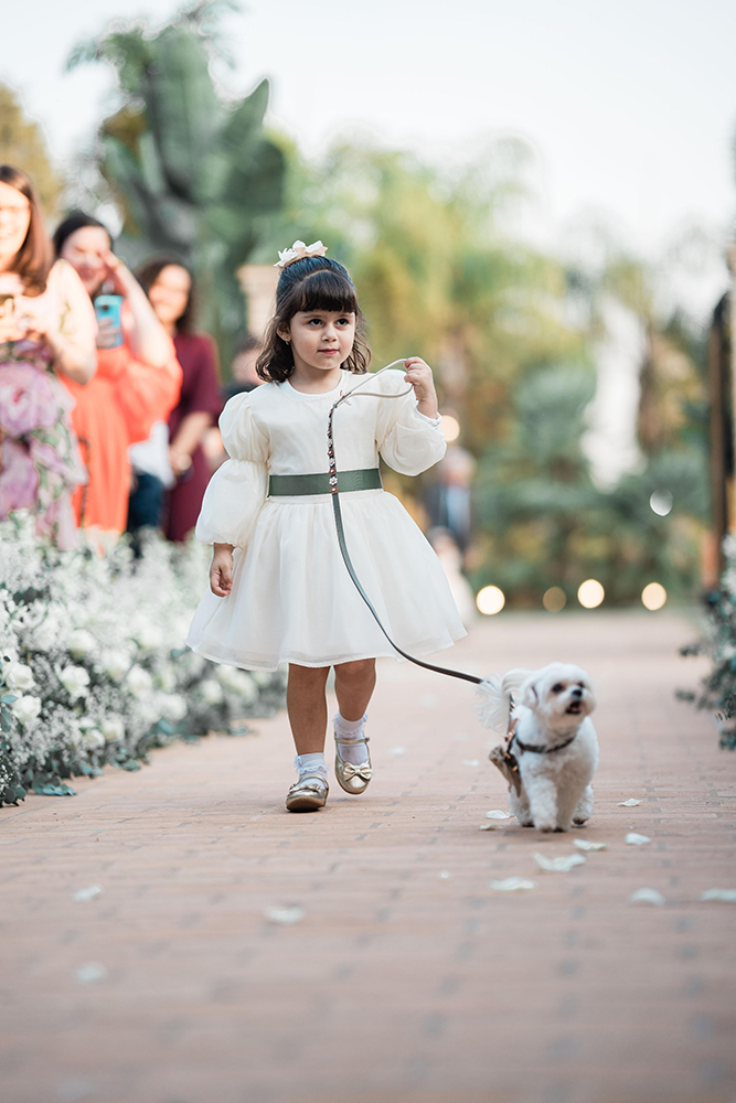 Algumas peculiaridades: Lucas queria pagode, Pri queria sertanejo. Na decoração, um lindo bolo para corte na lateral da mesa. E a entrada das alianças, com a Pipoca, filha pet dos noivos, como destaque.