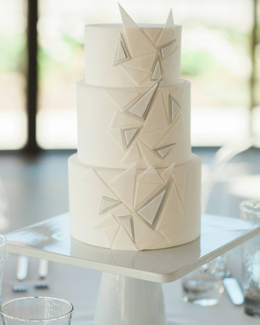 Um bolo inusitado com formas geométricas, mas, ao mesmo tempo, limpo e contemporâneo. É ou não é um elemento de destaque?