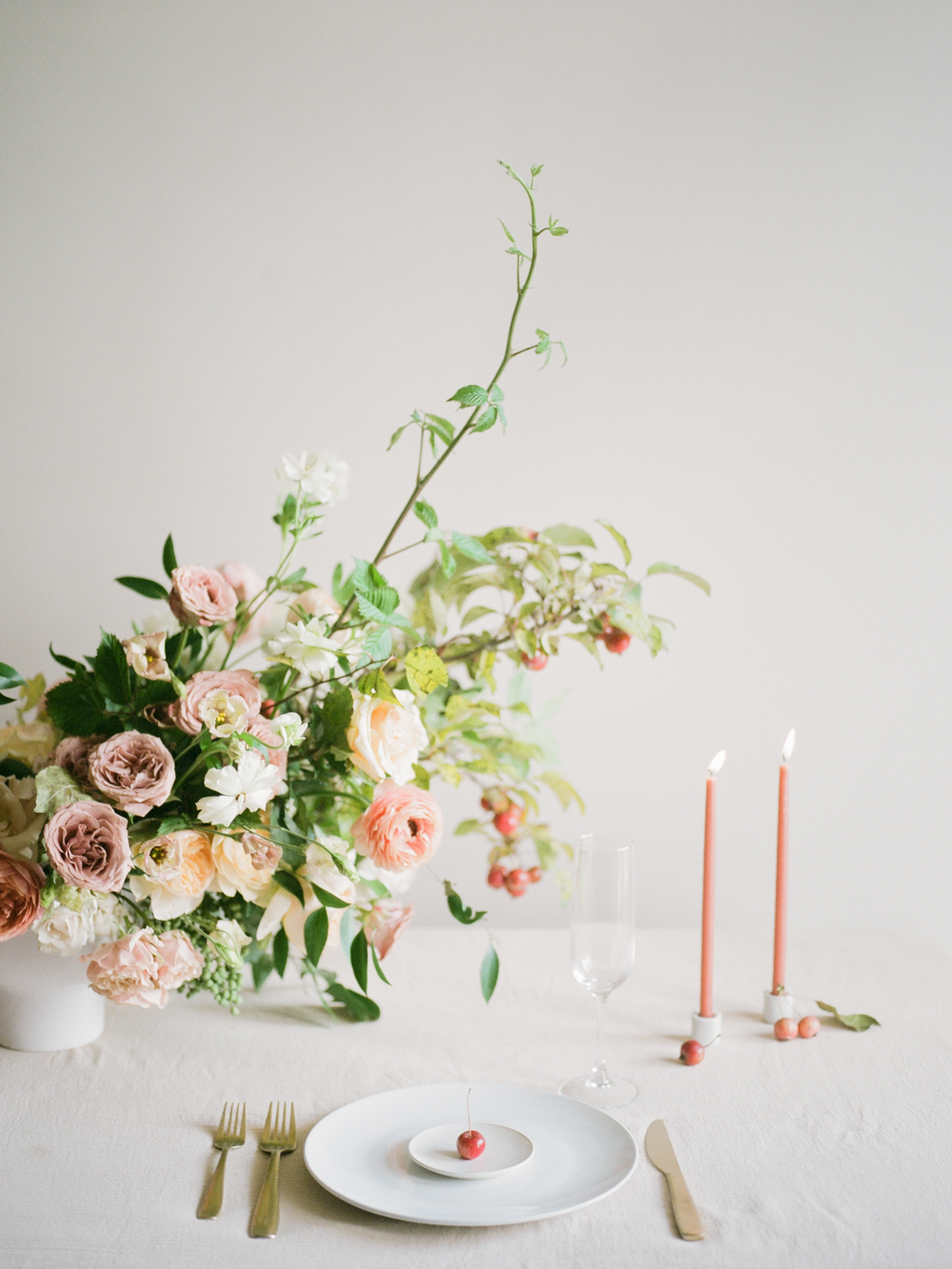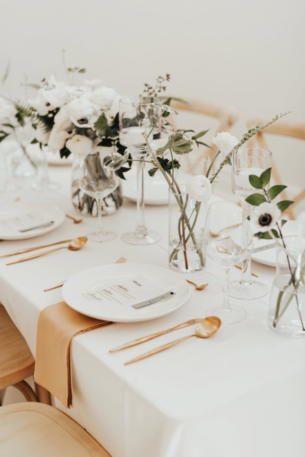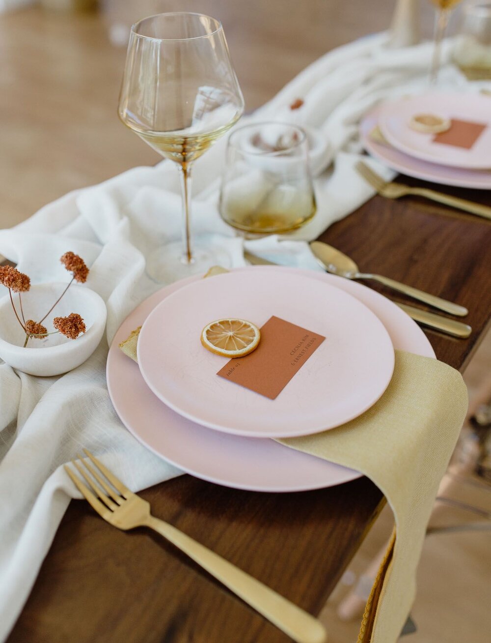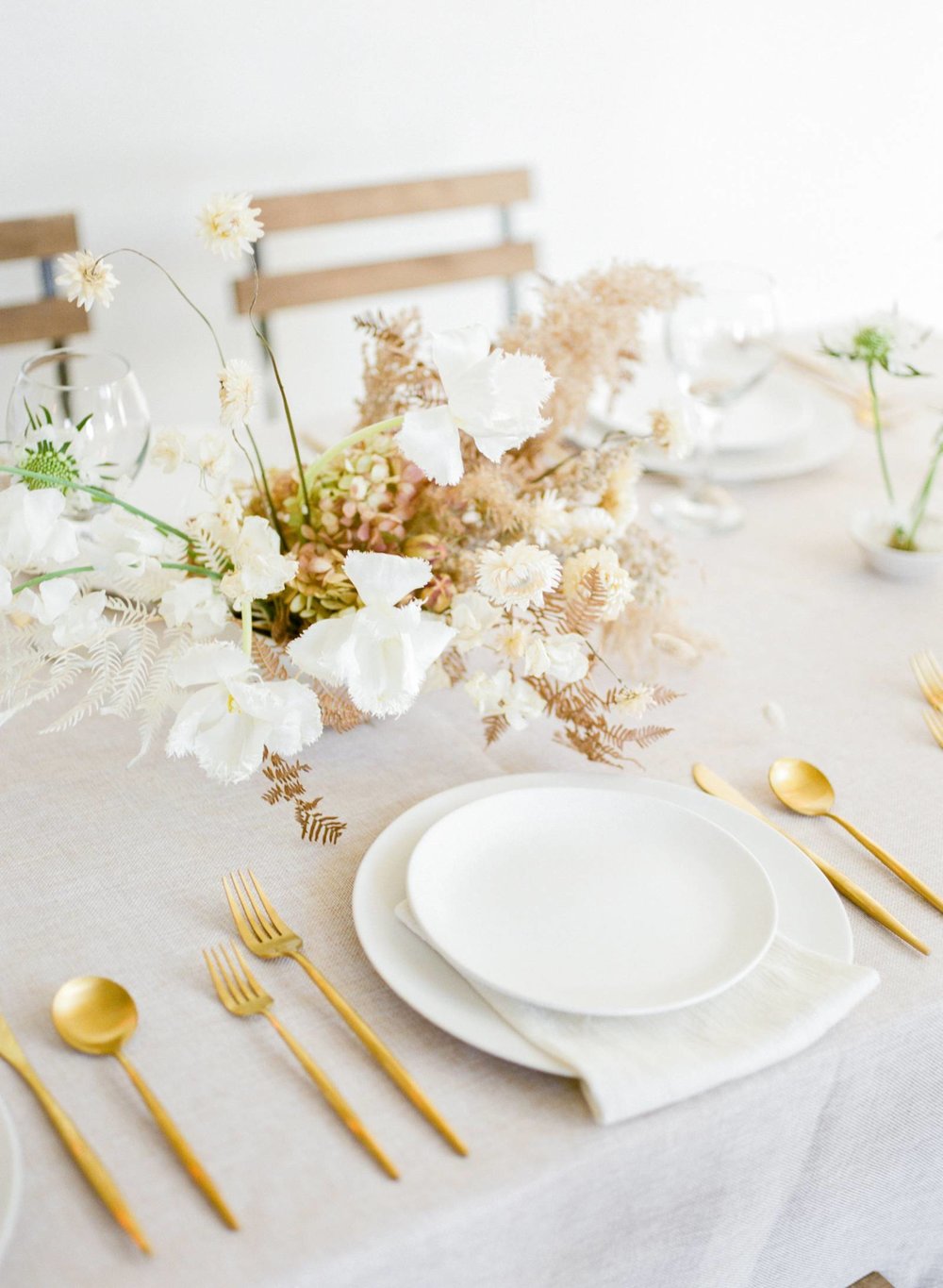 Talheres em destaque, uma corzinha e detalhes orgânicos para um casamento minimalista, romântico e charmoso.