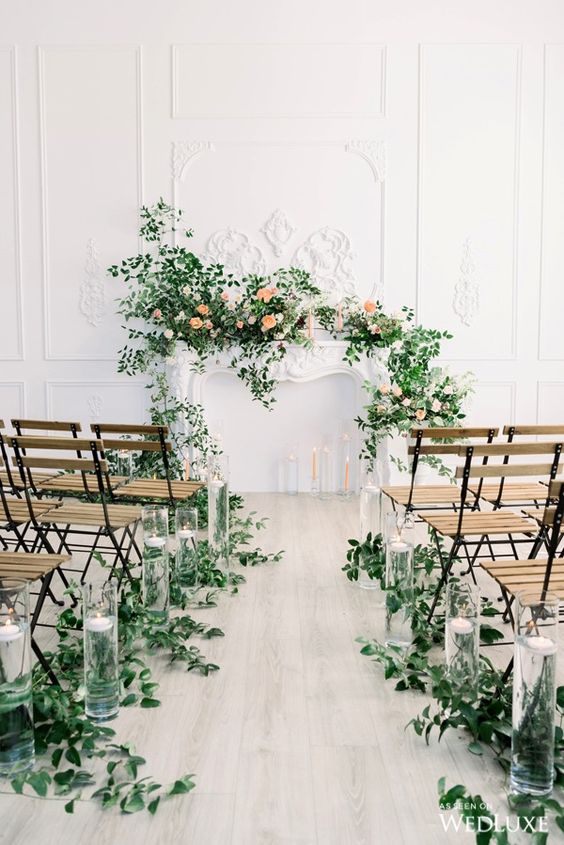 Ao quebrar o branco, as folhagens trazem um toque de ousadia. Que tal ter um cenário assim como pano de fundo para a troca de votos?