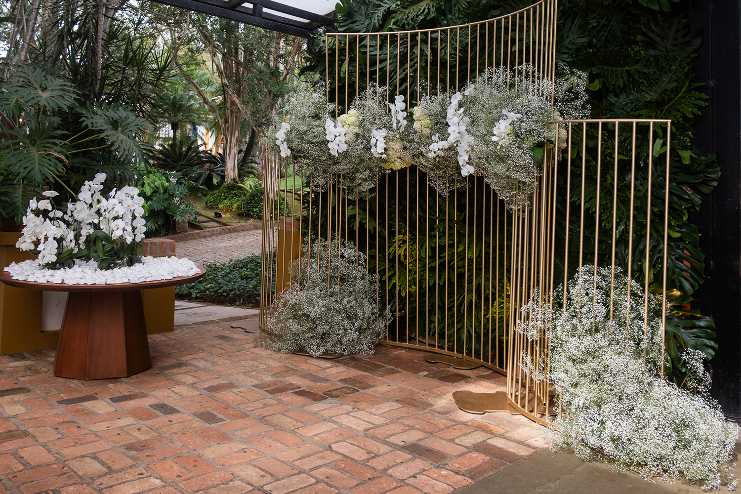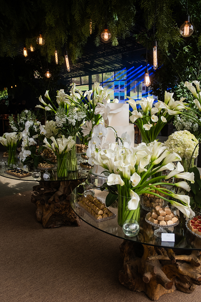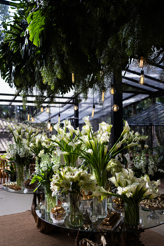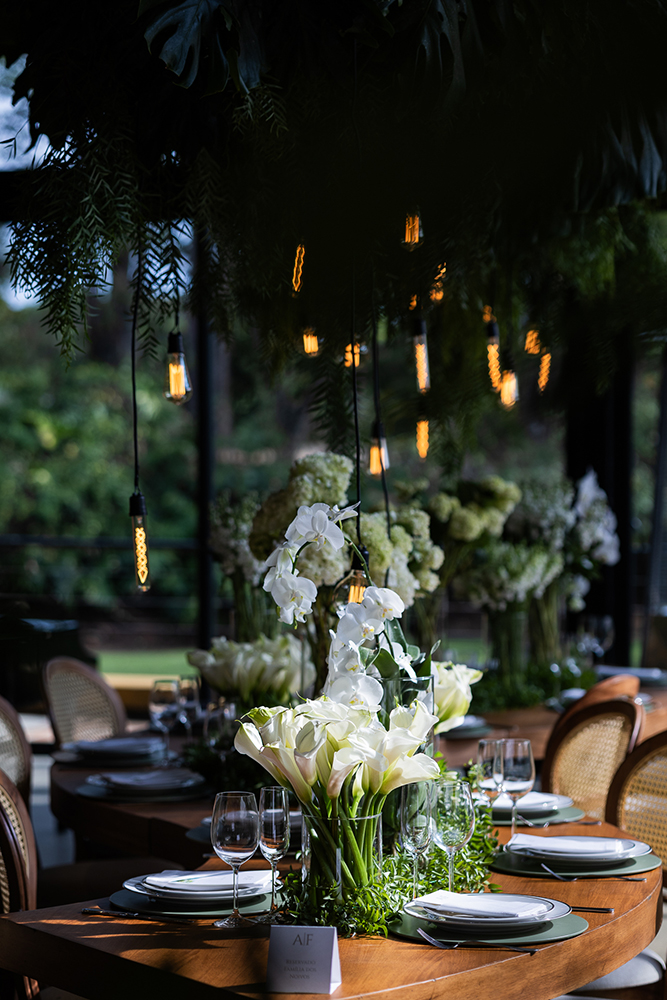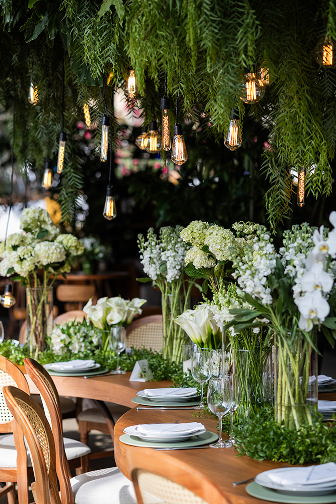 A decoração, por exemplo, contou com todos os elementos solicitados pelo casal: tons de verde e branco, vidro, velas, lâmpadas de filamento e apenas arranjos plantados ou em vasos com água, sem nenhuma espuma floral.