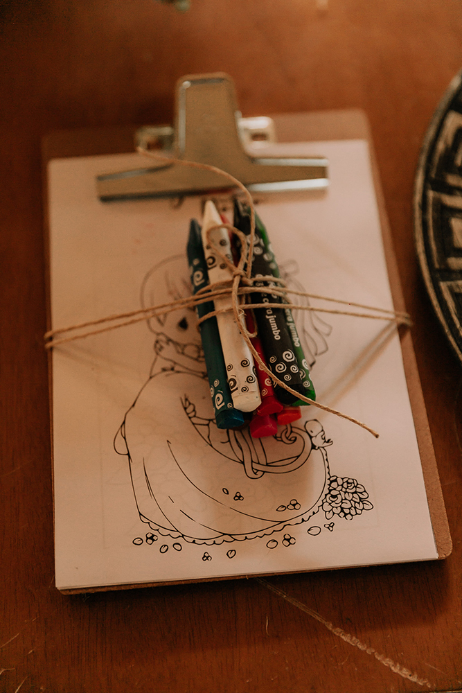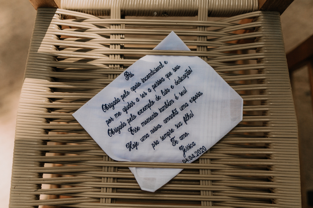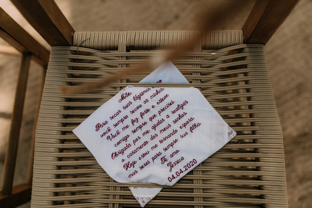 Também preparamos alguns detalhes especiais para deixar nosso dia único. Mandei bordar lenços personalizados para os meus pais e sogros; toda a papelaria foi feita pelo Natan; escrevemos recados para cada convidado, para marcar os lugares e deixar claro o quanto cada um era especial pra gente; os macramês das cadeiras e do buquê foram feitos pela minha mãe; fizemos kits de pintura para as crianças, para marcar o lugar delas na mesa…