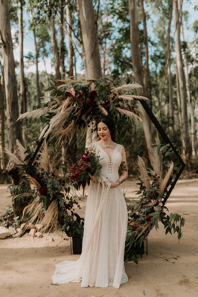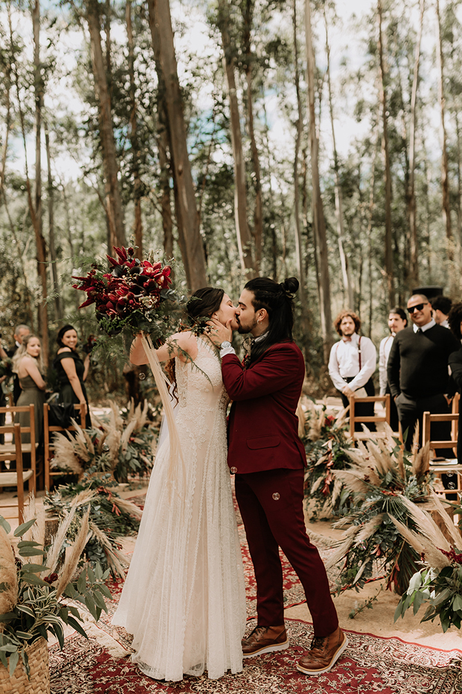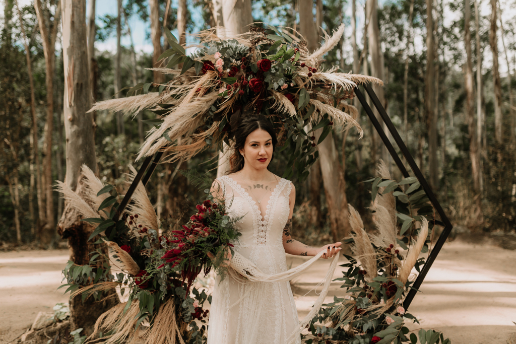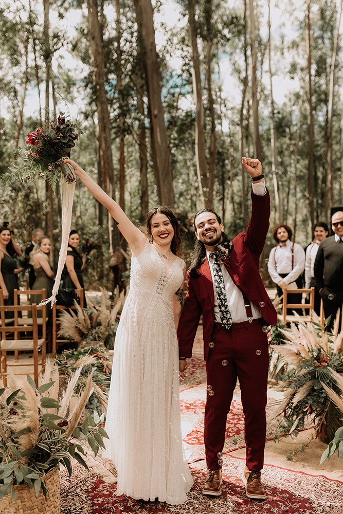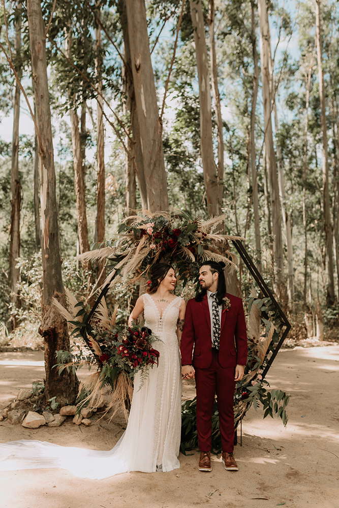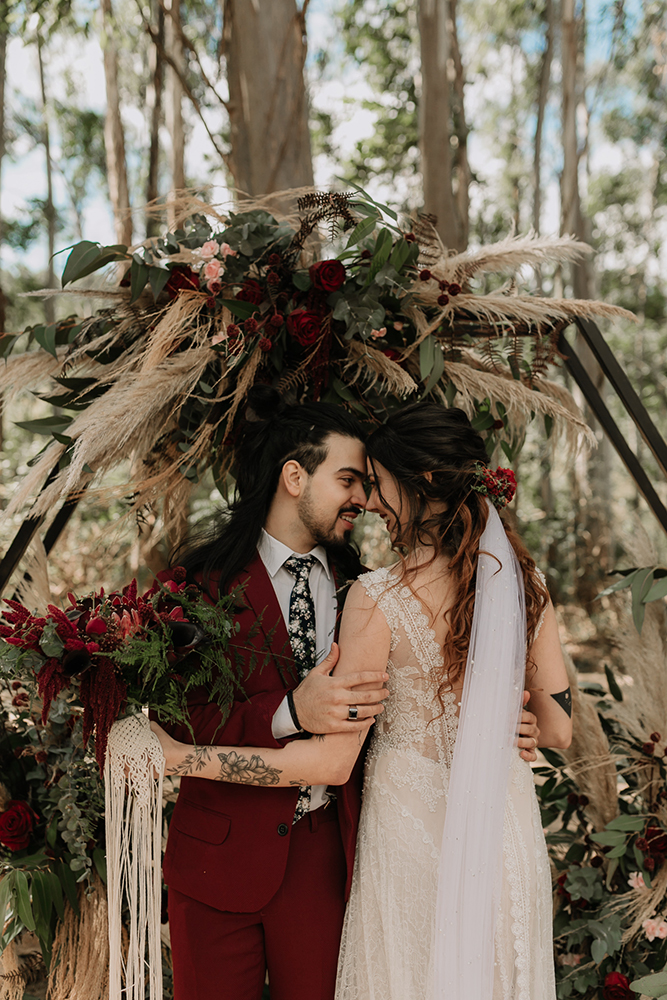 O casamento na floresta, assim como sonhado pelos noivos, aconteceu com muita personalidade, capim dos pampas, madeira e toques de marsala.