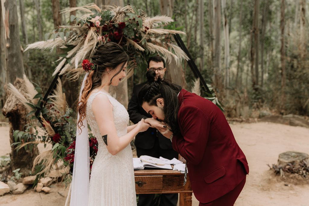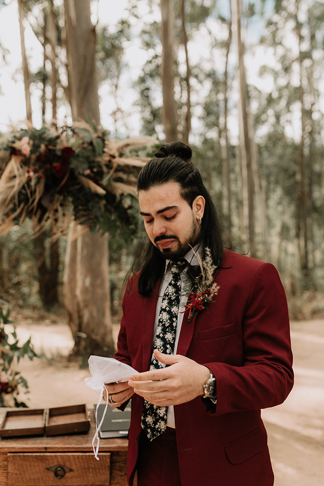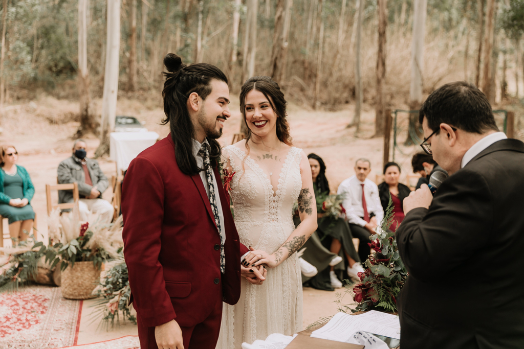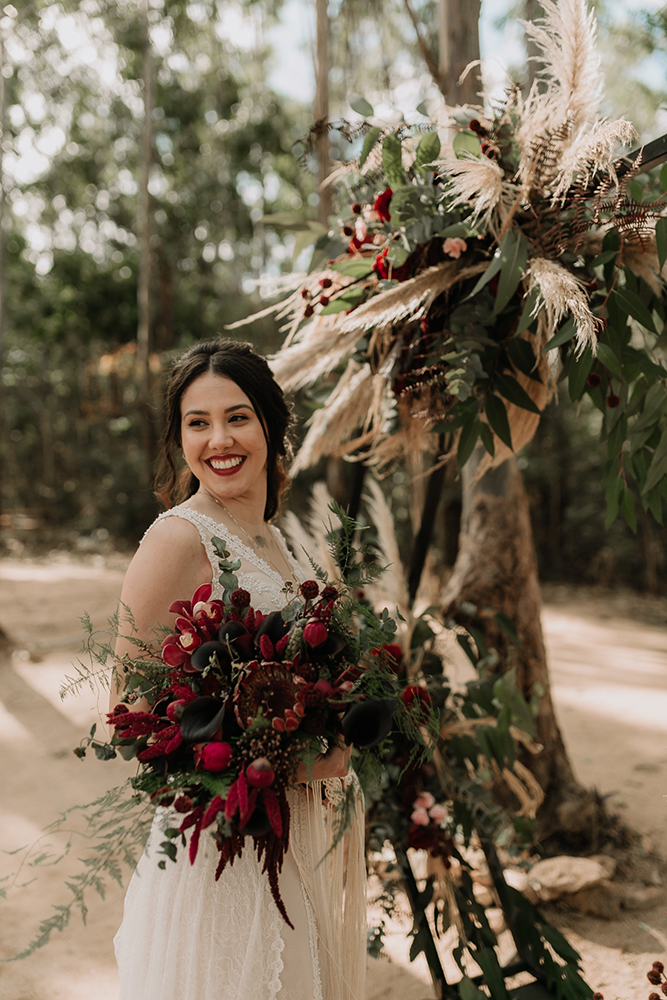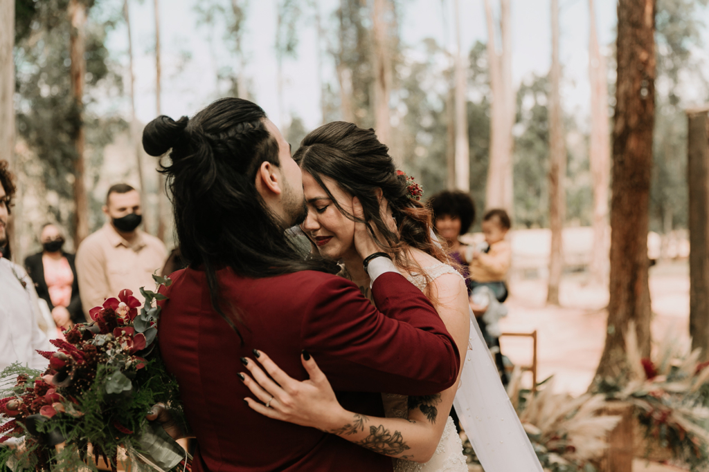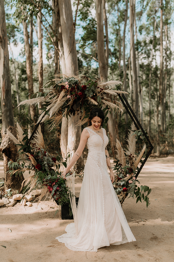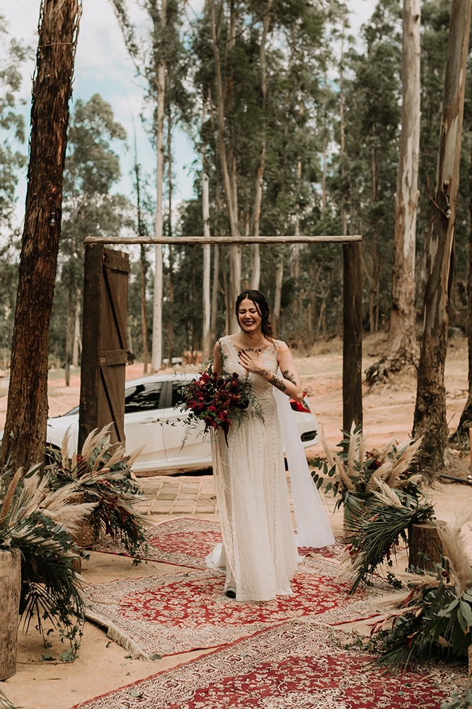 O casamento na floresta, assim como sonhado pelos noivos, aconteceu com muita personalidade, capim dos pampas, madeira e toques de marsala.