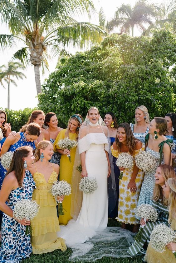 Sou fascinada por essa versão de madrinhas padronizadas, mas elas não necessariamente precisam estar iguais. Sugerir certa variação de cores também funciona!