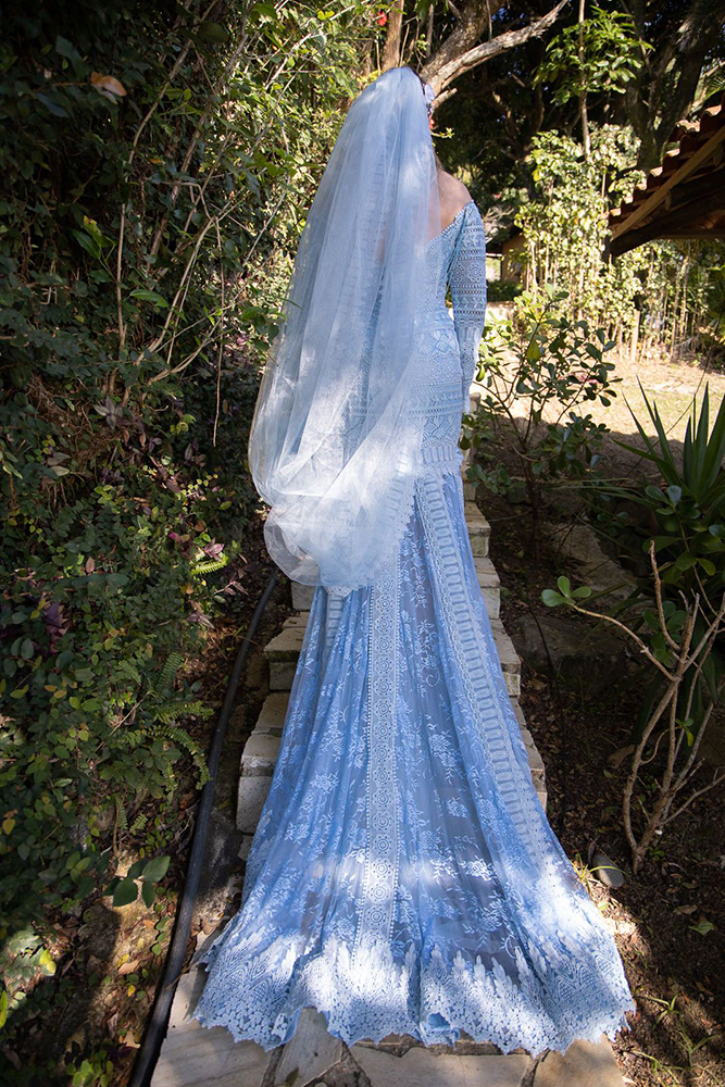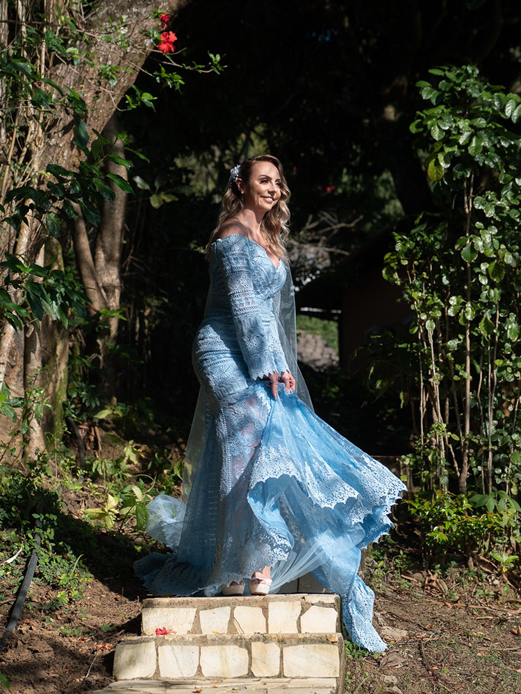 E, finalmente, azul para os noivos! Para alguns o significado foi representar a Nossa Senhora dos Navegantes, para outros, Iemanjá ou Vixnu. Para nós, enfim, foi uma singela homenagem às forças da natureza, a plenitude da água e do mar.