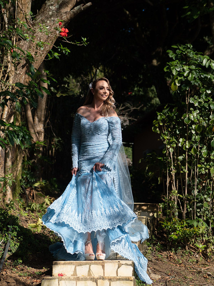 Surpreendentemente, Noelle substituiu o tradicional vestido branco pelo azul. Aliás, um modelo lindíssimo, tão delicado e vistoso quanto a própria noiva!