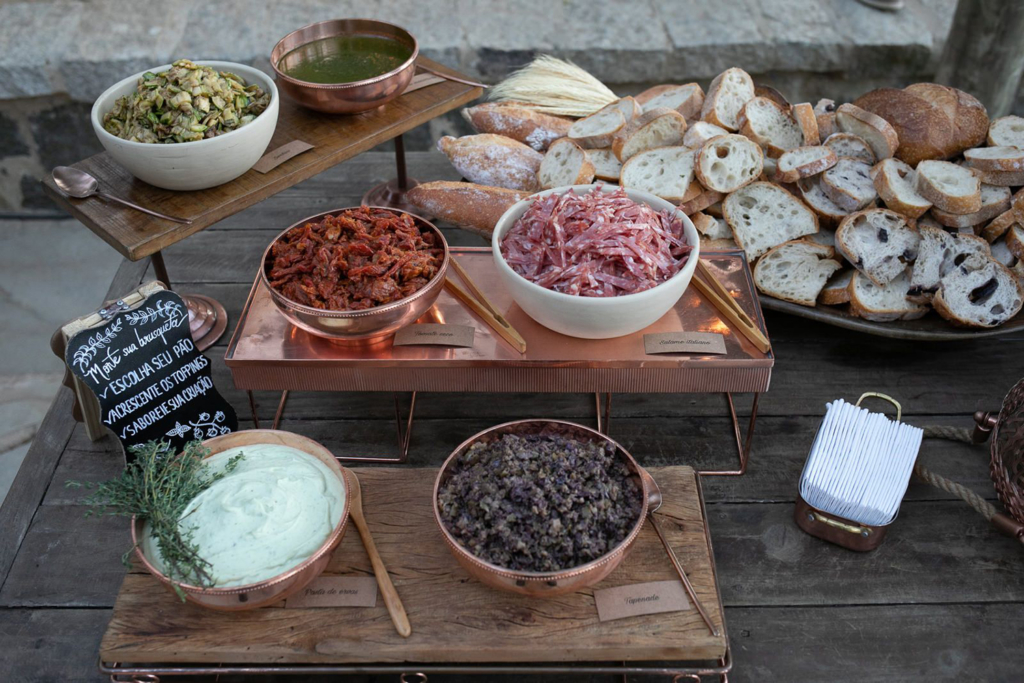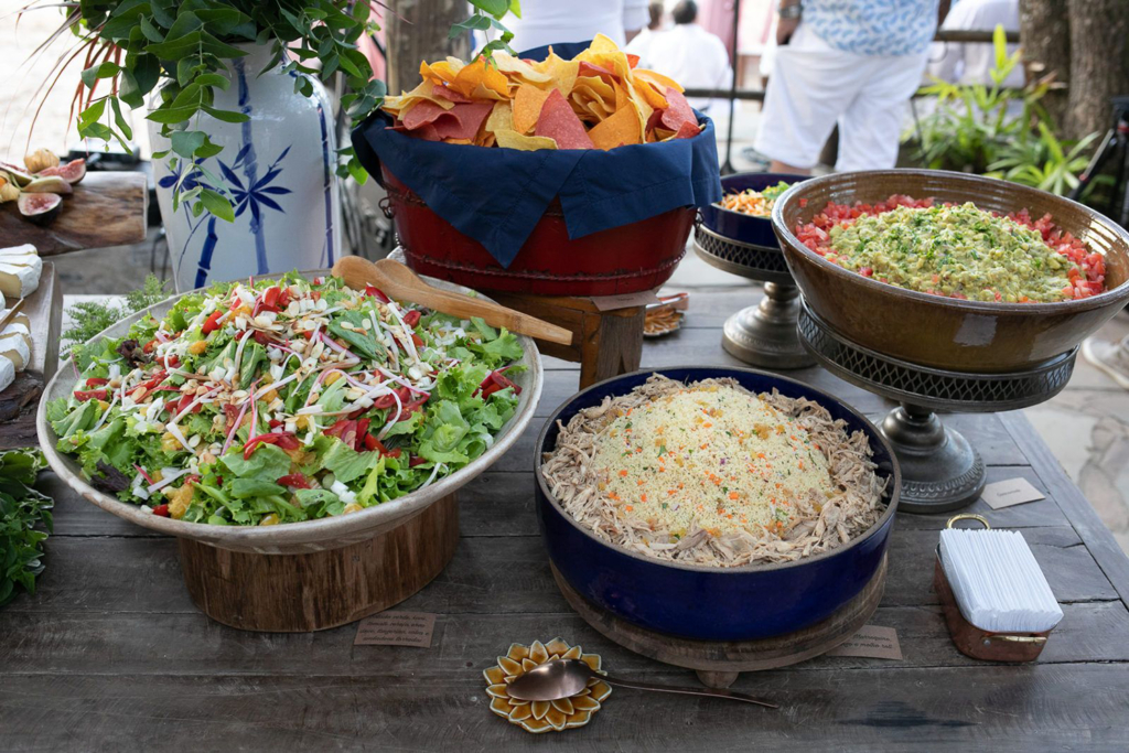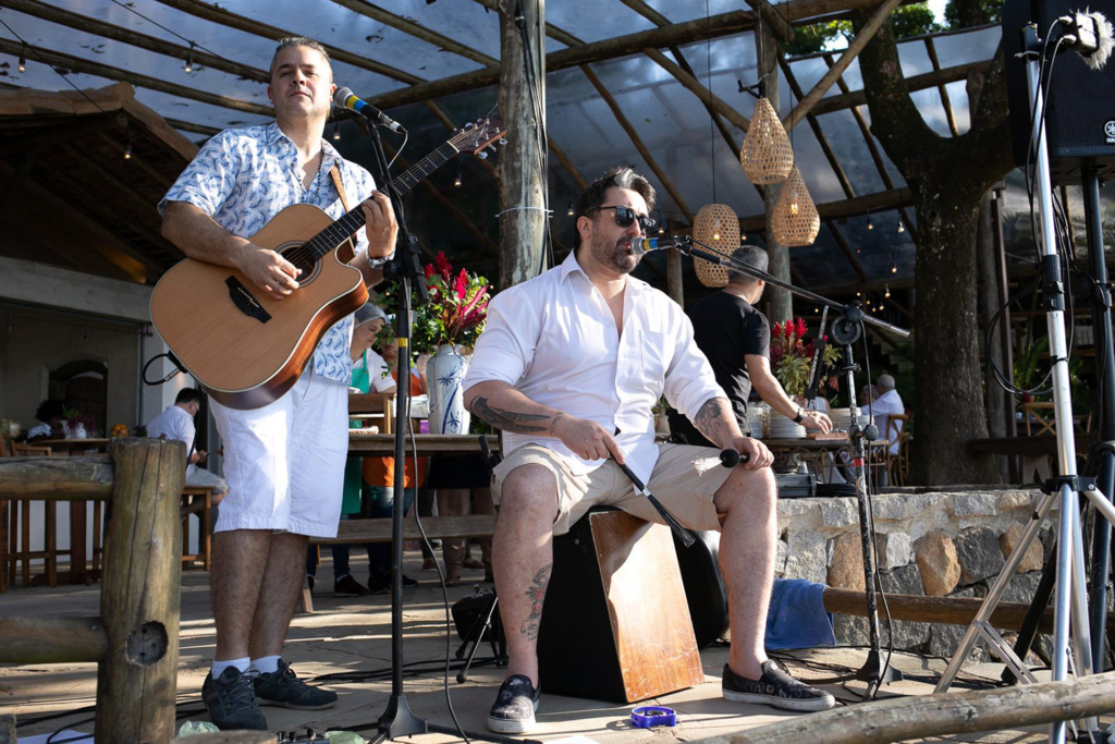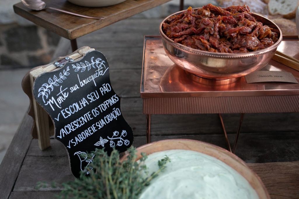 A ideia era que eles se sentissem num luau, numa festa fresh sem protocolos, tanto que foram dispostas mesas de diferentes alturas e formatos, a cerimônia foi regida por uma banda ao vivo e, após a celebração, os convidados puderam se deliciar com uma ilha gastronômica, jantar volante e lanche da madrugada. Foram 10 horas de um impecável serviço de buffet realizado pelo Zucca. A equipe merece o nosso agradecimento! Os indicamos com a maior confiança!”.