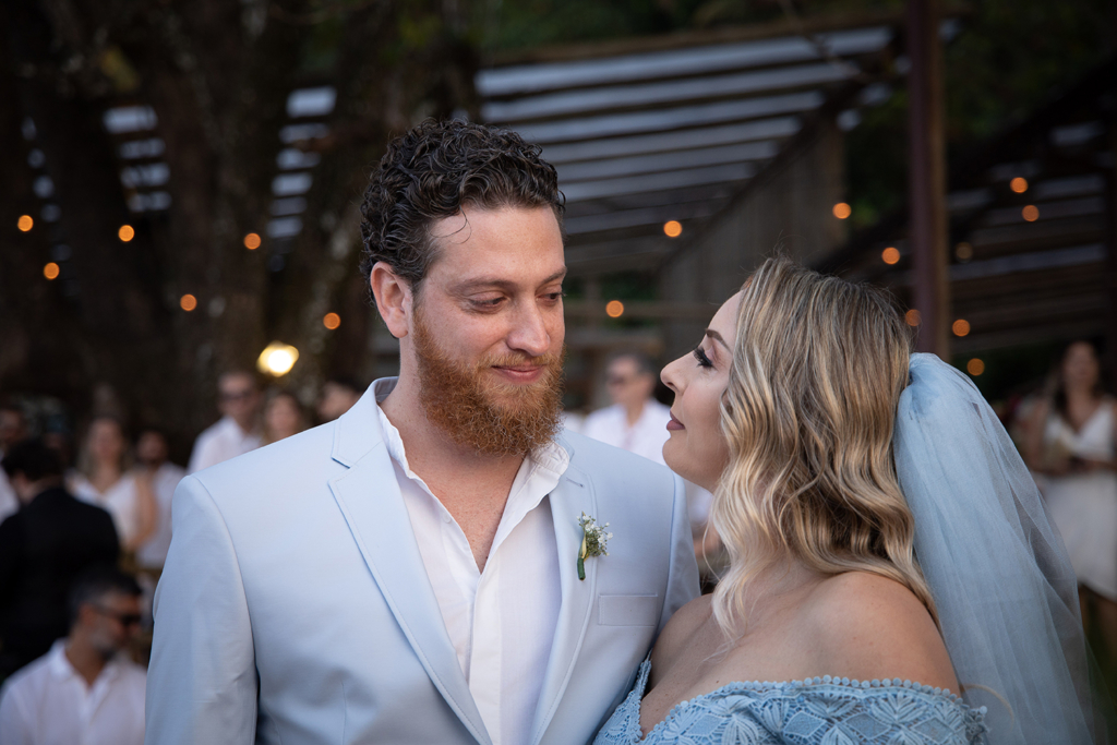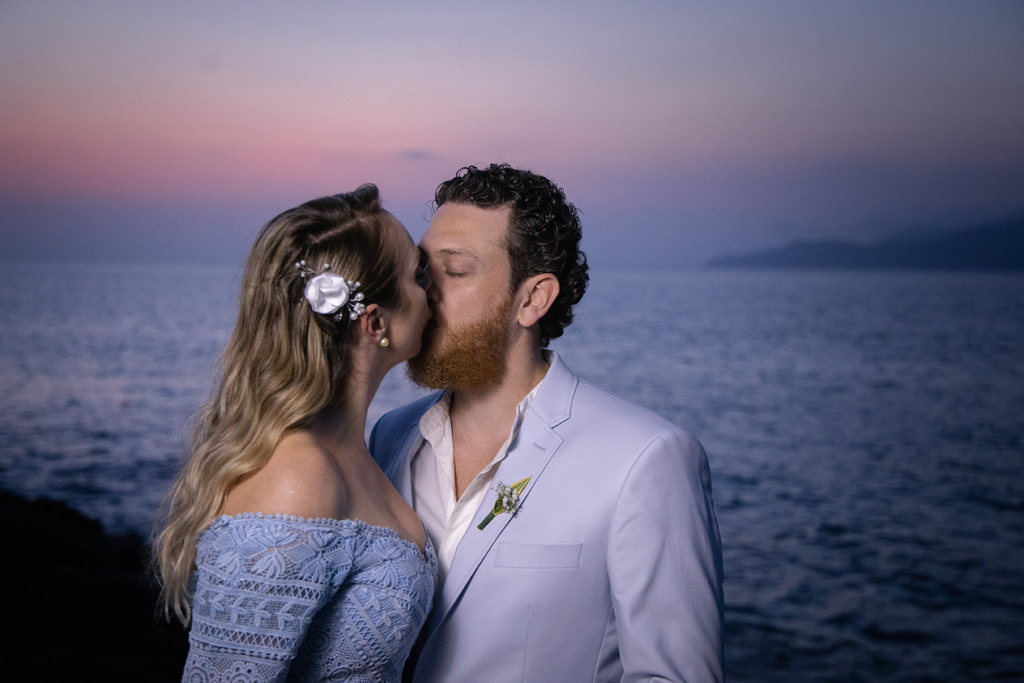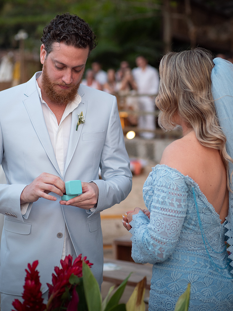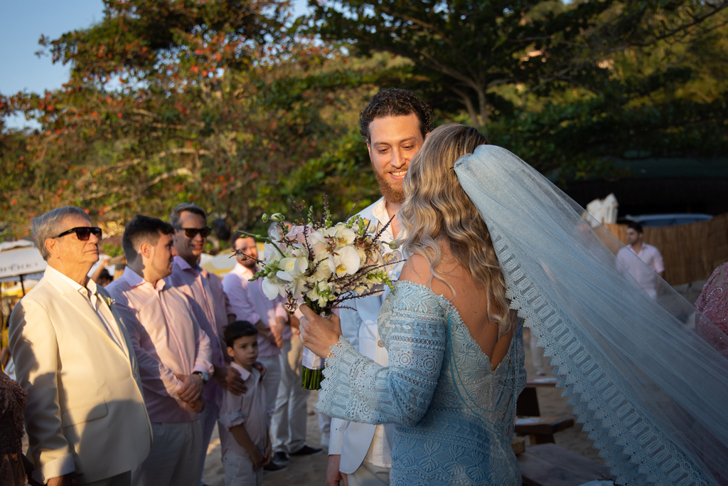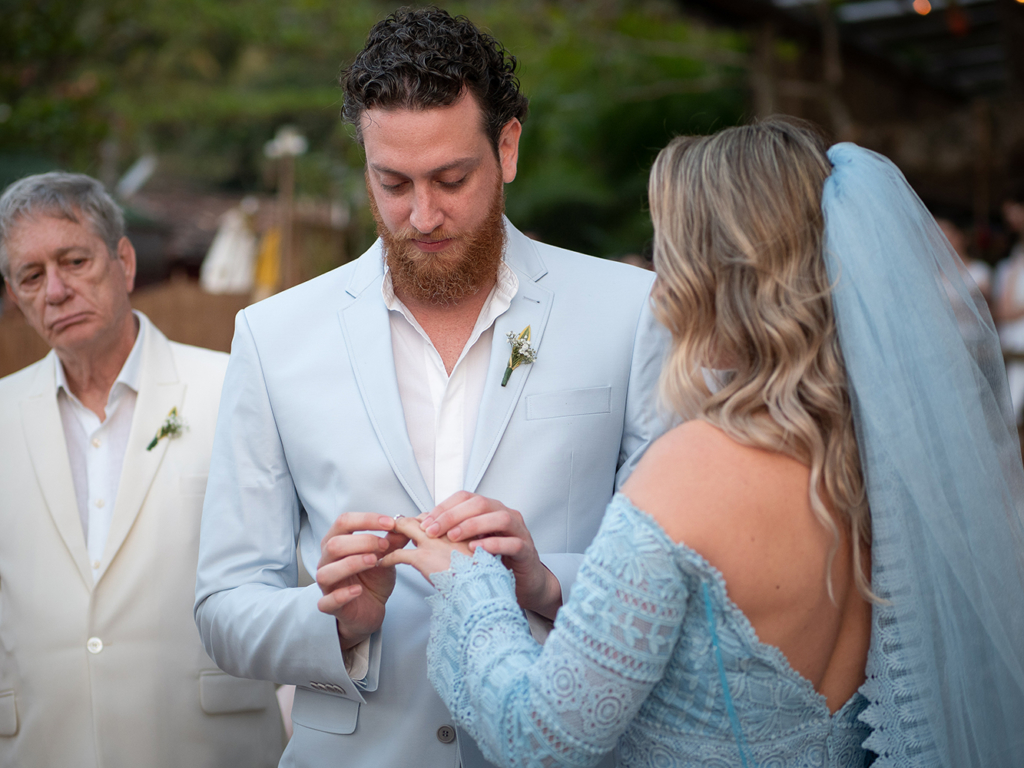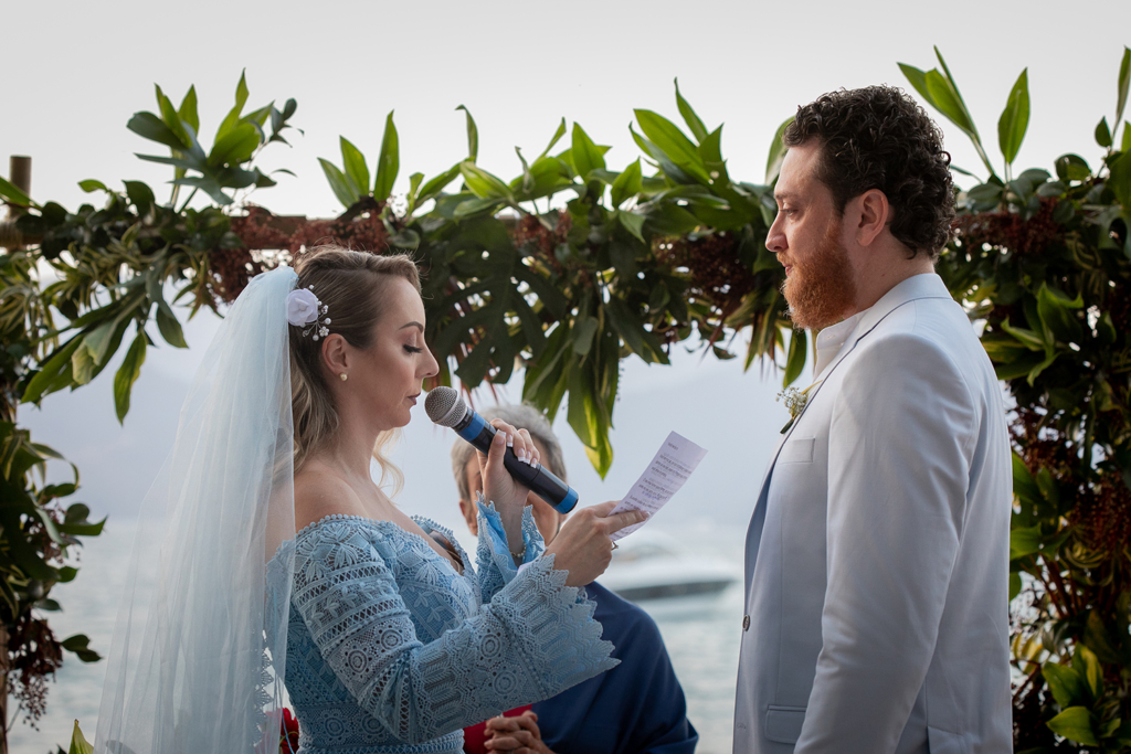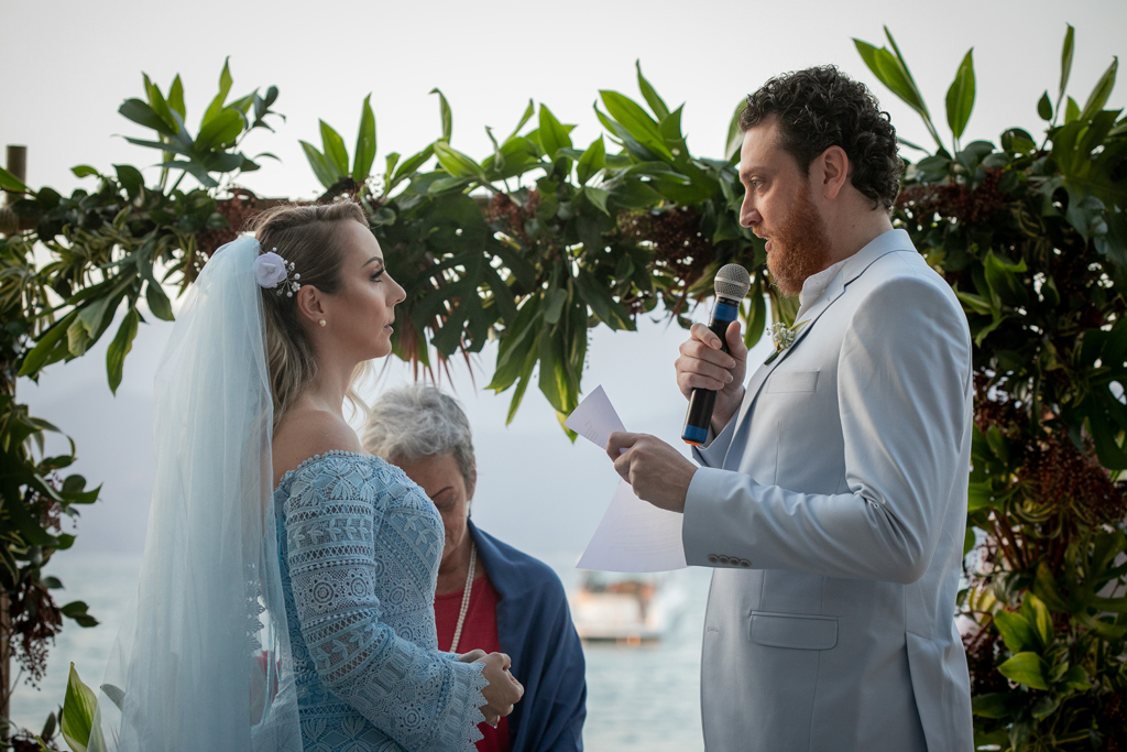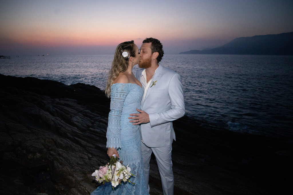 A troca de alianças aconteceu em Ilhabela, litoral norte de São Paulo. A Ilha é um dos meus destinos favoritos para casar com vista para o mar.