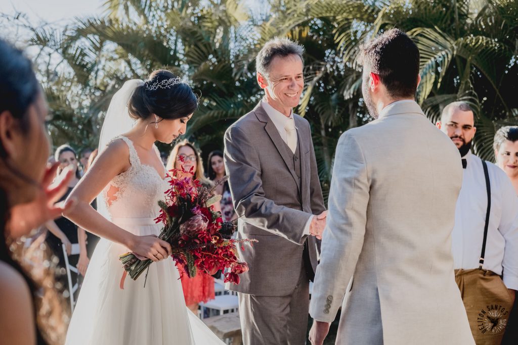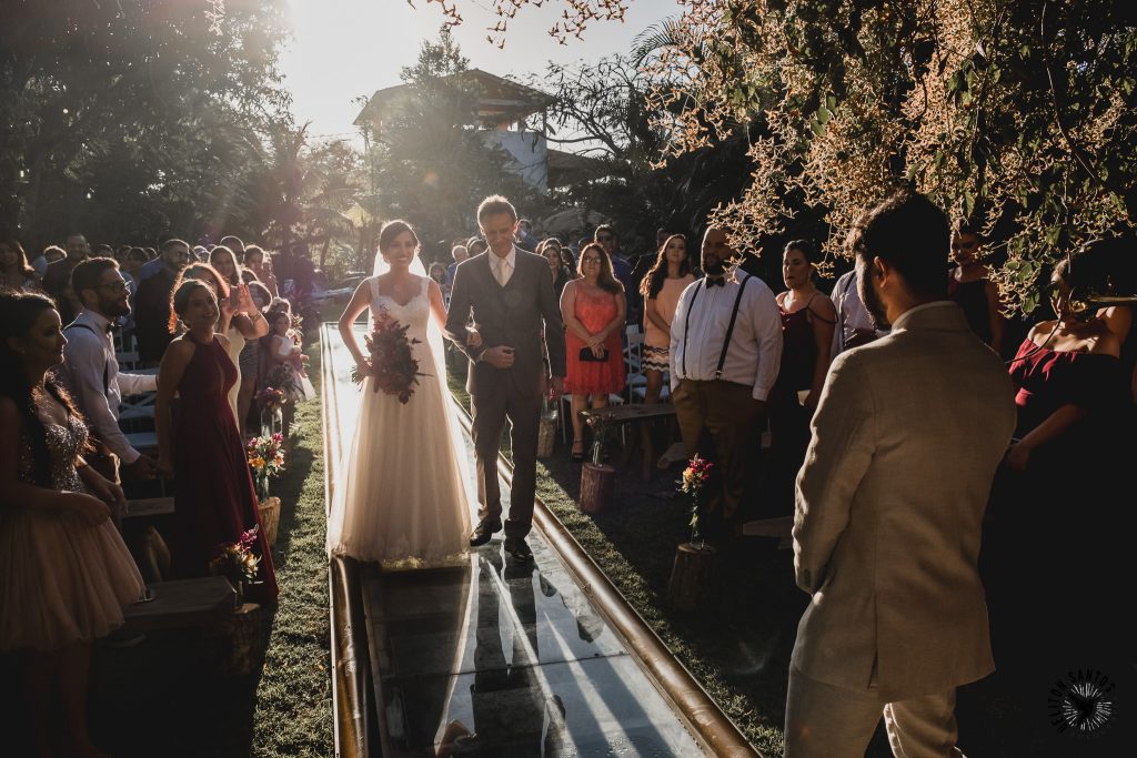 Lais e Douglas optaram por comemorar o enlace com cerimônia ao ar livre no fim da tarde, tudo no melhor estilo rústico e com toques de marsala.