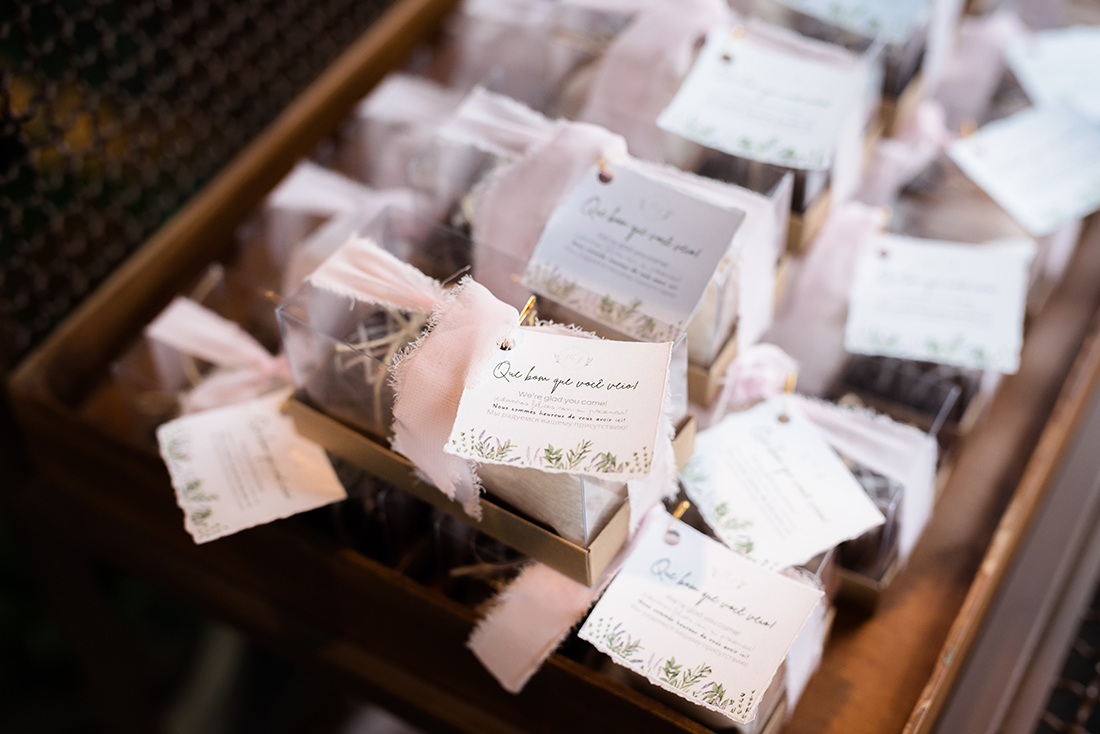 – Tivemos amigos muito queridos vindo de diversos países pra fazer parte dessa celebração (Argentina, Canadá, França, Inglaterra e Rússia). Com isso, criamos tags para as lembrancinhas agradecendo a presença dos nossos convidados usando idiomas de todos os países aqui listados. Foi um mini gesto de carinho pra reconhecer o esforço que fizeram pra estar aqui conosco.