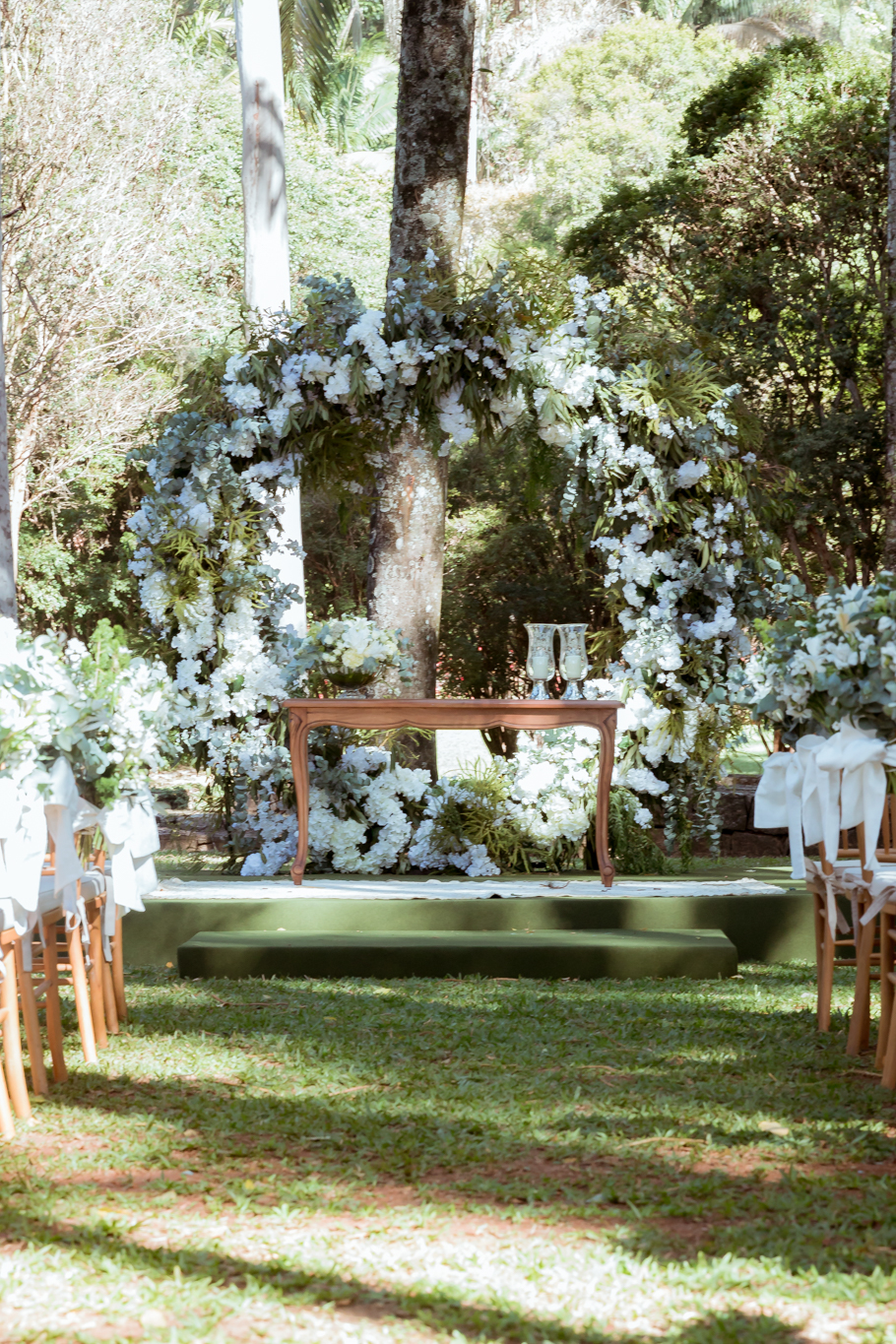 A pegada natural criada para a troca de alianças, com direito a arco de flores e arranjos delicados, é ideal para o ambiente bucólico da fazenda, reforçando o clima de casamento no campo.