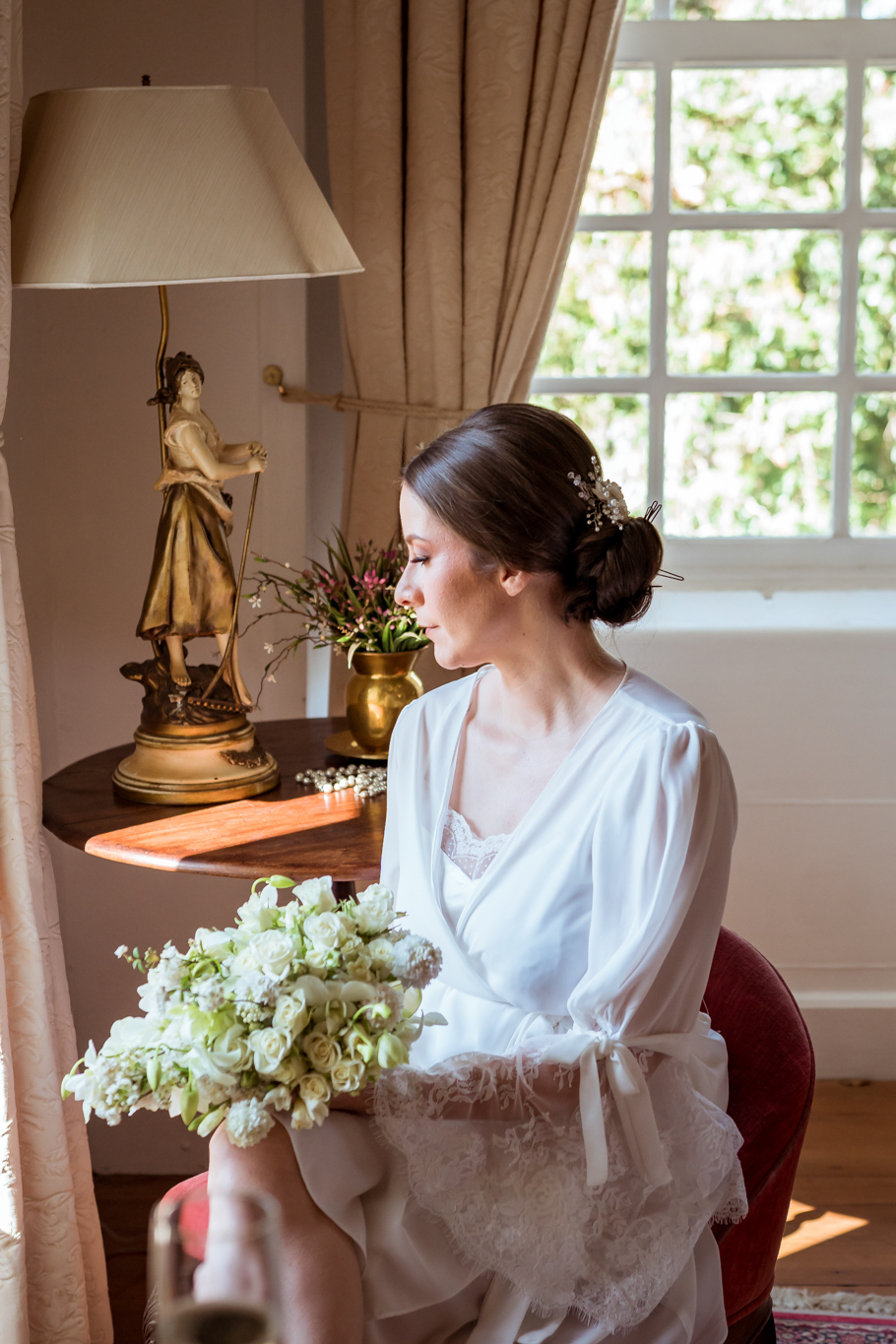 Para completar, coque baixo e buquê com flores brancas. Elegante e ideal para casar ao ar livre.