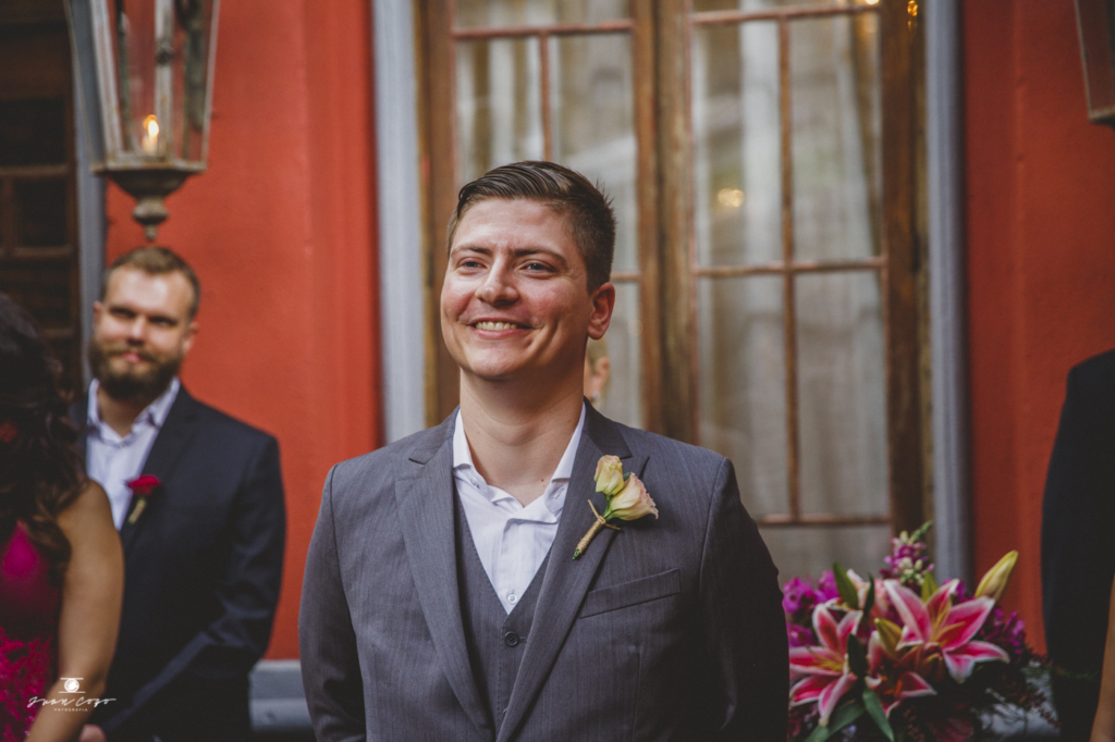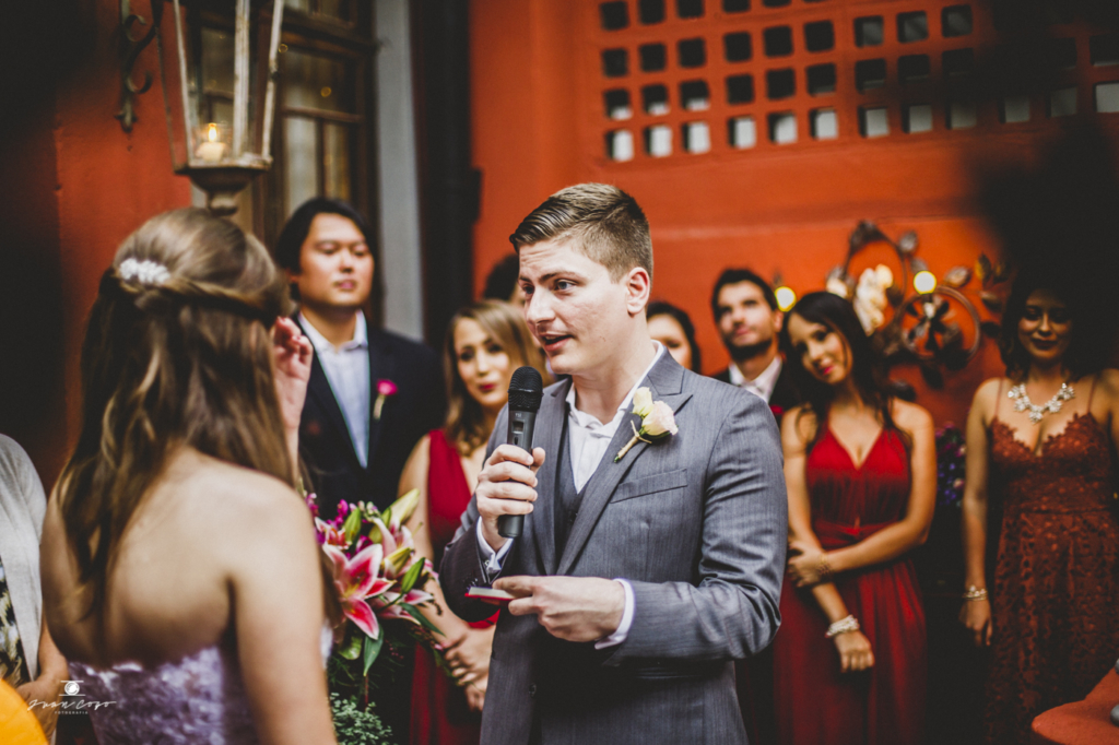 Tivemos apenas um probleminha com o buquê, o que acabou atrasando o início do evento, mas o Cícero foi fofo e no fim ficou tudo bem. Com o atraso, o pessoal do Espaço serviu salgadinhos para os convidados e deixou todo mundo confortável. Foi ótimo!”.