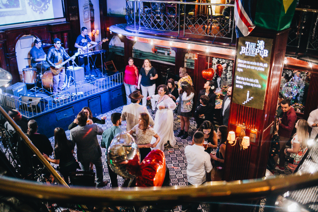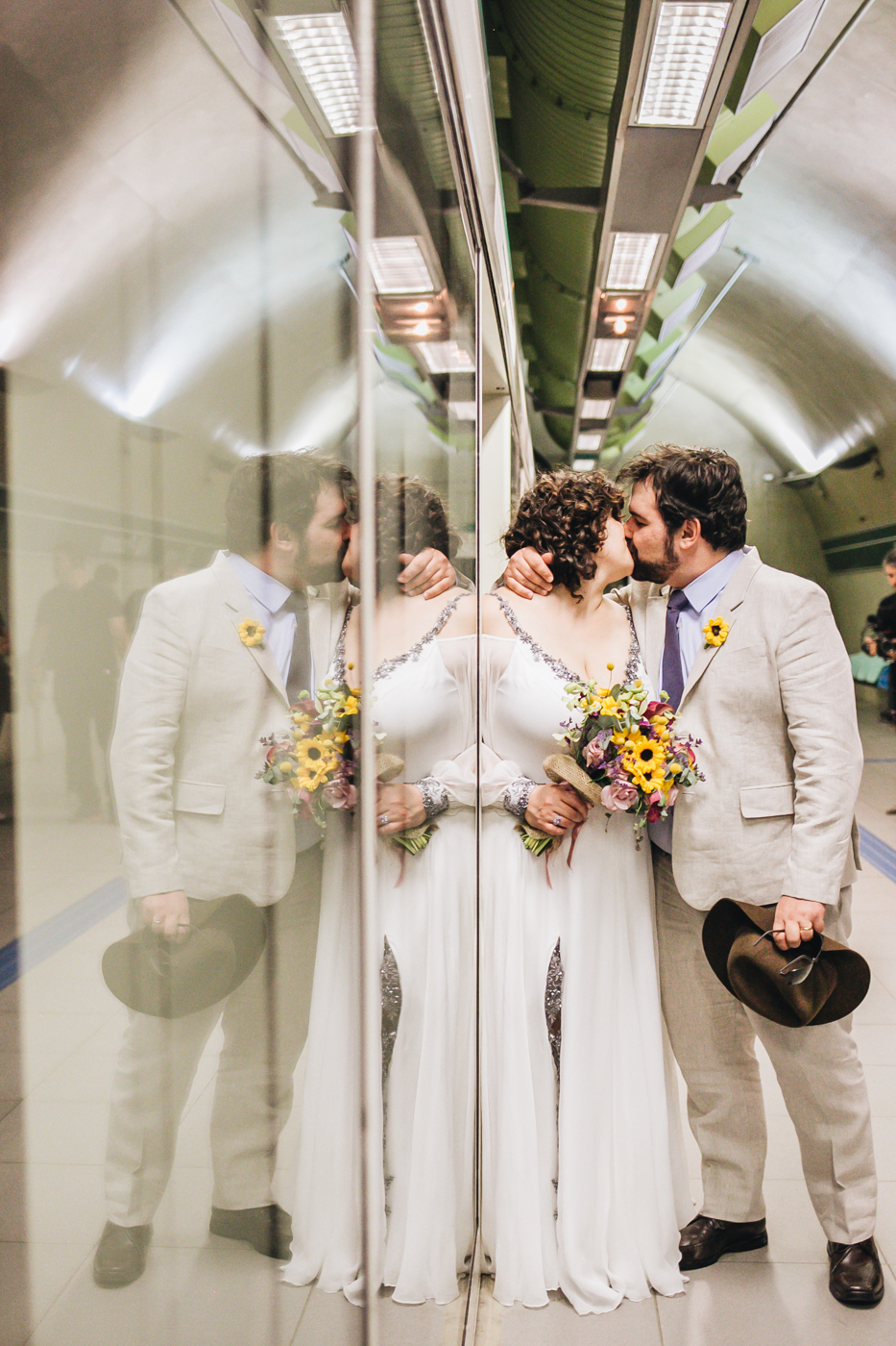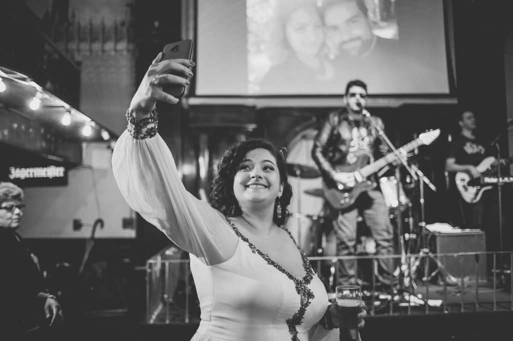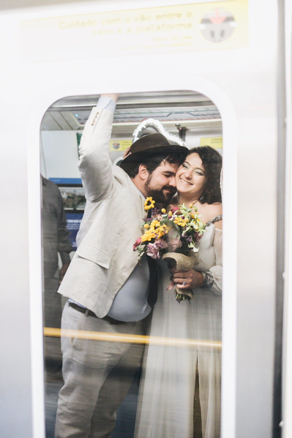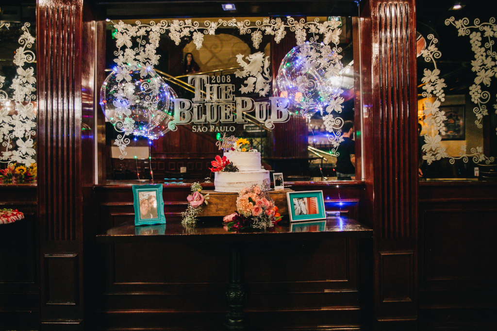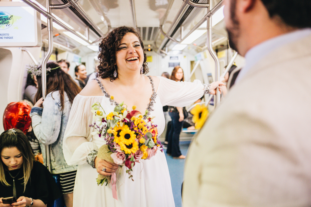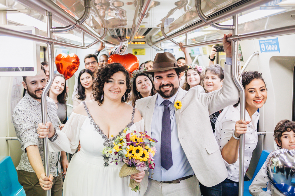 “Pensamos em fazer algo diferente: um almoço no salão do prédio para os pais, padrinhos e alguns familiares mais próximos, e depois comemorar com todos os amigos e o resto da família em um Pub. Para dar mais emoção, resolvemos ir de metrô, já que é o nosso meio de transporte diário e que ficava mais prático para todos irmos juntos.