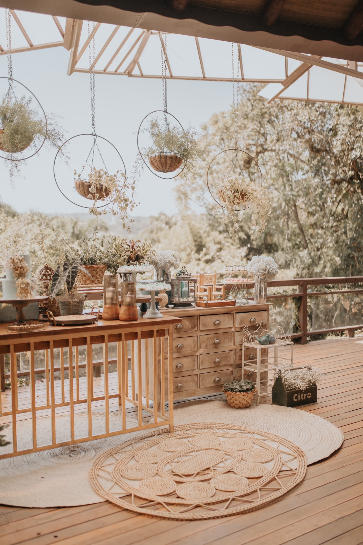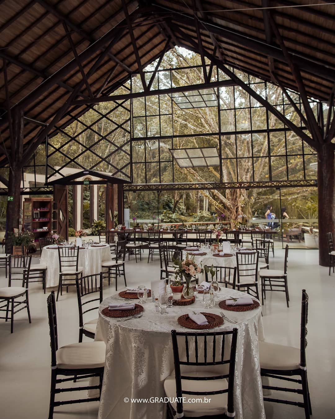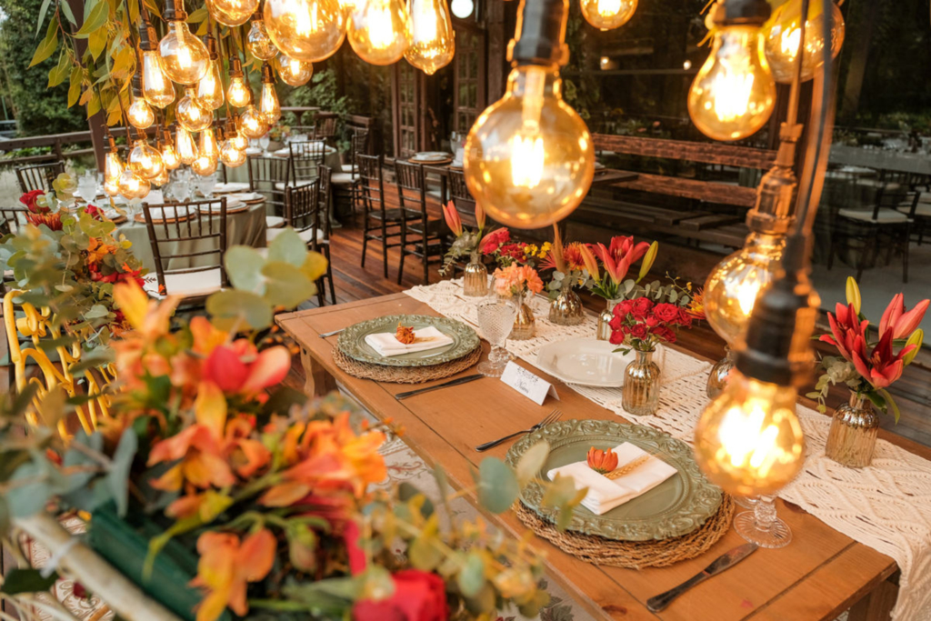 Ao destacar materiais como madeira e vidro, o espaço demonstra extrema versatilidade. Como resultado, é um cenário e tanto para as mais diferentes festas, do clássico ao boho.