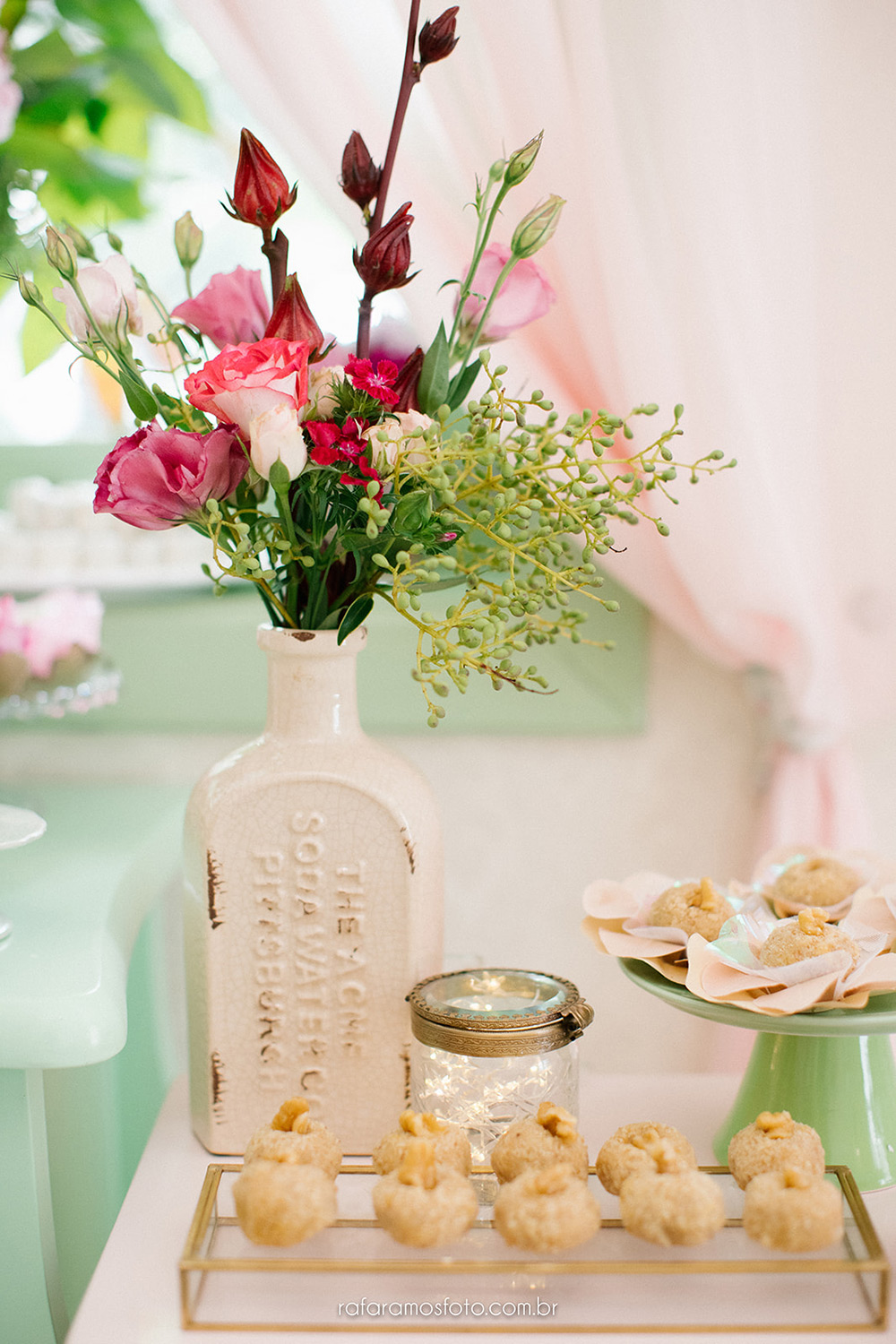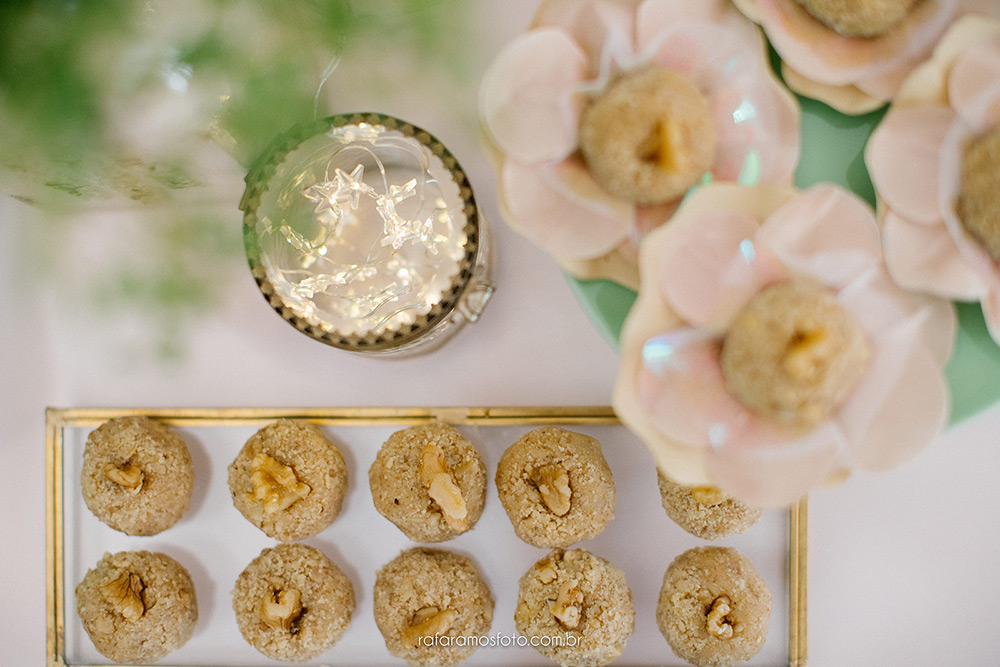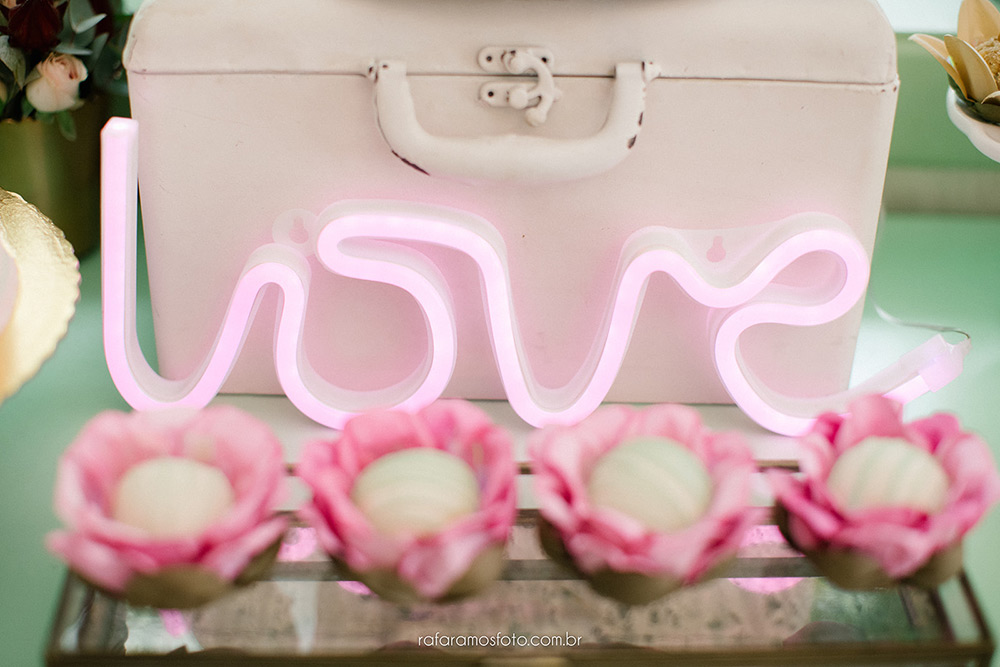 A mesa de doces ficou digna de Pinterest, cheia de flores, mimos, plaquinhas e até néon.