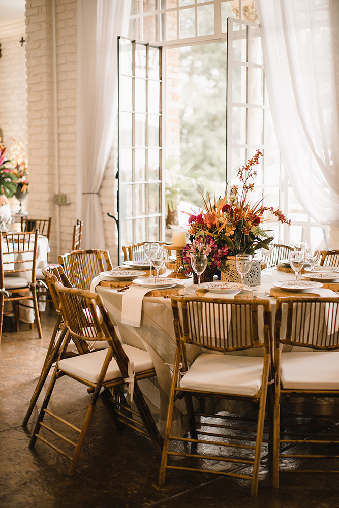 Outro destaque da produção exuberante no Château Du Plas foram as cores, sem contar as louças alegres e os arranjos com frutas. Decoração tropical para ninguém botar defeito!