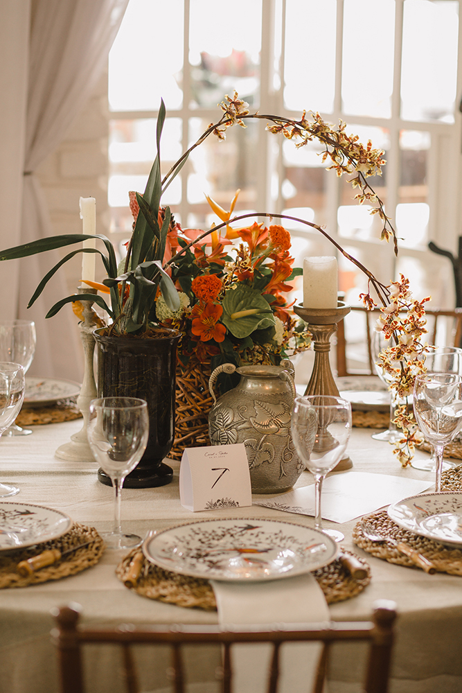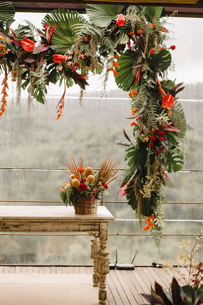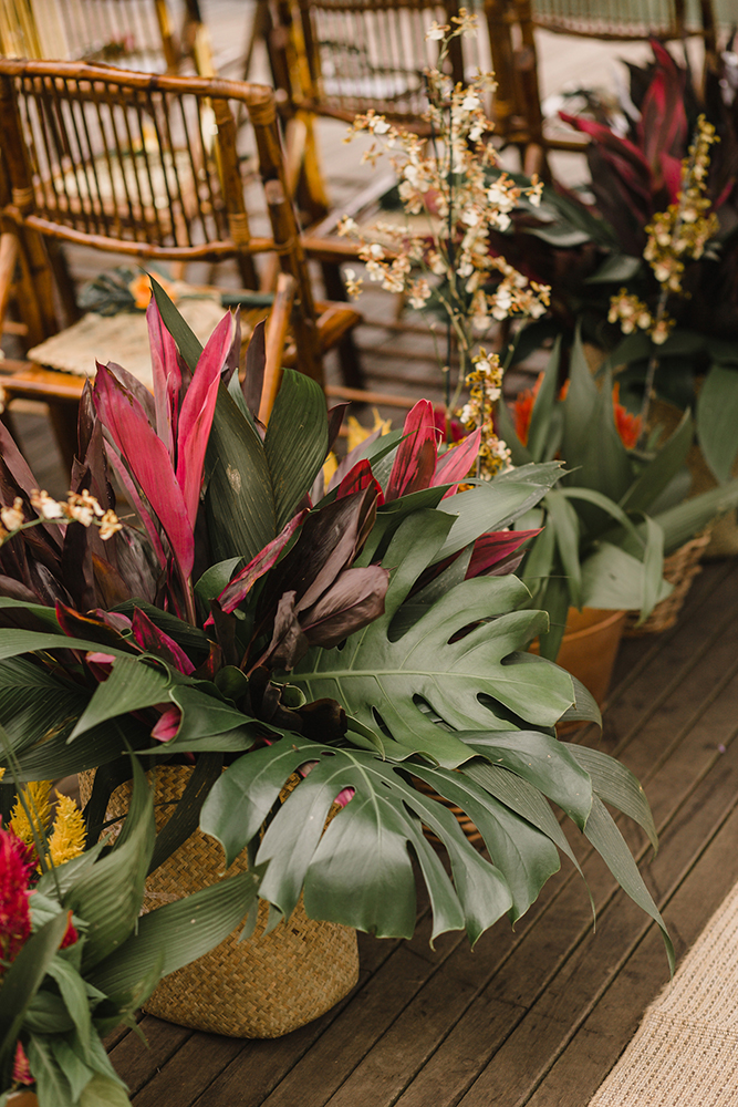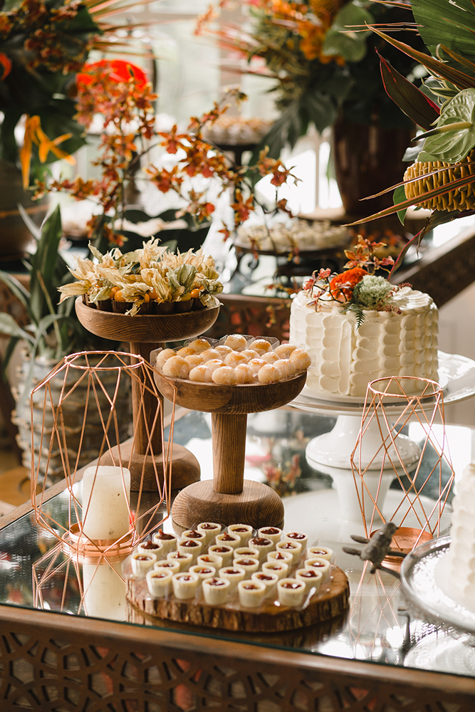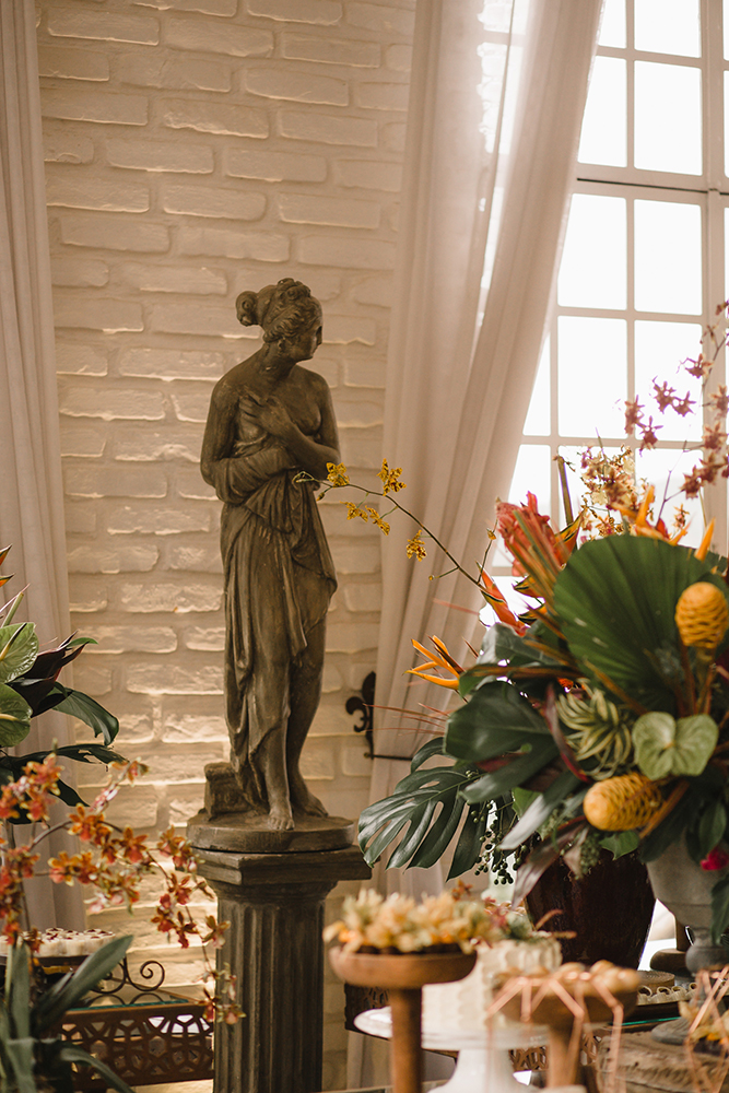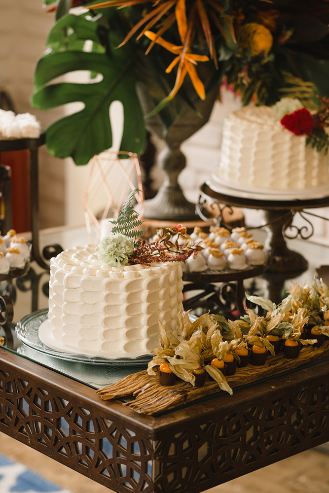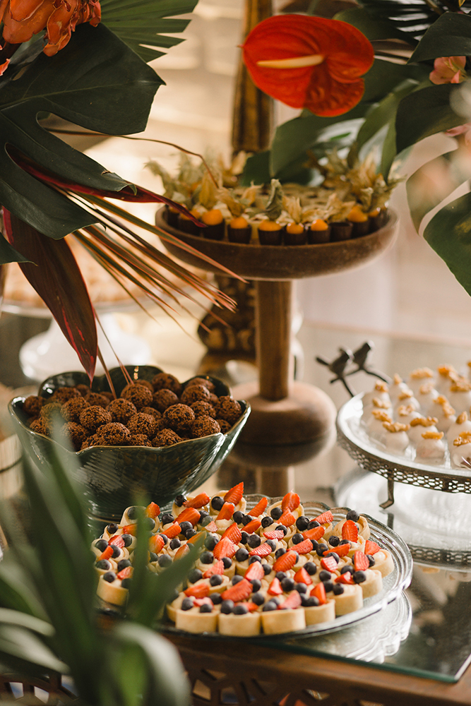 Assim, a mesa de doces abusou das flores exóticas, como o antúrio.