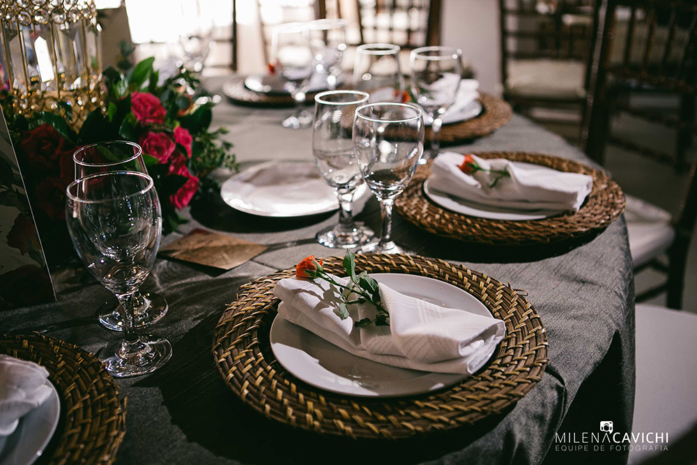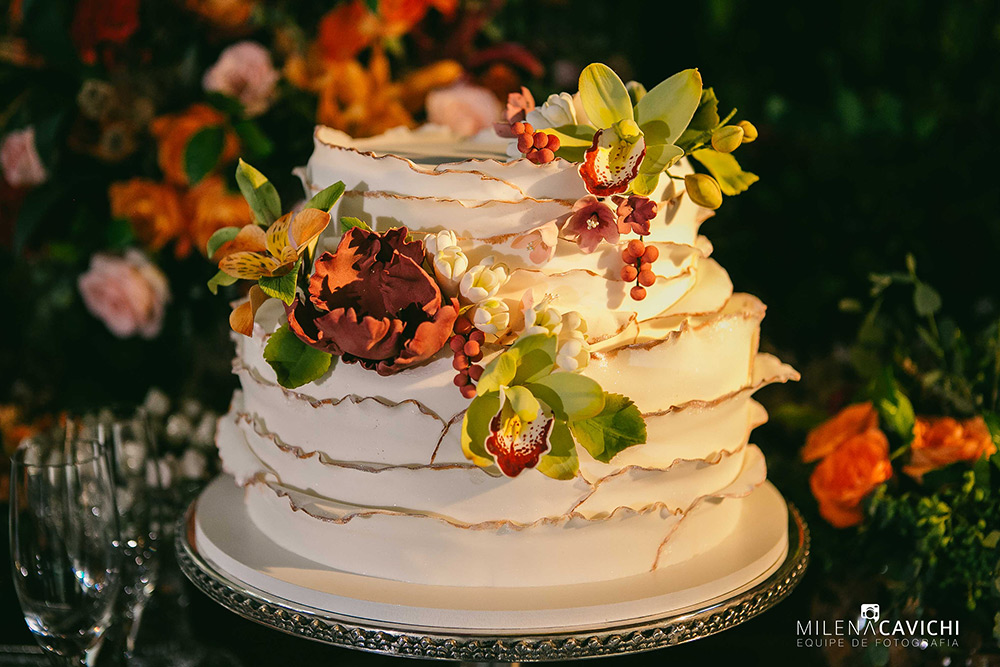 Como a arquiteta que existe em mim não me deixaria calada nem nesse momento, tive que me meter na decoração também. O Luciano e eu montamos uma dupla super criativa e até desenhei o projeto no AutoCAD (risos). Eu queria que tivesse muitos tons de marsala, rosa, laranja e roxo nas mesas dos convidados e mesa do bolo que, a propósito, foi totalmente assimétrica. Essa era uma das minhas exigências e ficou linda, com um lustre pendendo apenas de um lado da mesa, super harmônico com o restante dos elementos.