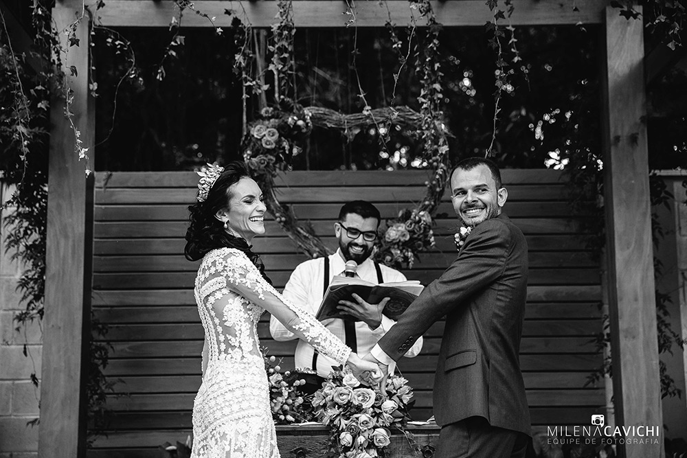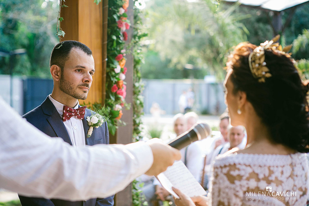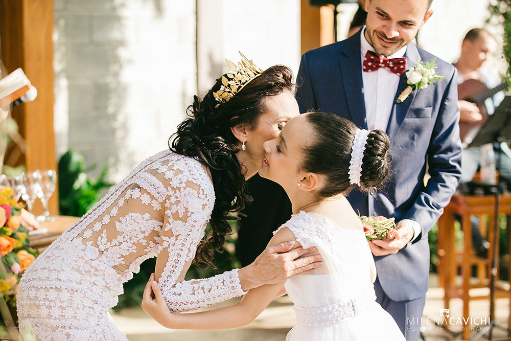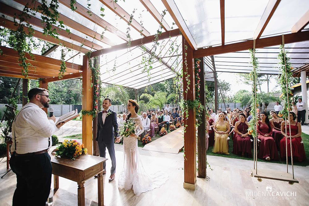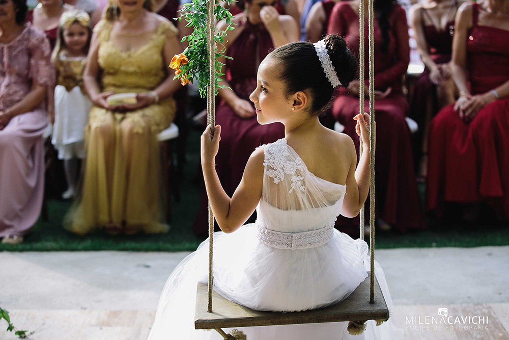 Eu queria uma cerimônia diurna, com muitas flores. Imaginava nossa filha em um balanço todo florido e delicado… Pensou que linda a Zara ficaria, levando as alianças e se tornando parte essencial do cenário? Ela chegaria com as alianças e ficaria lá na frente conosco. Tudo isso deu muito certo!