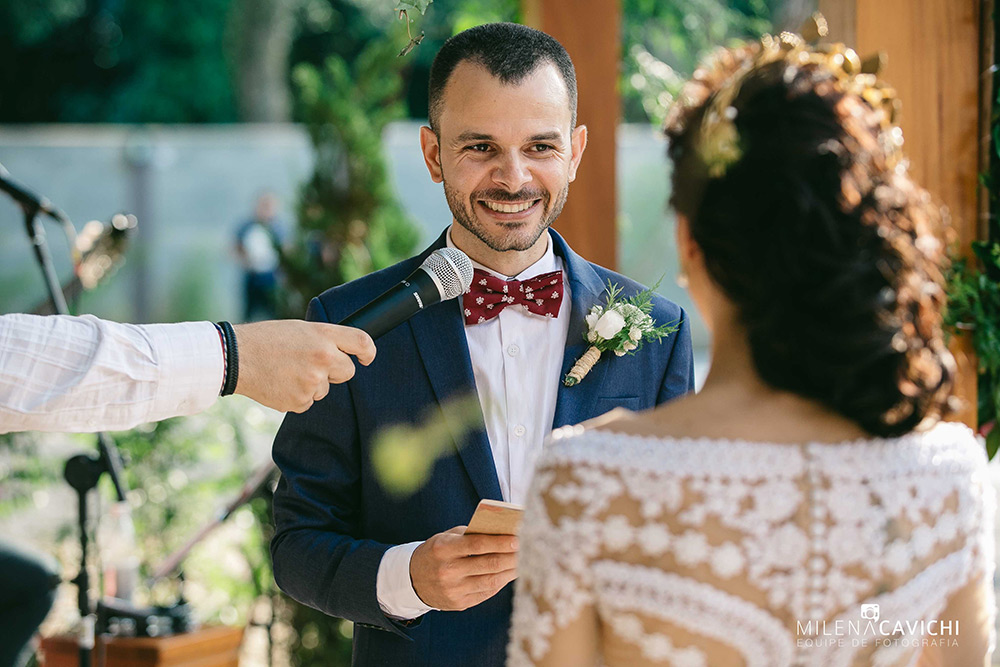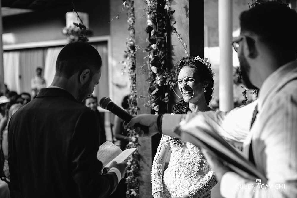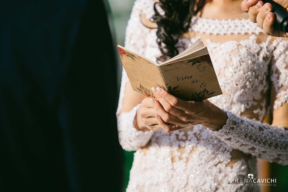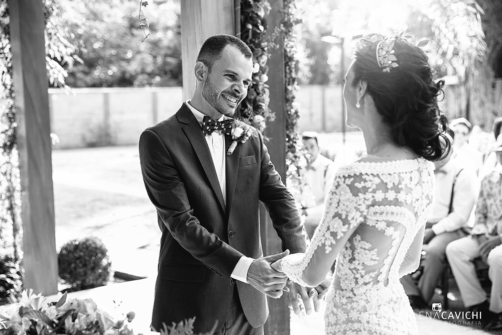 “Já trêmulo e transpirando de nervosismo no nosso dia, nada poderia ser mais marcante que ver a Ci chegar, a noiva. Aquele vestido expôs a personalidade daquela por quem me apaixonei. Ela estava realmente linda!