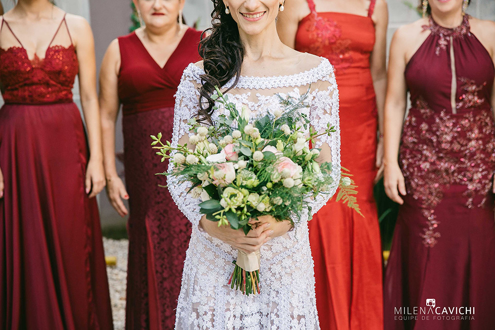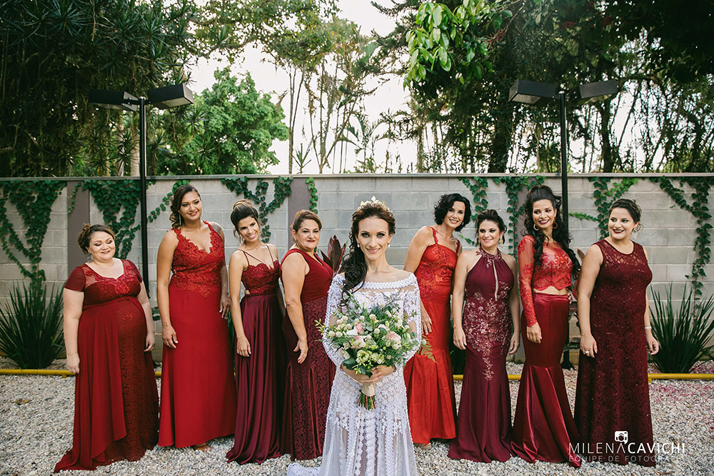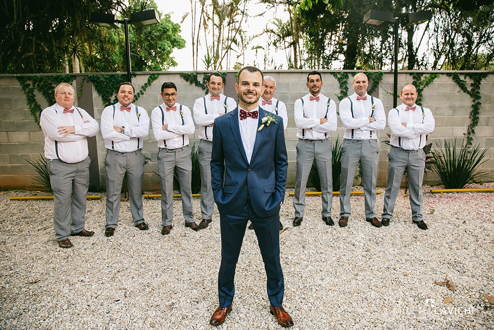 Outra coisa que queria muito era que as madrinhas e os padrinhos estivessem iguais, então presenteamos os padrinhos com uma gravata e a roupa deles teria um suspensório. Para as madrinhas, escolhi a cor marsala, mas elas ficaram livres para definir o tom e o modelo de vestido que quisessem. Nossa, todo mundo amou!