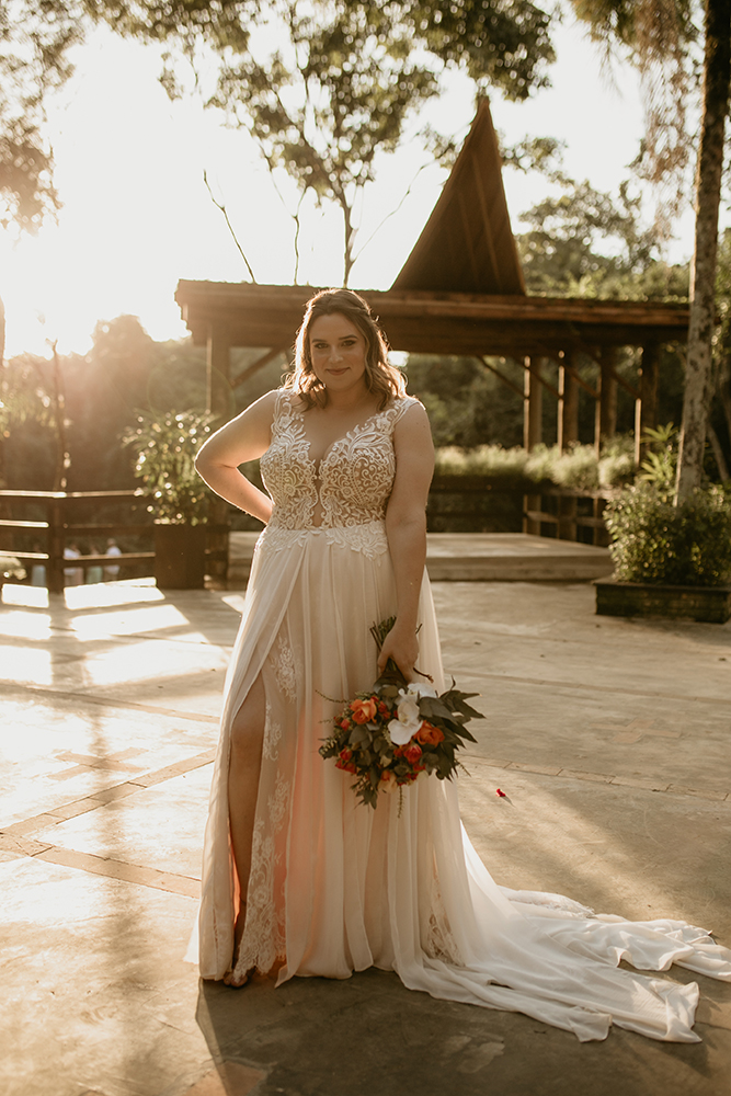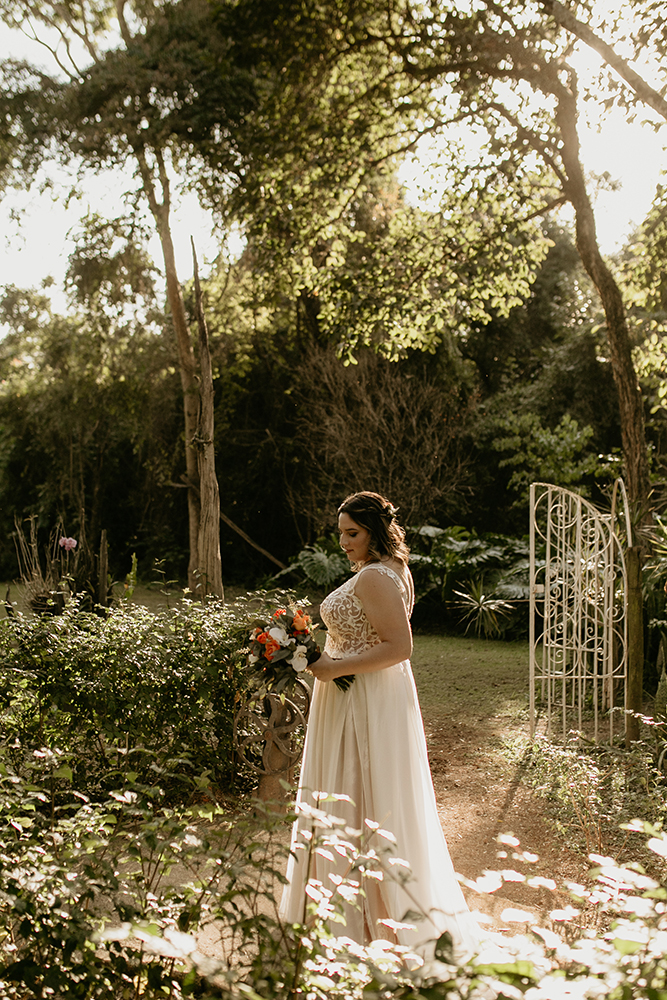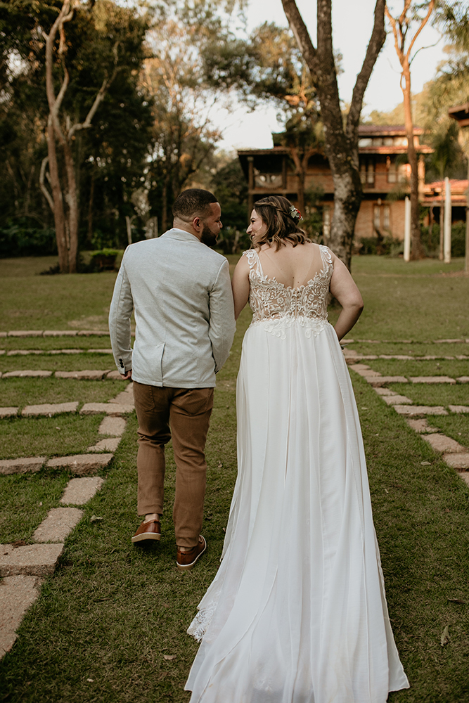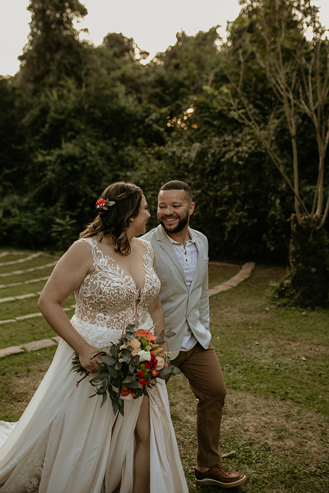 O vestido com corpo de renda, transparência e saia fluida caiu como uma luva, seguindo o estilo do casamento boho.