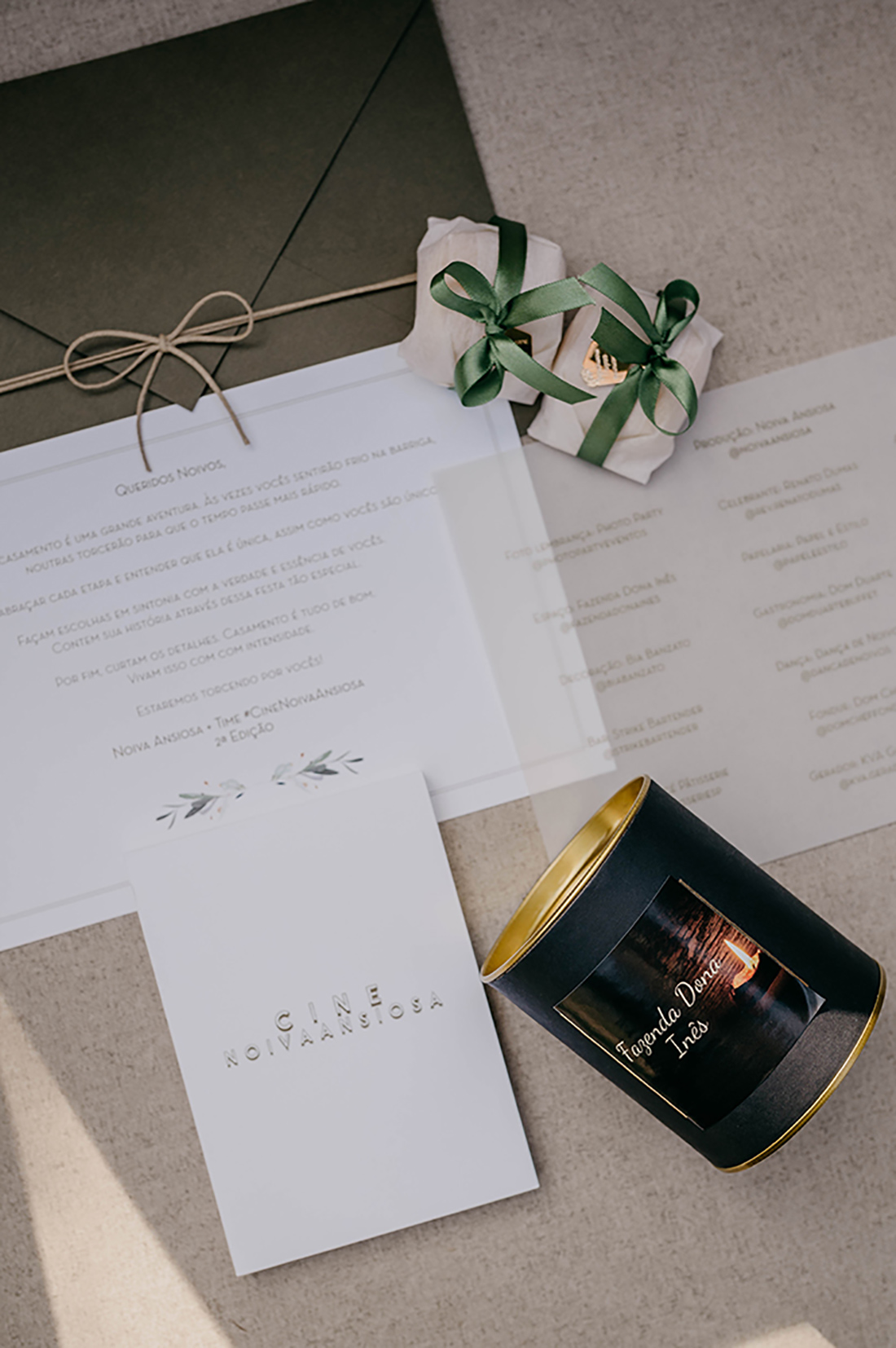 Produção: Noiva Ansiosa • Espaço: Fazenda Dona Inês • Buffet: Dom Duarte Buffet • Fotos: Victor Silverio Fotografia • Filme: Yellow Filmes • Bar: Strike Bartender • Música: Menegato Coral • Papelaria: Papel e Estilo • Carrinho gourmet: Dom Chef Fondue • Foto lembrança: Photo Party Eventos • Doces: Glace Patisserie • Celebrante: Rev. Renato Dumas • Dança: Dança de Noivos • Bem casados: Cleo Herreira Bem Casados • Metais personalizados: Via Trends • Decoração: Bia Banzato • Audiovisual: Smart Audio Pro • Assessoria: Carla Rossini • Gerador: KVA Geradores