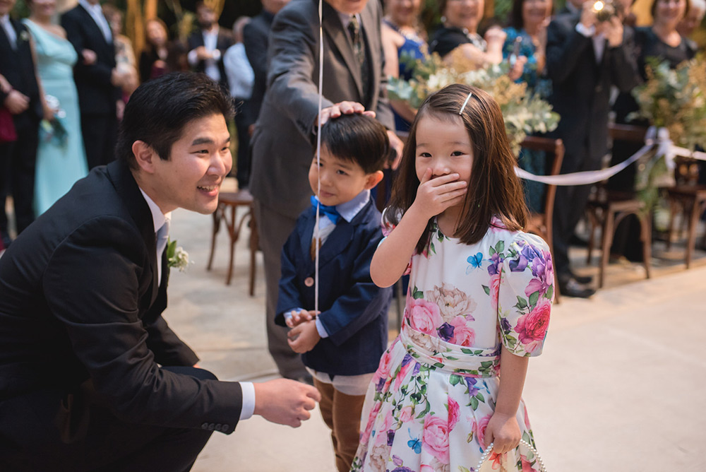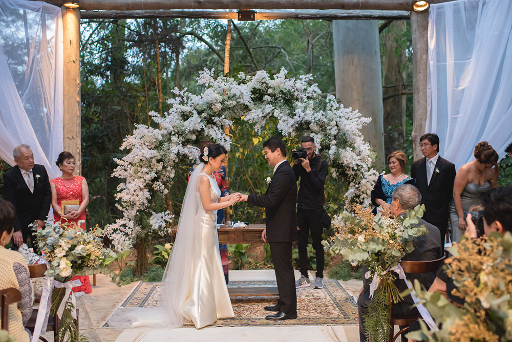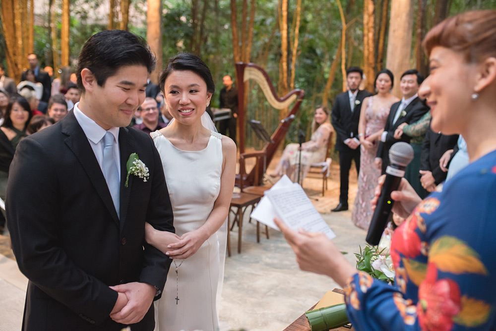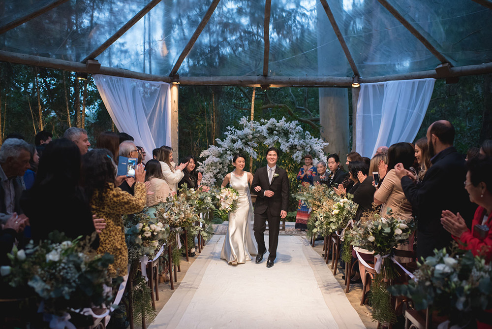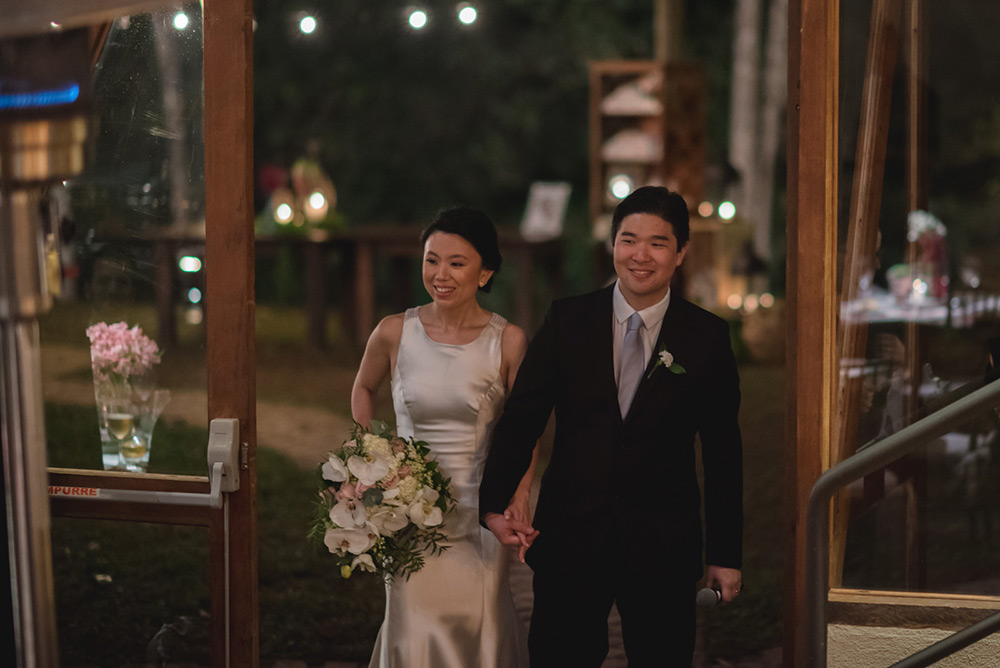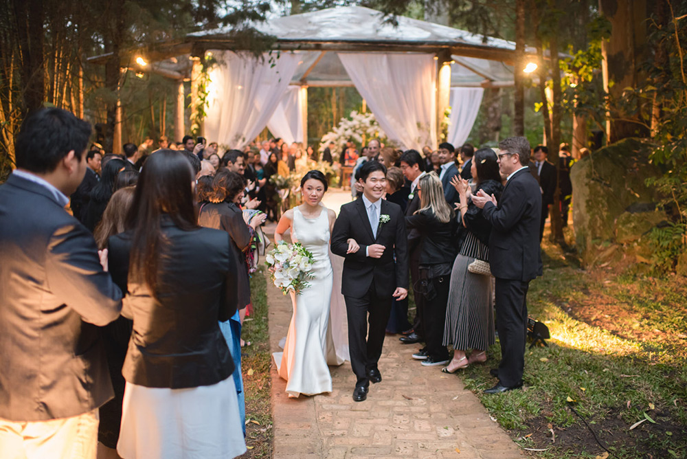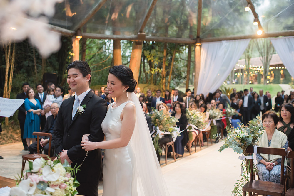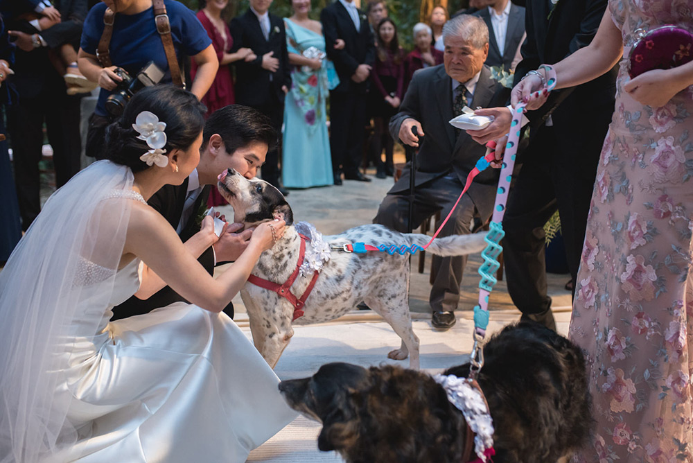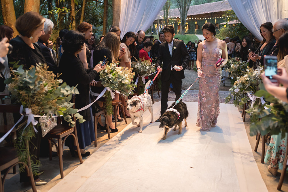 Orientais, fãs de pop e rock e apaixonados por cachorros, os noivos celebraram as afinidades com uma festa animada, incluindo pista cheia.