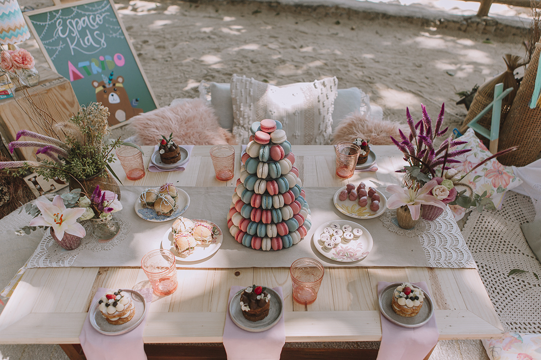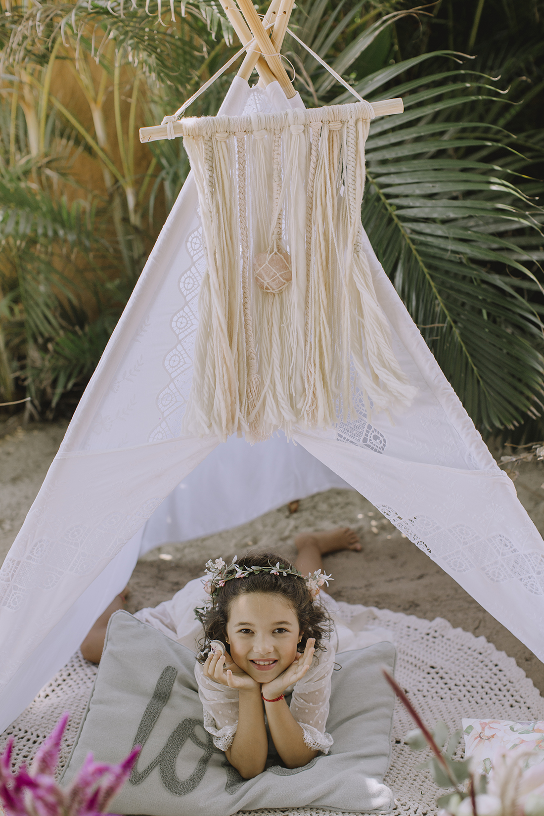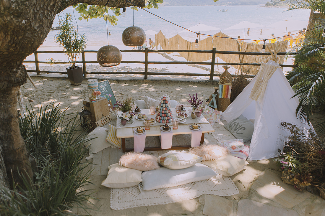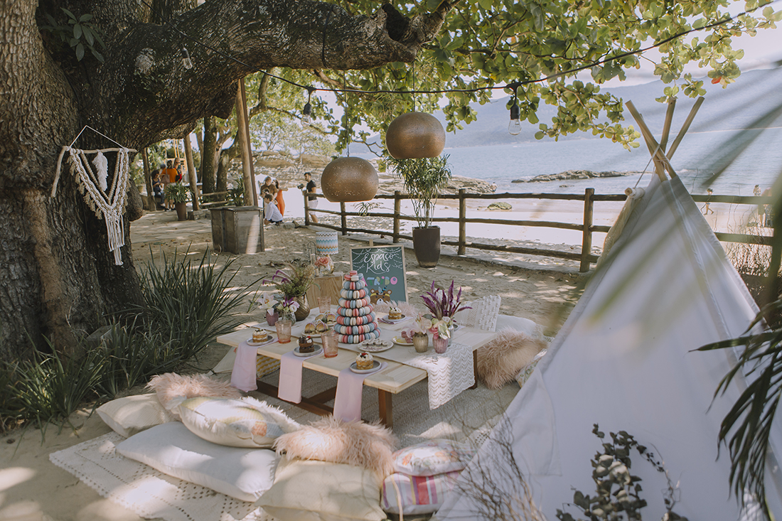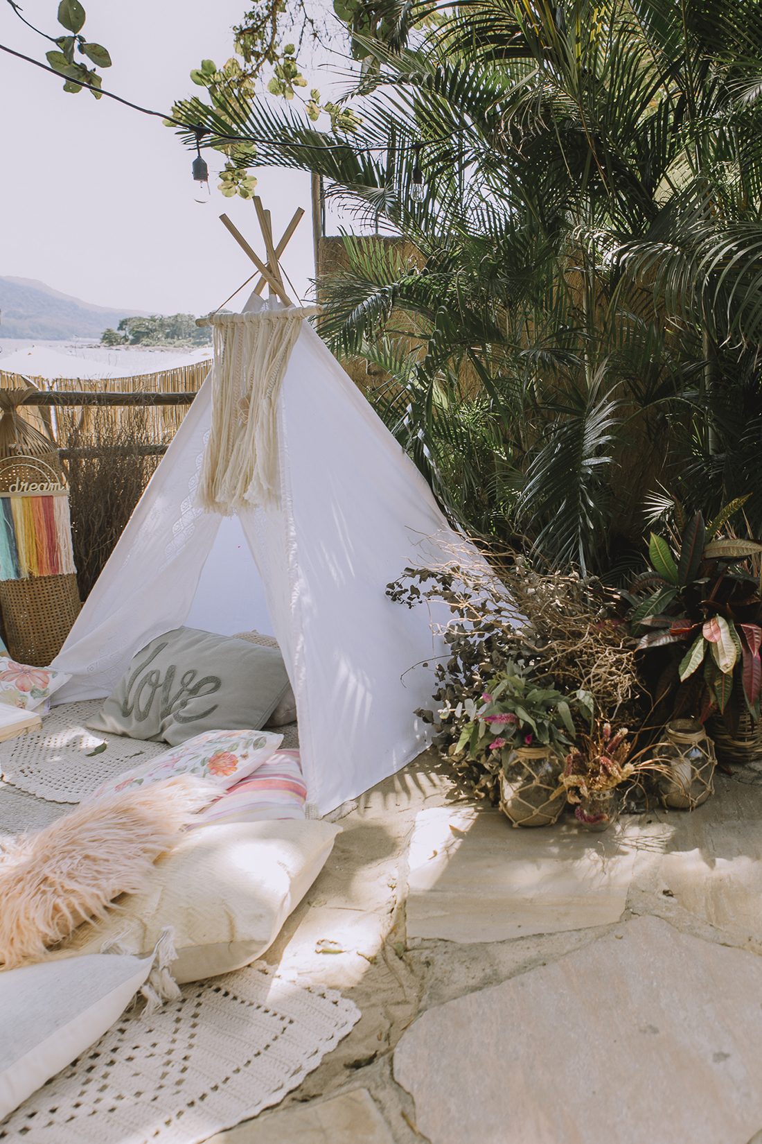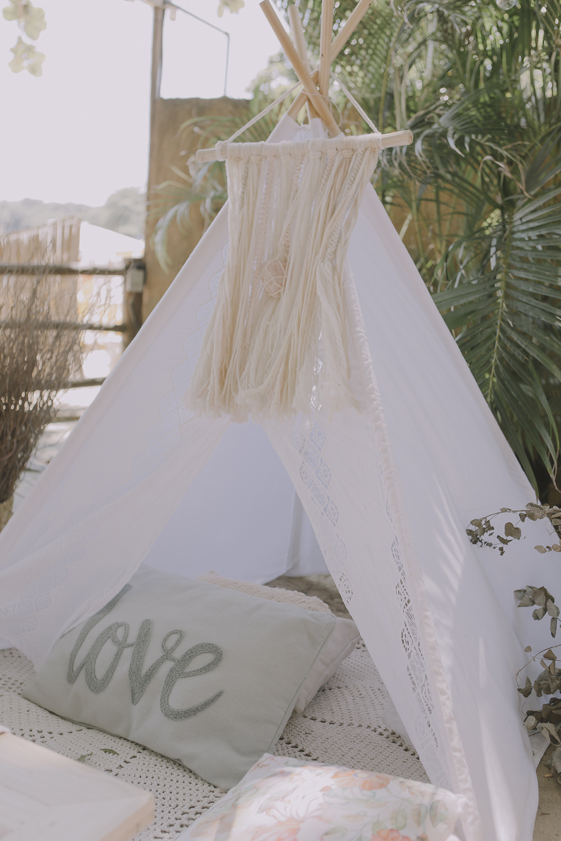 Só para ilustrar, as tradicionais cabaninhas, macramês, cestos, almofadas e outros detalhes não poderiam ser mais lúdicos e encantadores!