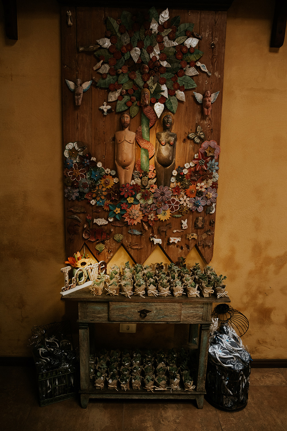 Voltando ao casamento, minha mãe montou todas as suculentas, que foram elogiadas demais, o Edu providenciou chapéu Panamá para todos os convidados e nós compramos as bebidas à parte, um pouco em SP e outras na Ilha.