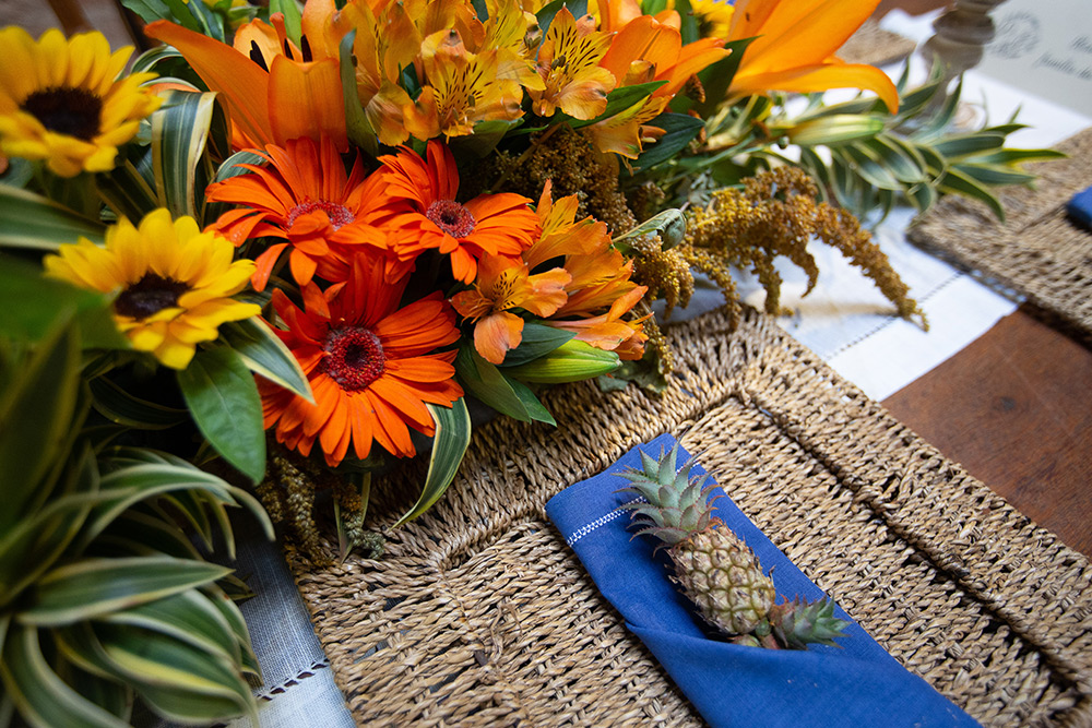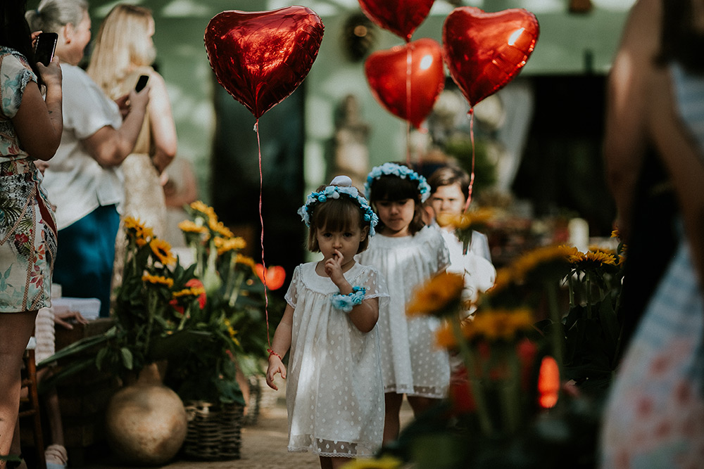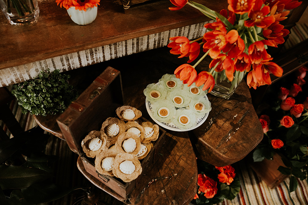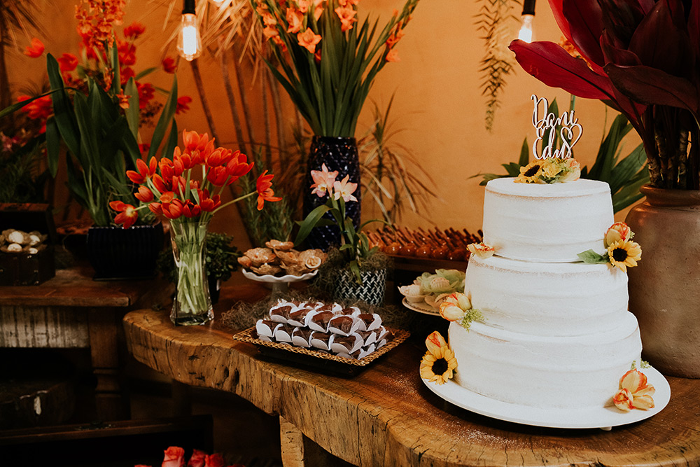 Eu amei o vestido de noiva, os girassóis na cerimônia, as tulipas alaranjadas na mesa de doces e as madrinhas em tons de azul.
