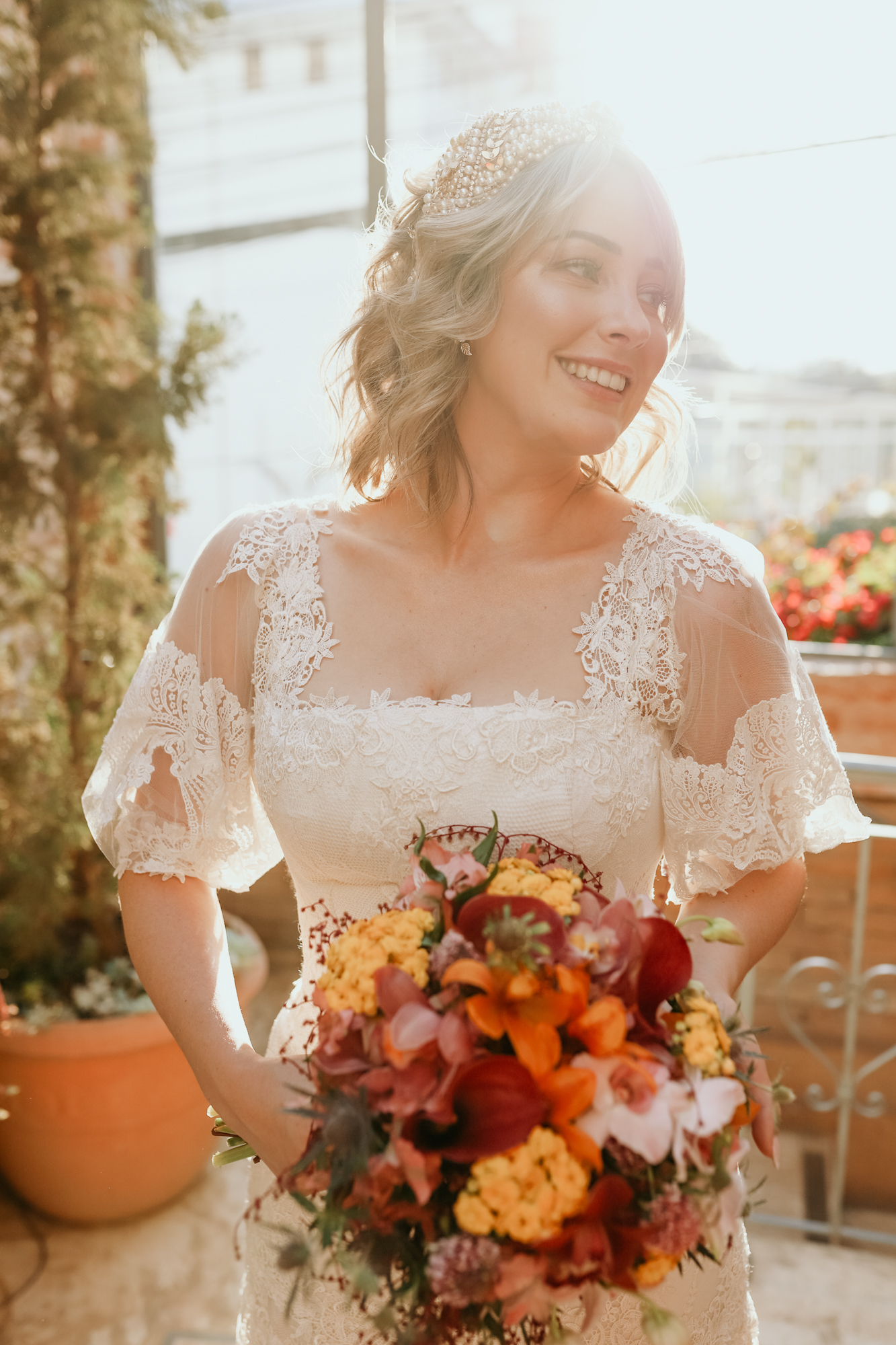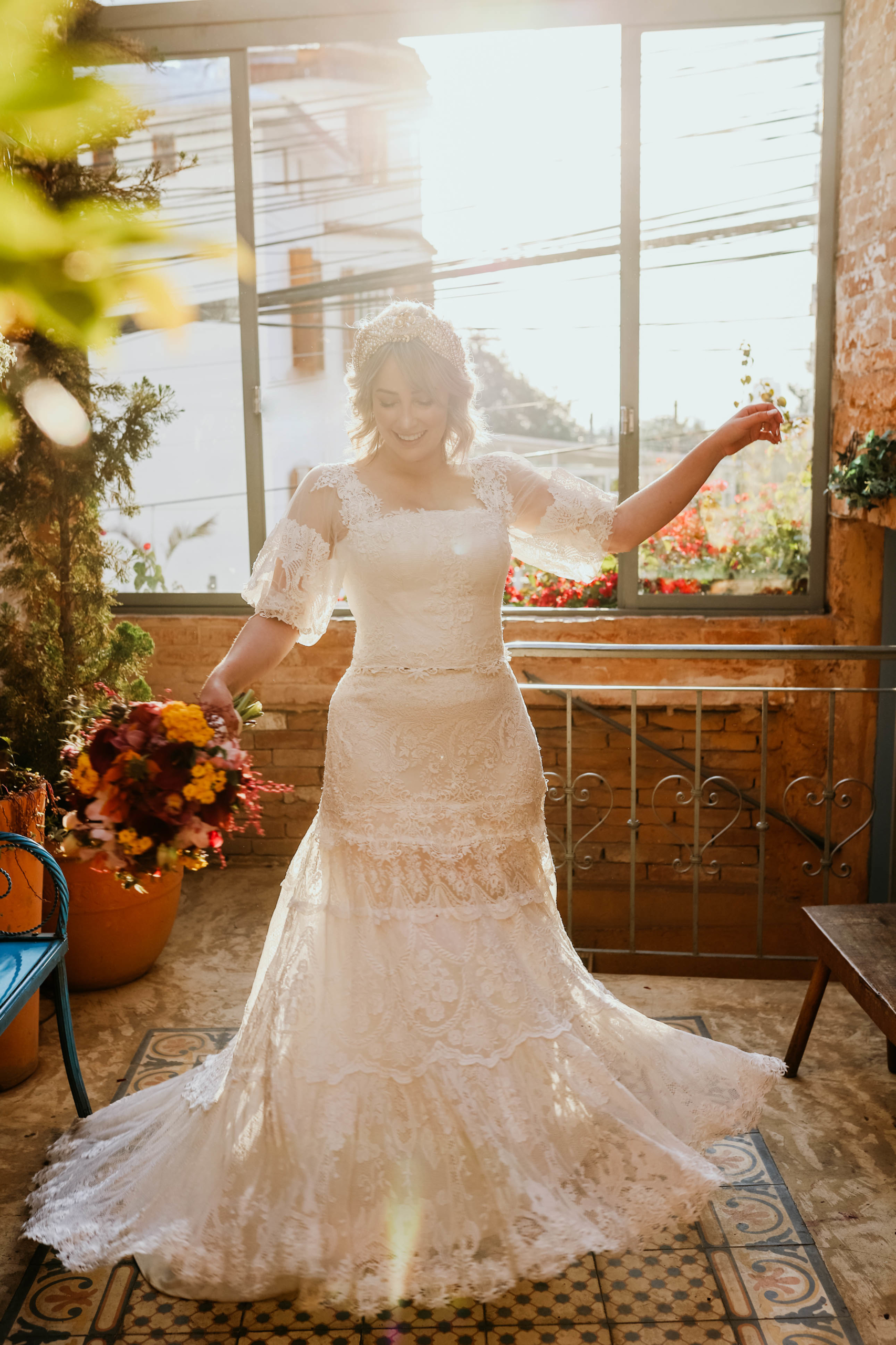 Com rendas, tule e mangas marcantes, o look é simplesmente perfeito, ainda mais em uma noiva tão plena como essa!
