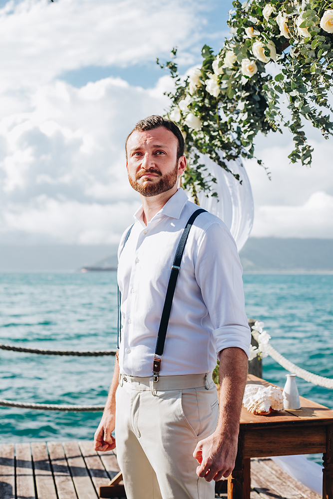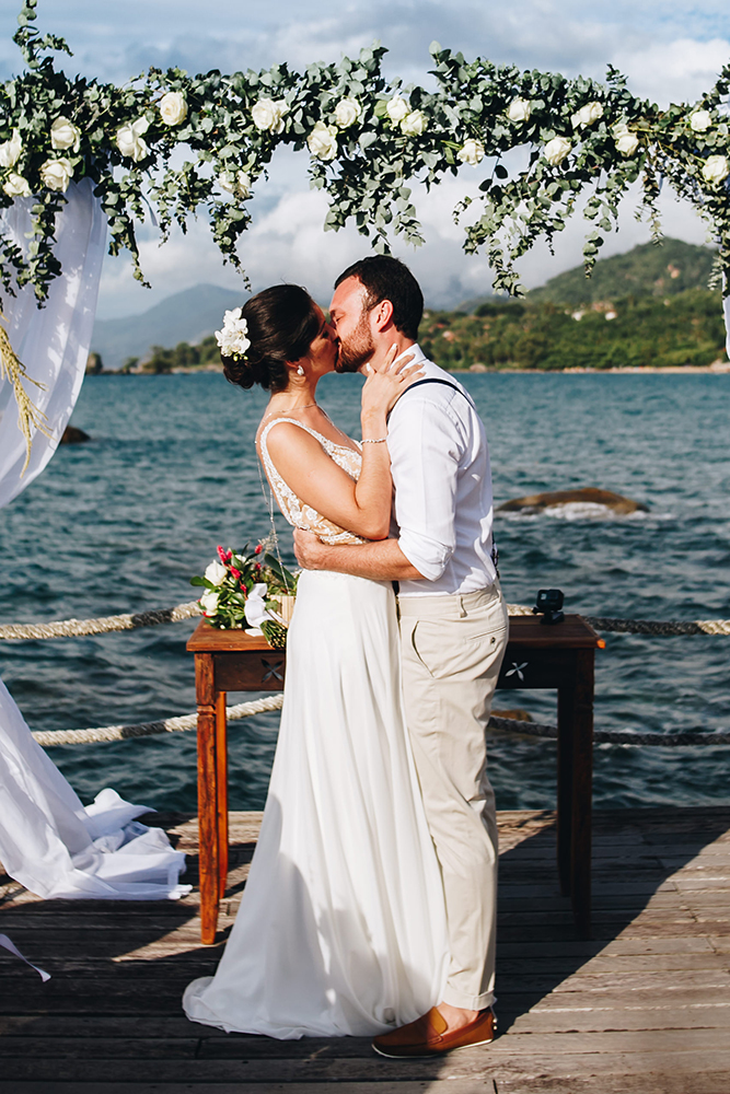 O casamento no píer, destacando o cenário e as belezas naturais de Ilhabela, não poderia ser mais leve e bonito!