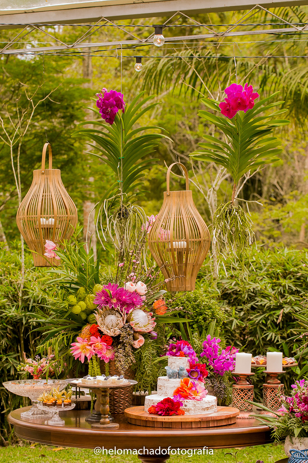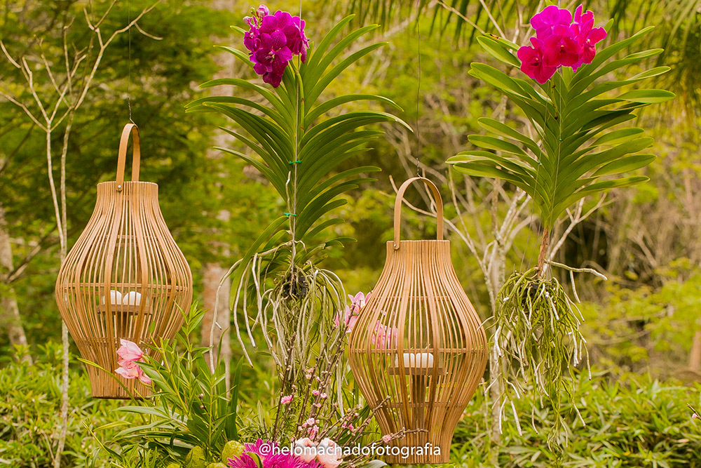 Flores exóticas foram usadas para o design floral, com técnica vertical e movimento. Protea King, Peônias, Lótus, Orquídeas, sementes e muitas outras flores transformaram o casamento em um verdadeiro jardim.
