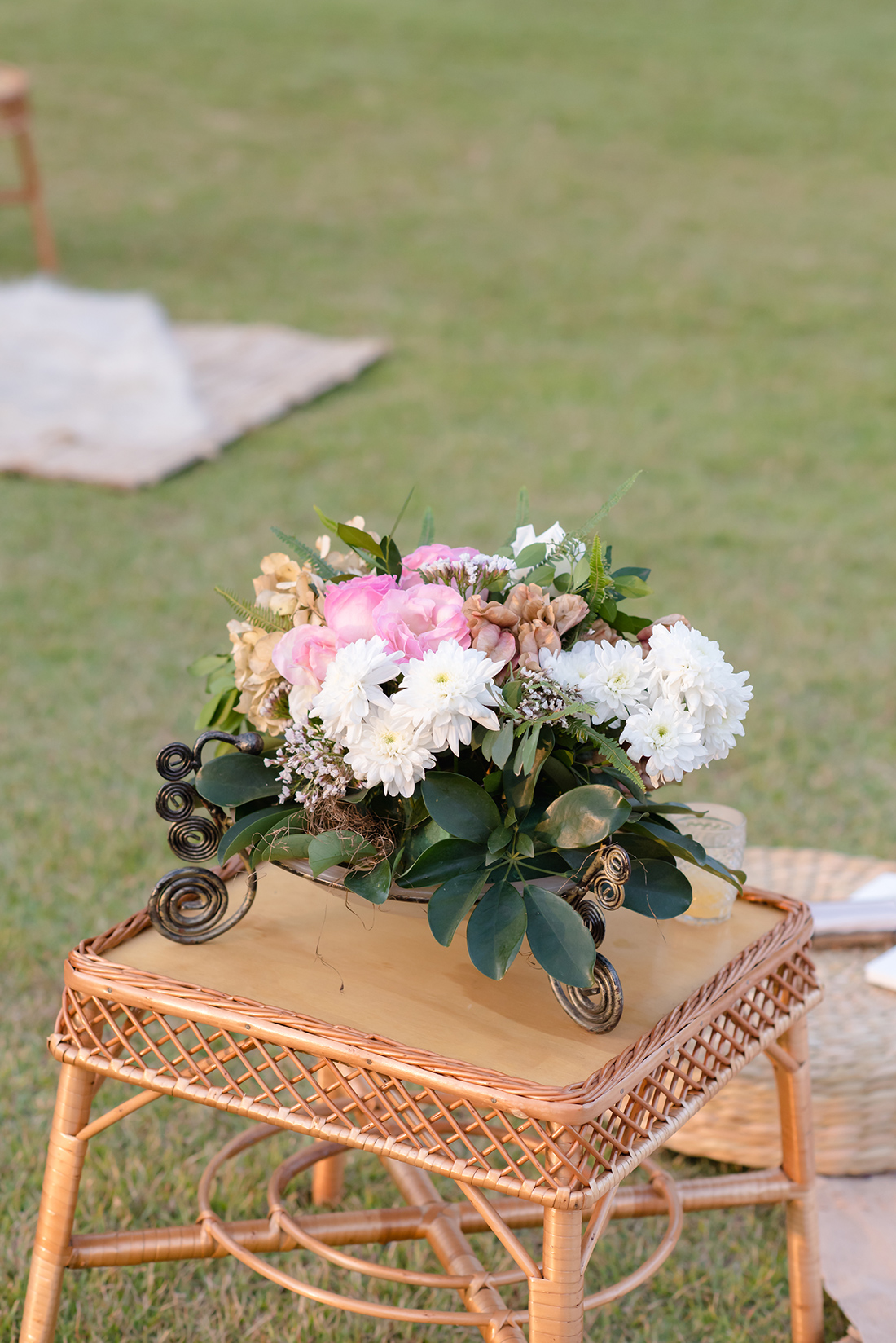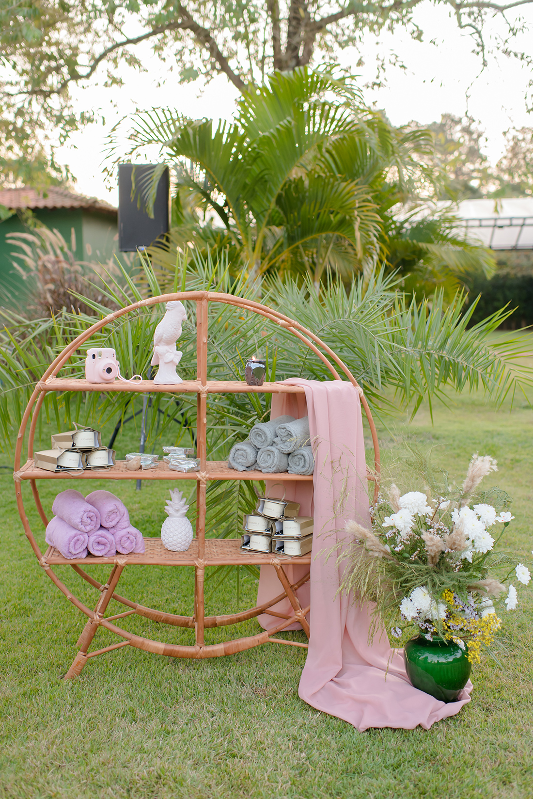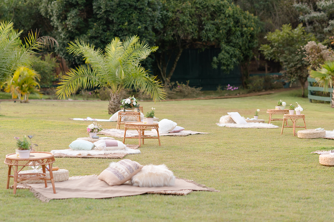 Os noivos e noivas foram recebidos no melhor estilo pic nic com decoração no gramado. Além da beleza da fazenda, boa música e detalhes carinhosamente elaborados.