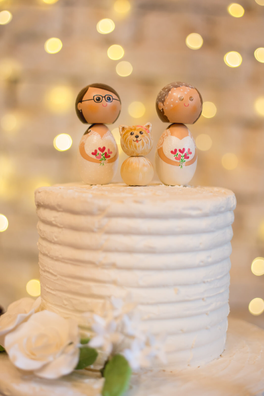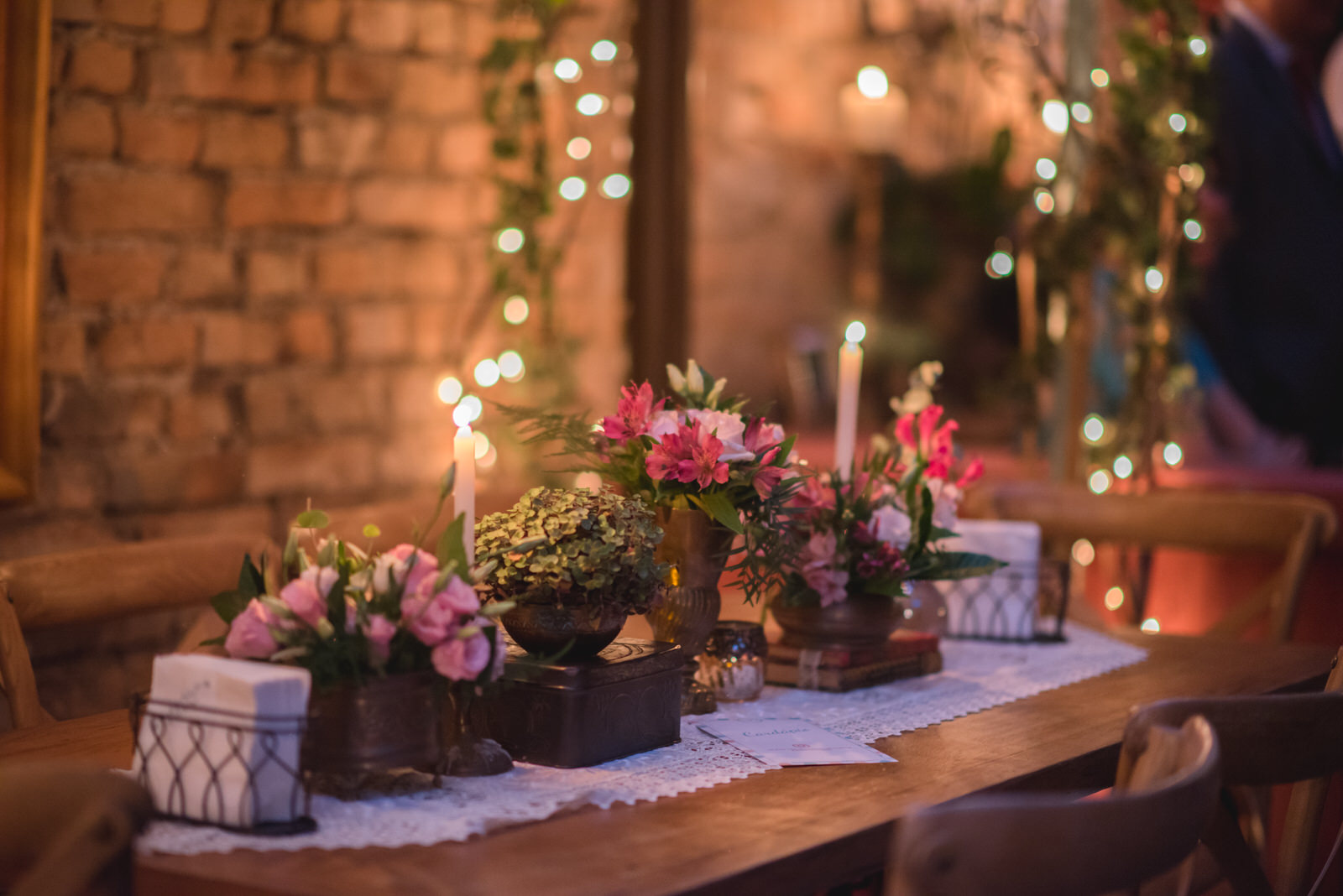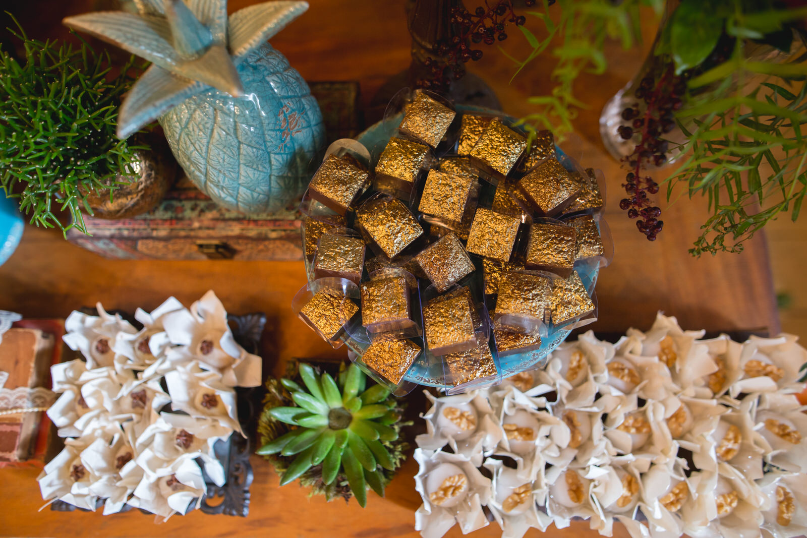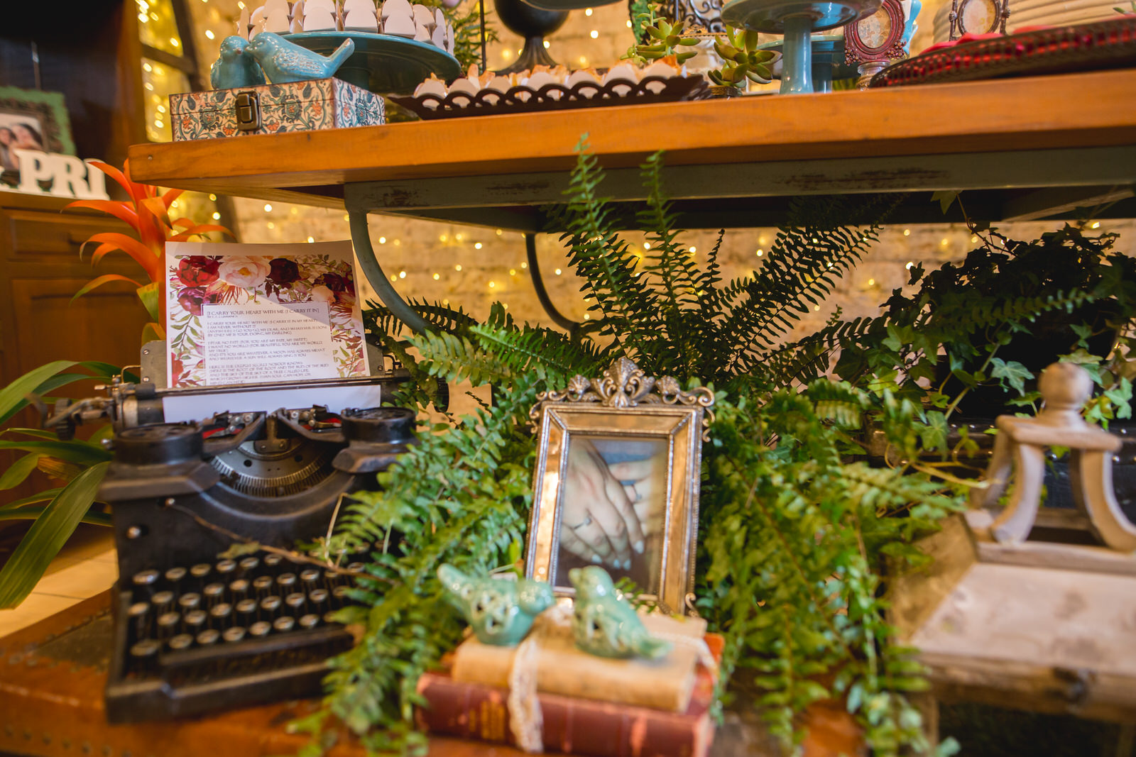 Além disso, fizemos questão de contratar uma celebrante que contasse de um jeito único nossa história e de chamar uma amiga nossa para participar da cerimônia, tornando a nossa celebração mais personalizada e especial. Nos esforçamos para que a decoração do evento retratasse nossos gostos e nossa história de vida: espalhamos muitas fotos nossas pelo Espaço Quintal (inclusive com nossos amigos e parentes), colocamos duas bonequinhas nossas vestidas com o uniforme de Hogwarts para lembrar nosso gosto conjunto pela série de livros do Harry Potter e incluímos um cantinho de homenagem para o pai da Camys, que faleceu no meio dos preparativos para o casamento (em março de 2017) e cuja presença foi certamente sentida por todos que estavam ali.