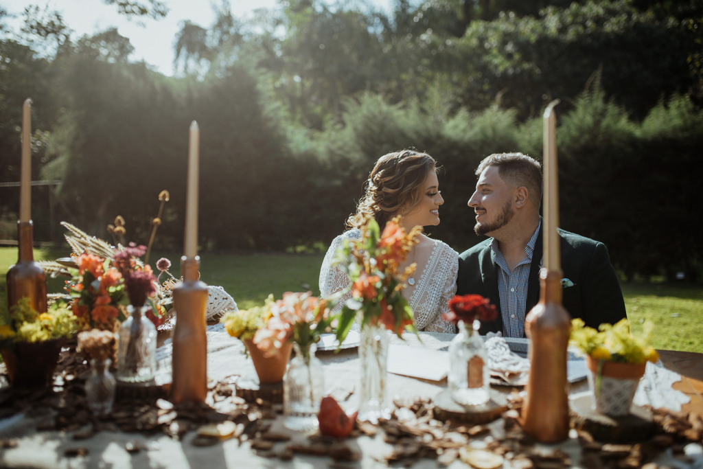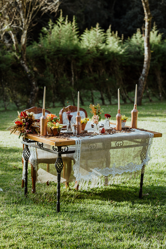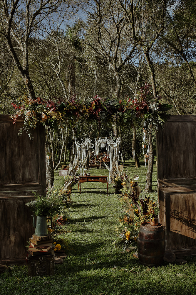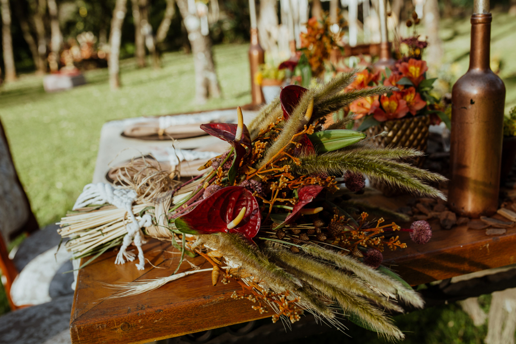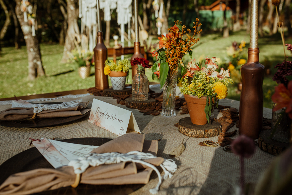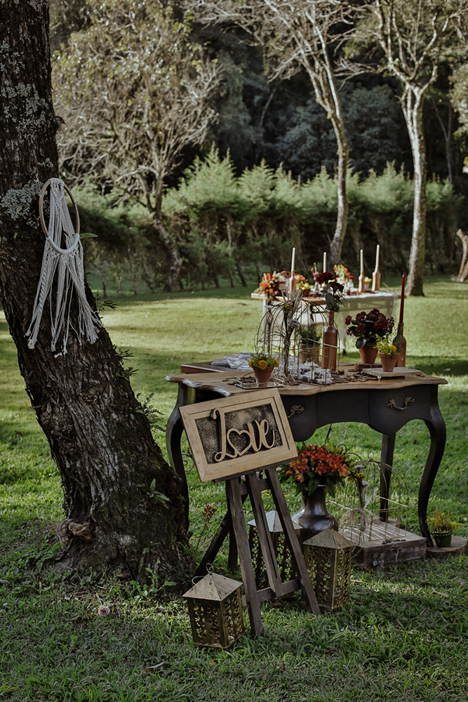 “O projeto Boho Love foi realizado no bosque do Espaço Ravena Garden. A proposta é mostrar um casamento no inverno, no estilo boho romântico.