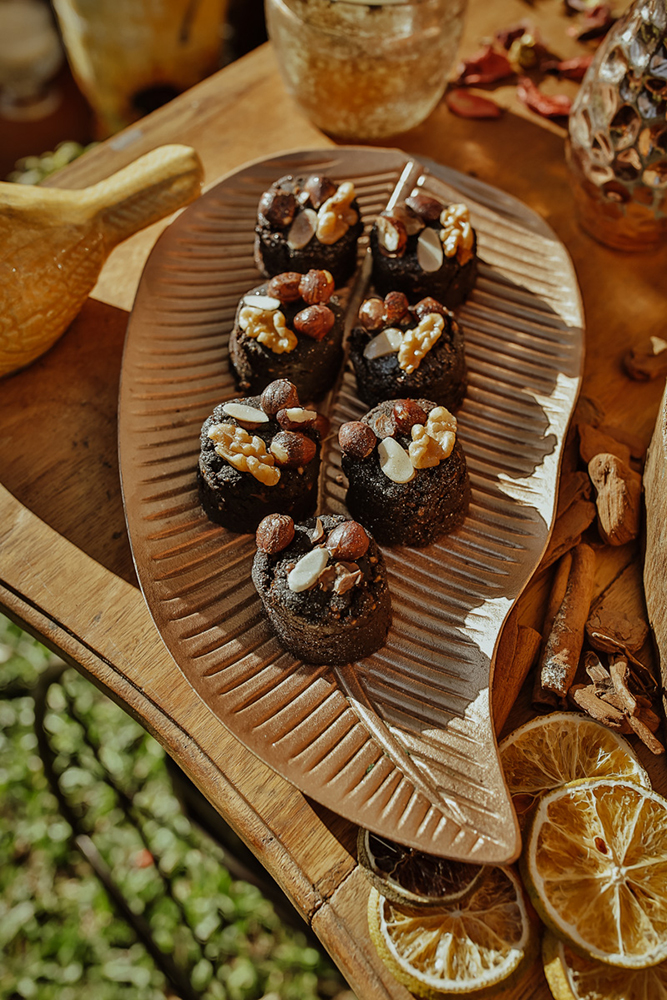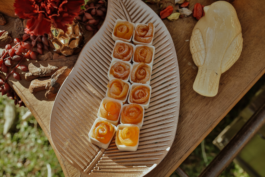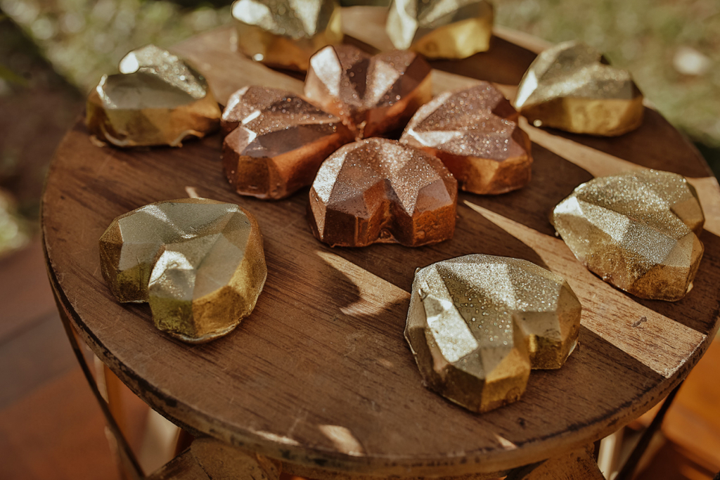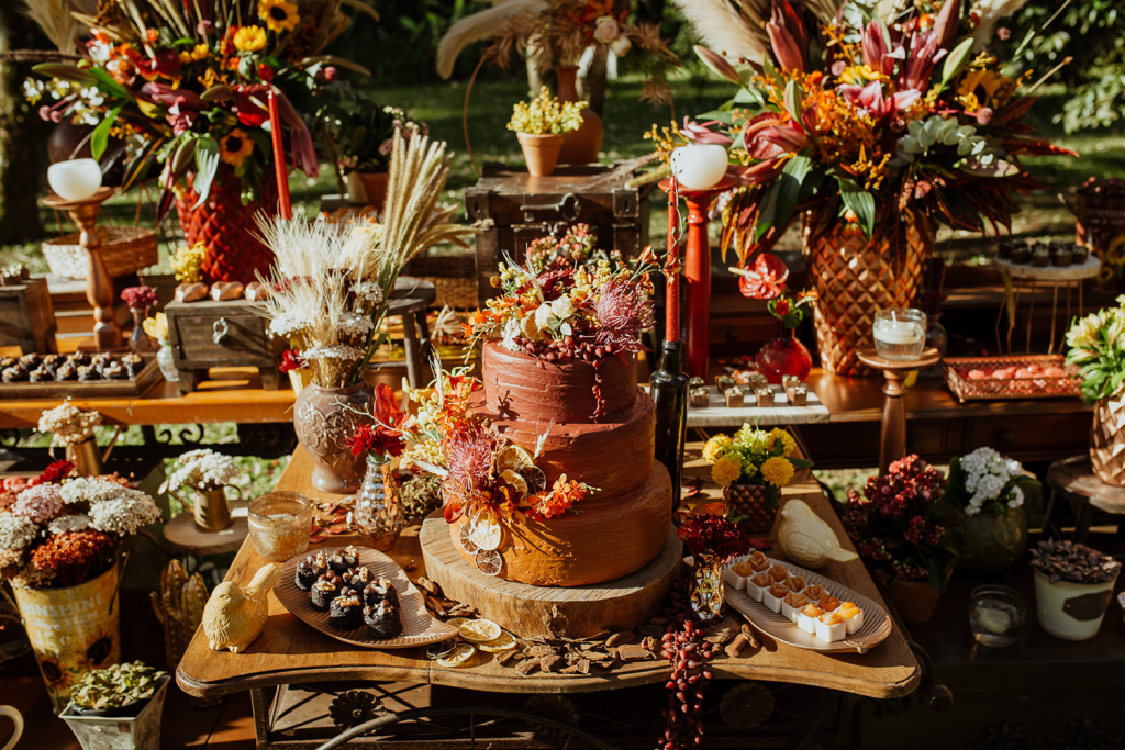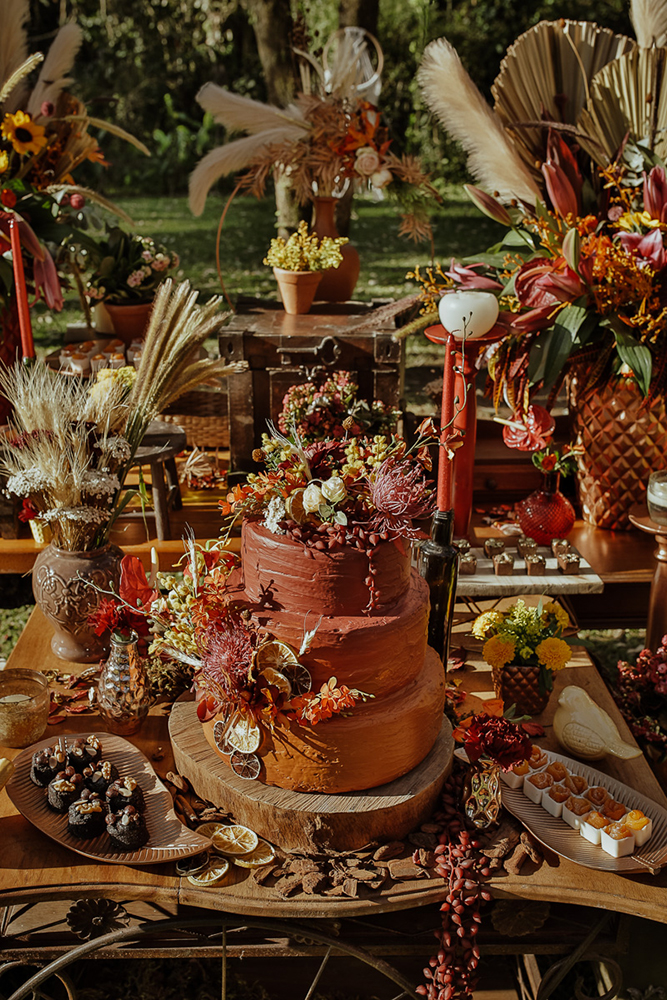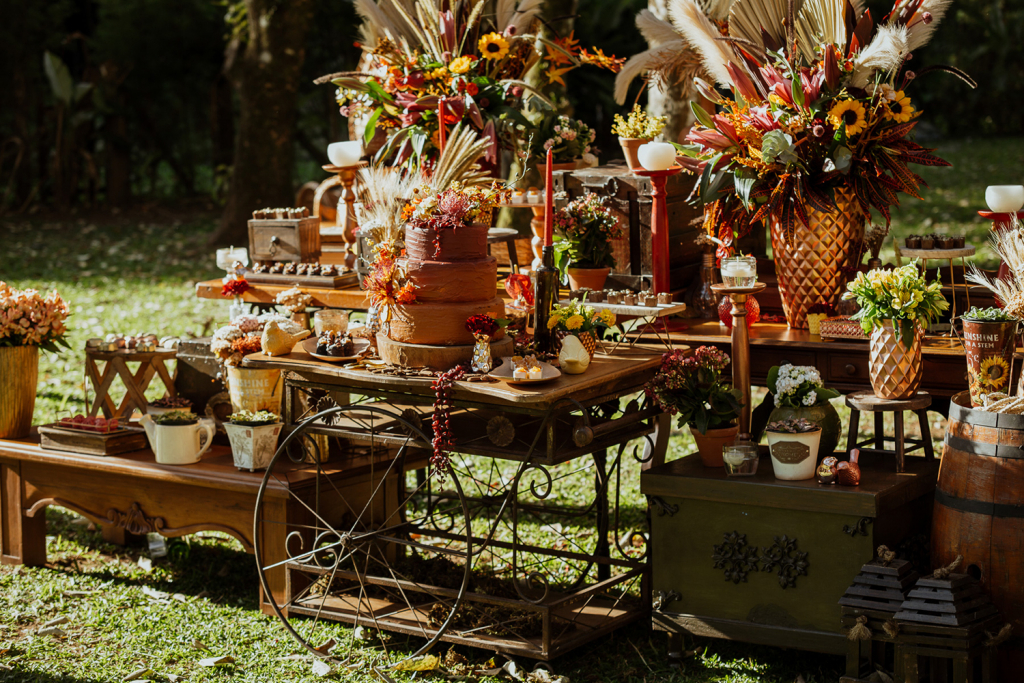 Igualmente marcante, a mesa de doces é uma explosão de cores e ideias, misturando tons terrosos e uma série de objetos.