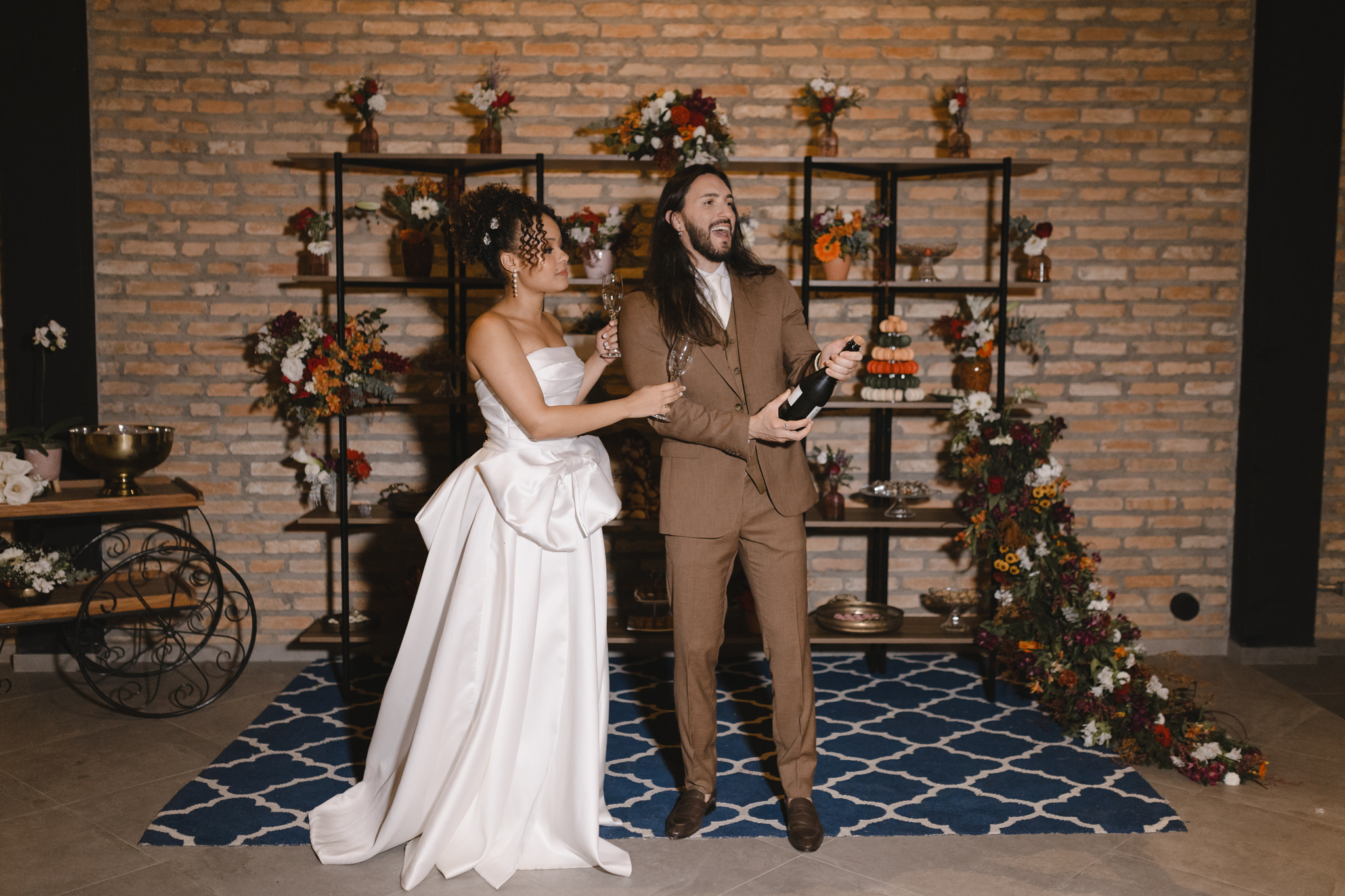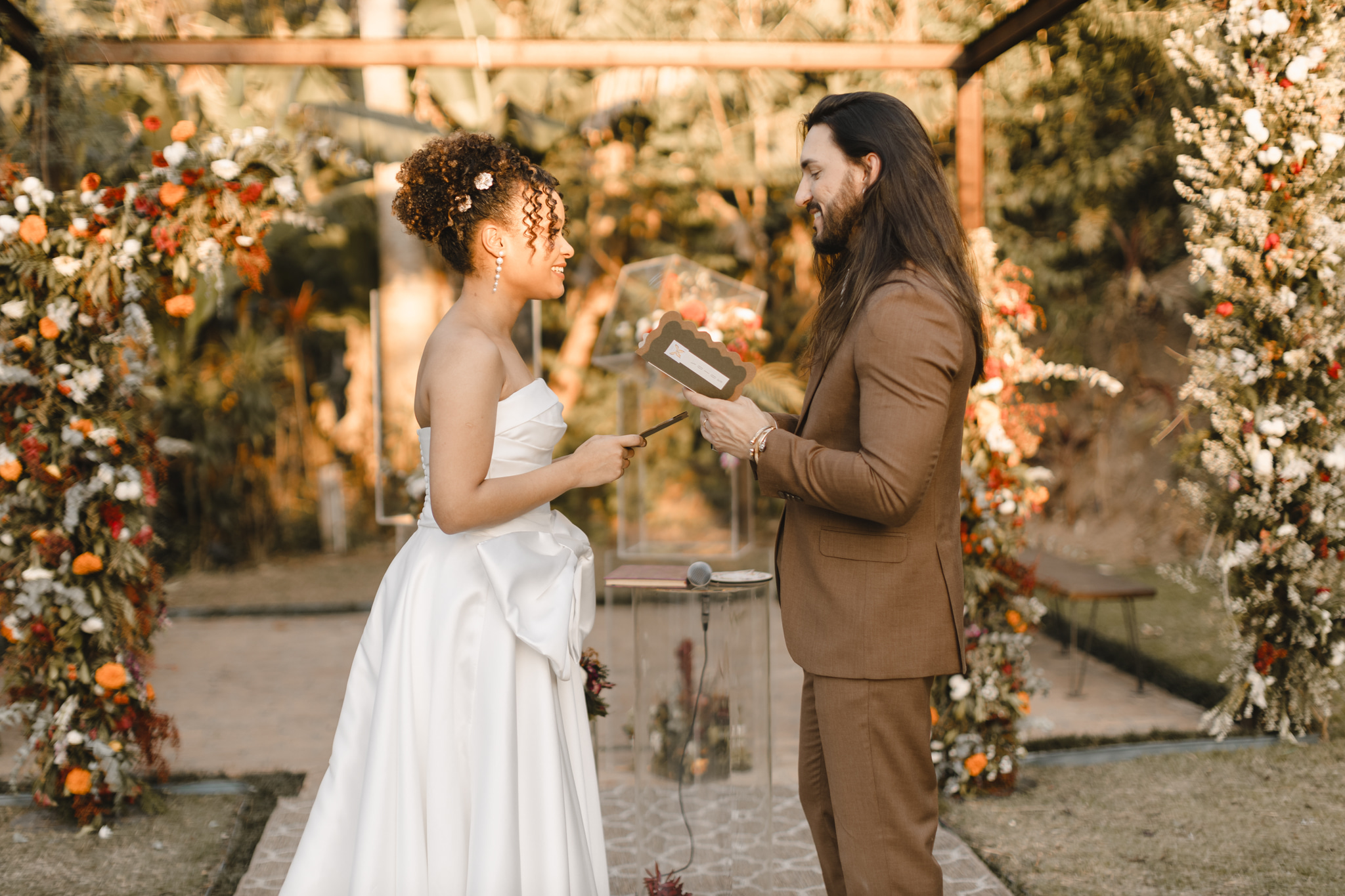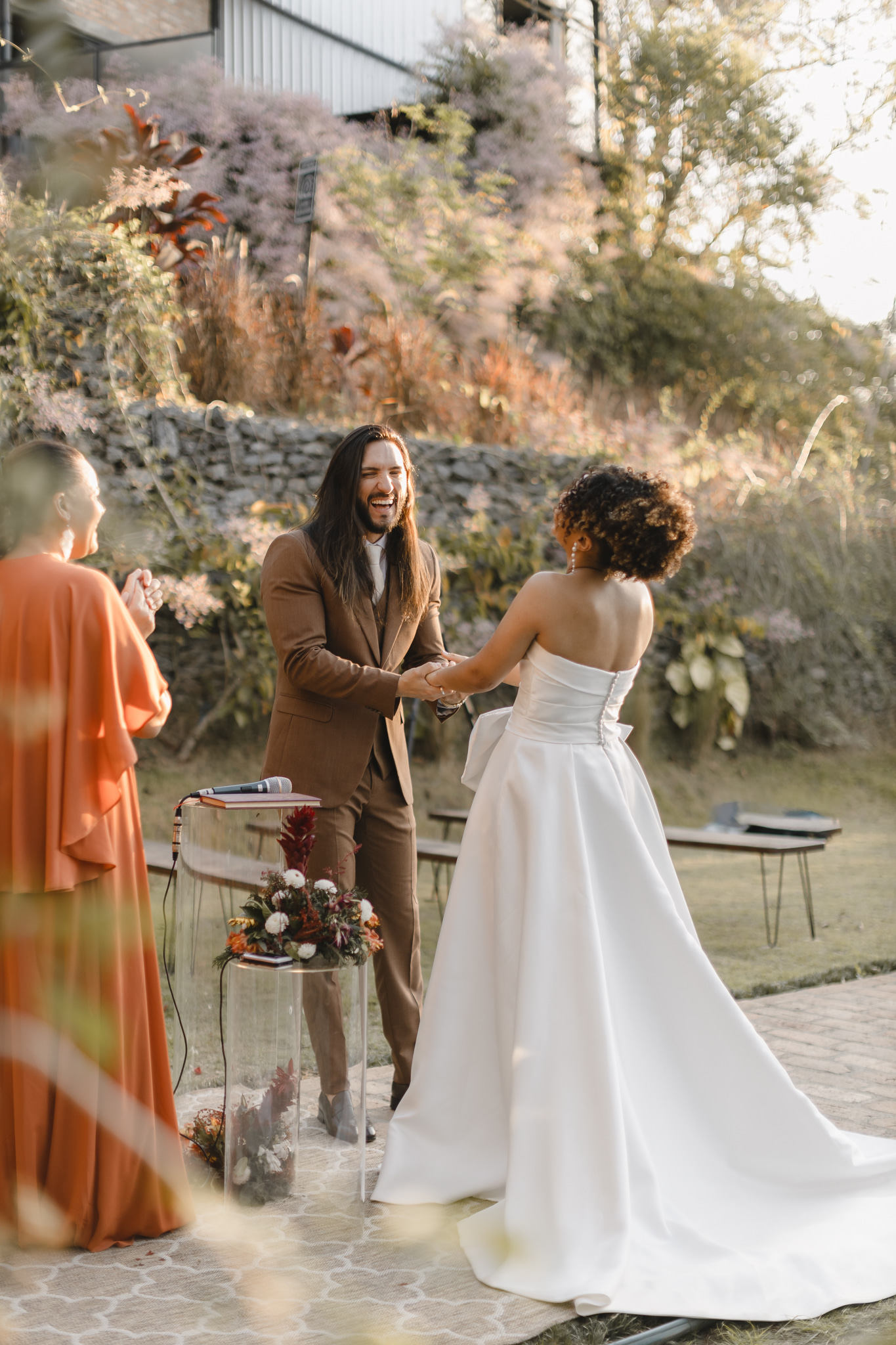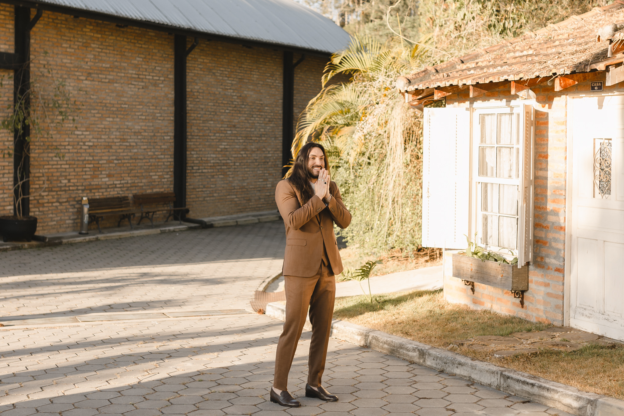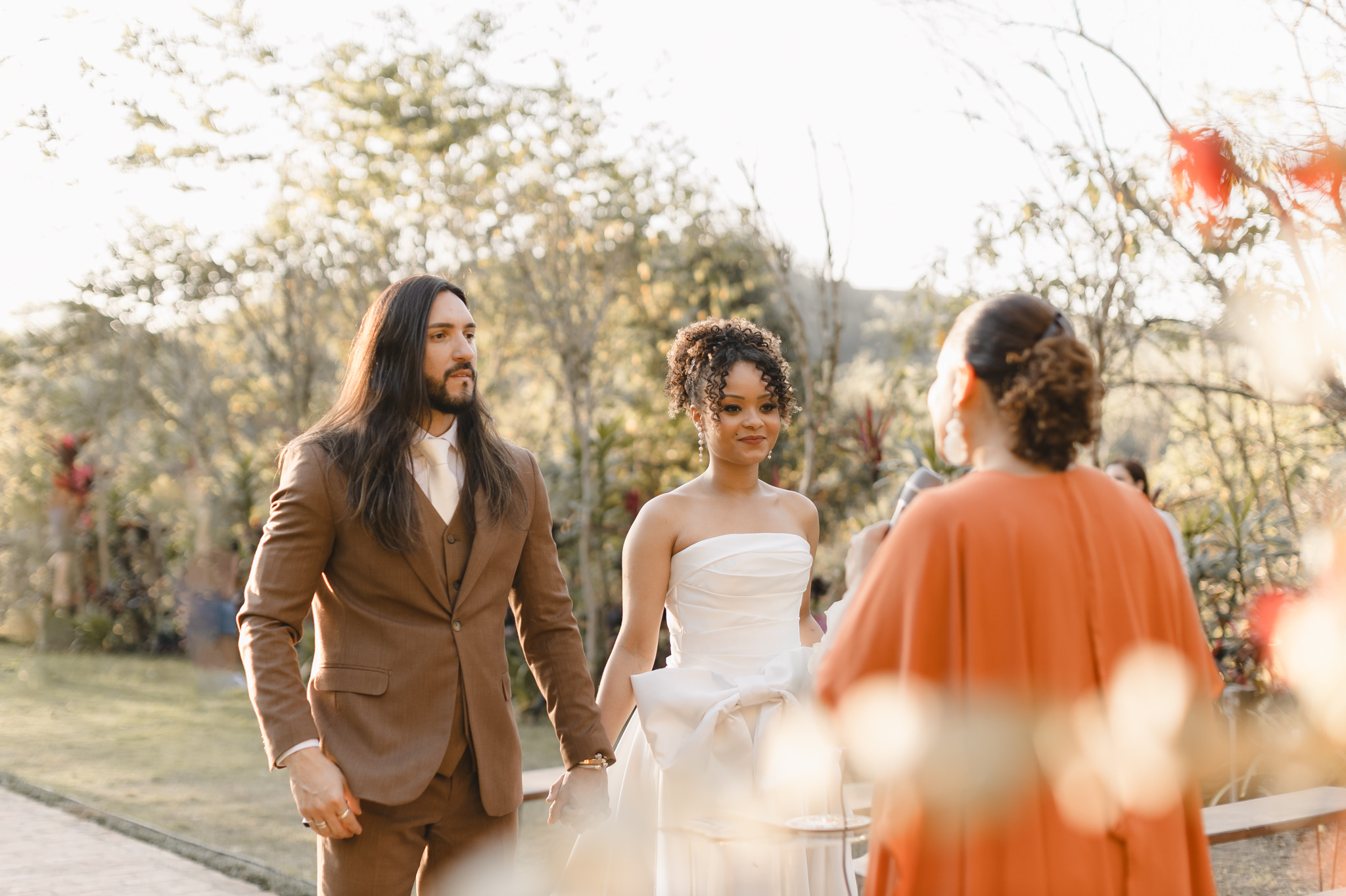 Enquanto isso, Ícaro usou traje marrom by P8 Noivos. A cor fora do comum, mas alinhadíssima com o estilo do noivo, ficou ótima!
