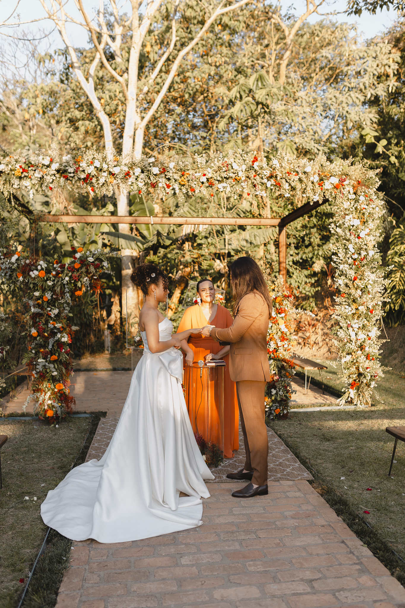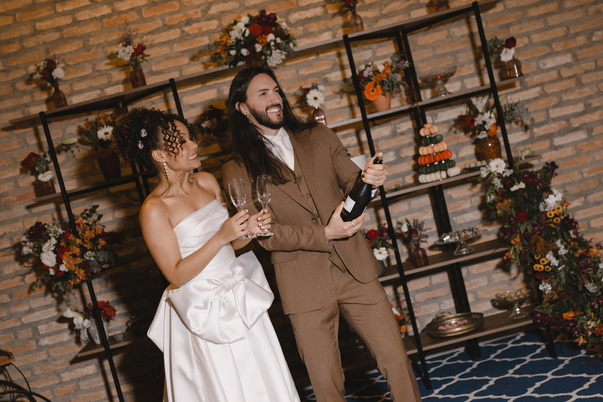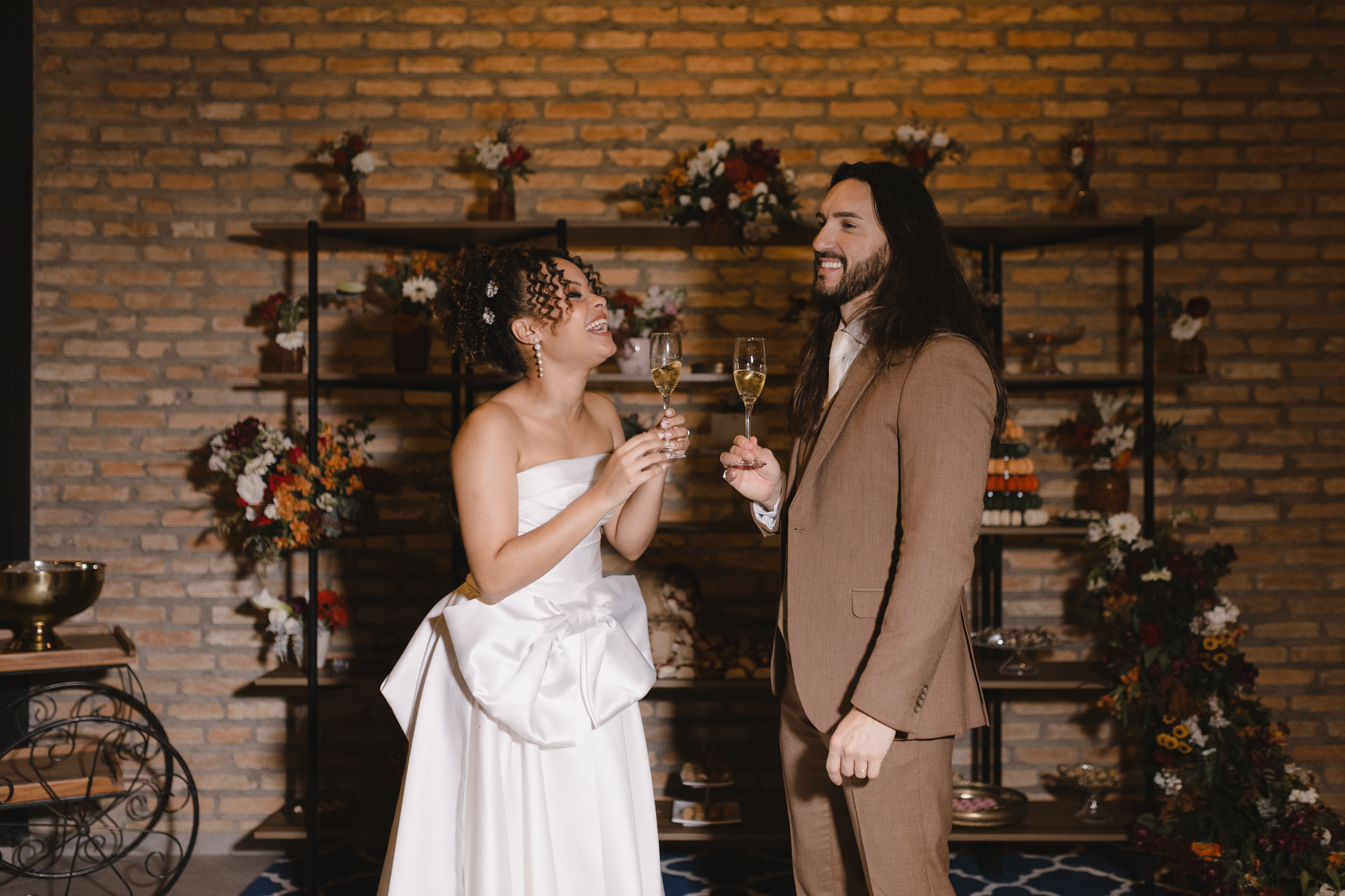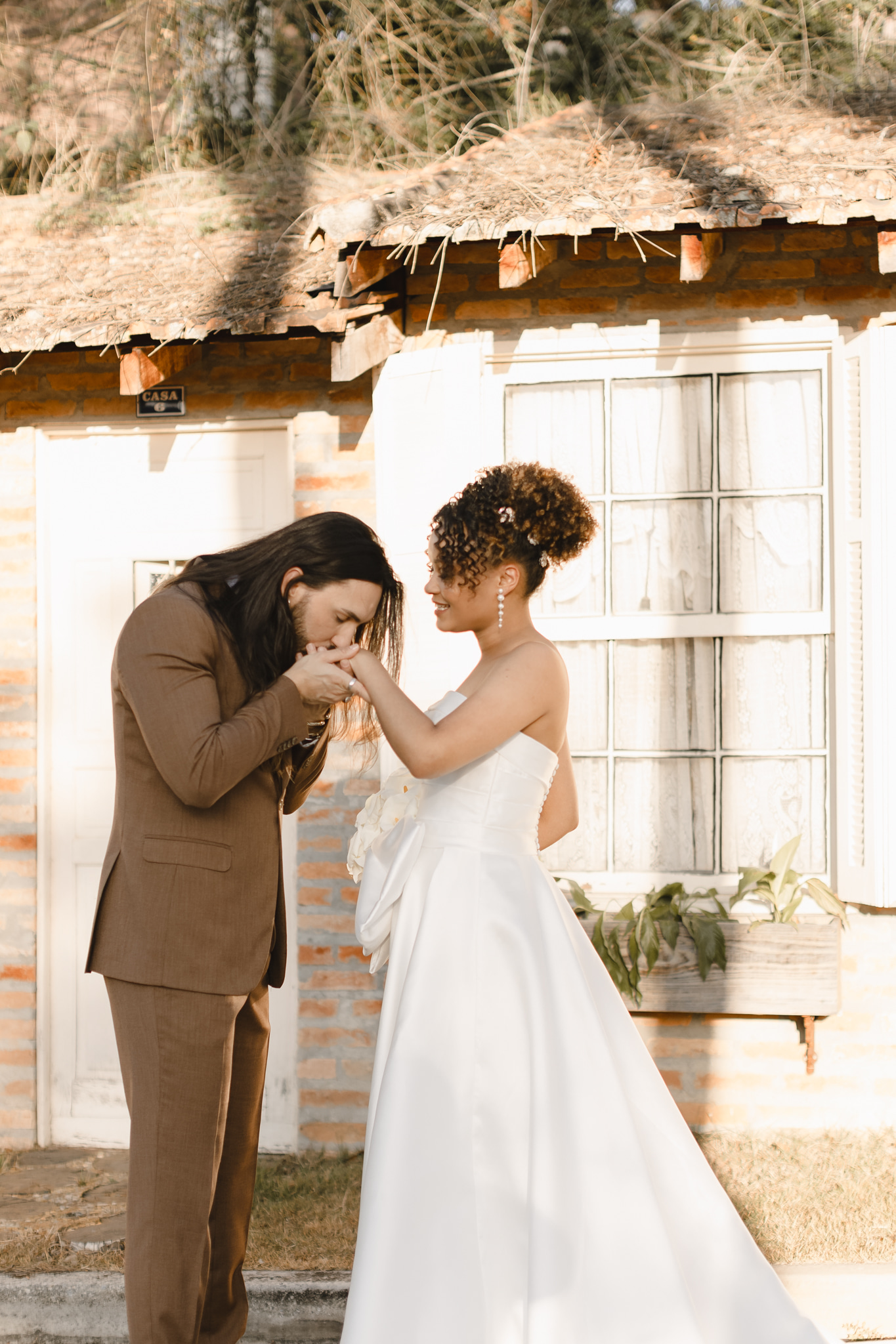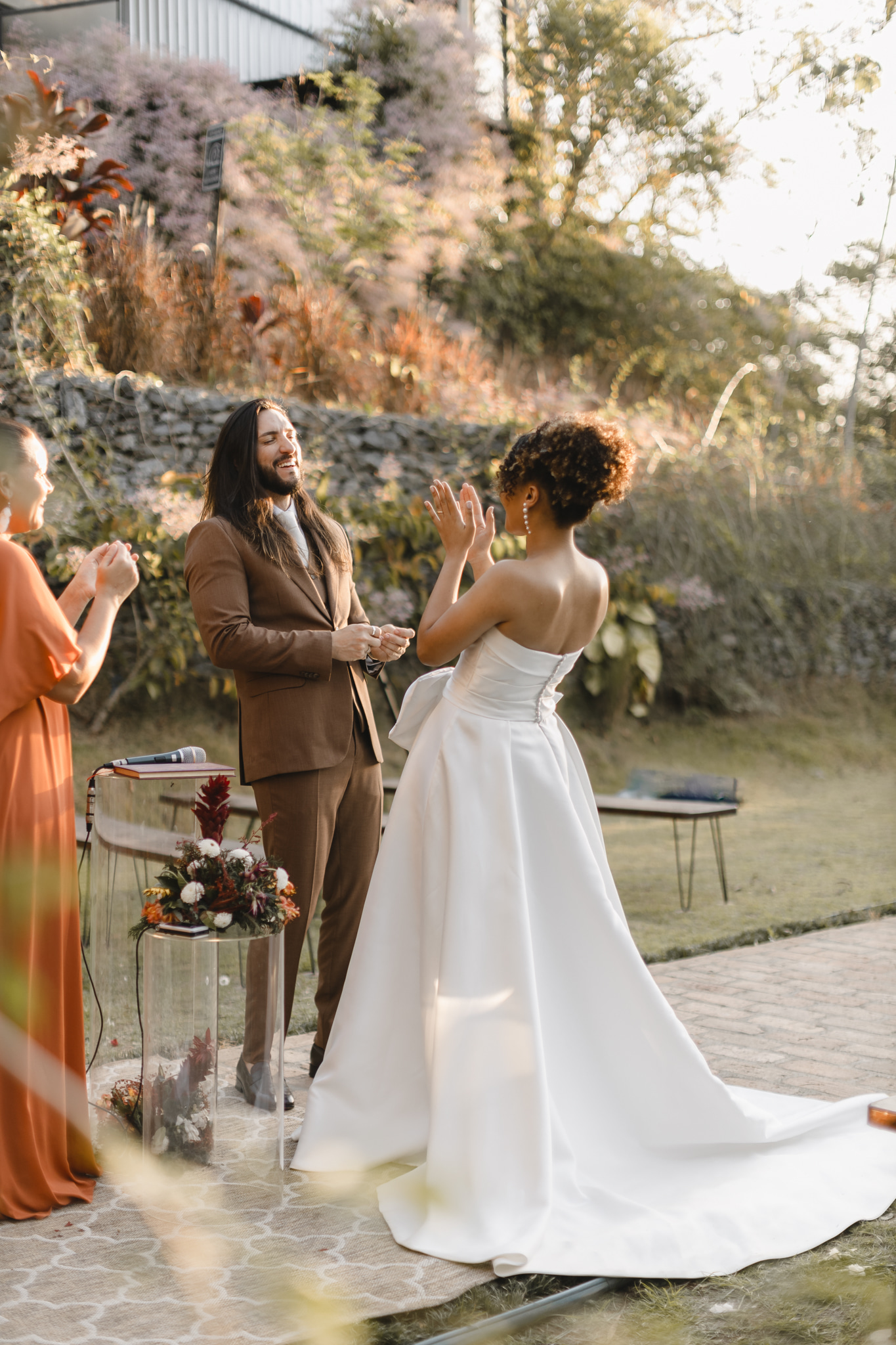 Enquanto isso, Ícaro usou traje marrom by P8 Noivos. A cor fora do comum, mas alinhadíssima com o estilo do noivo, ficou ótima!