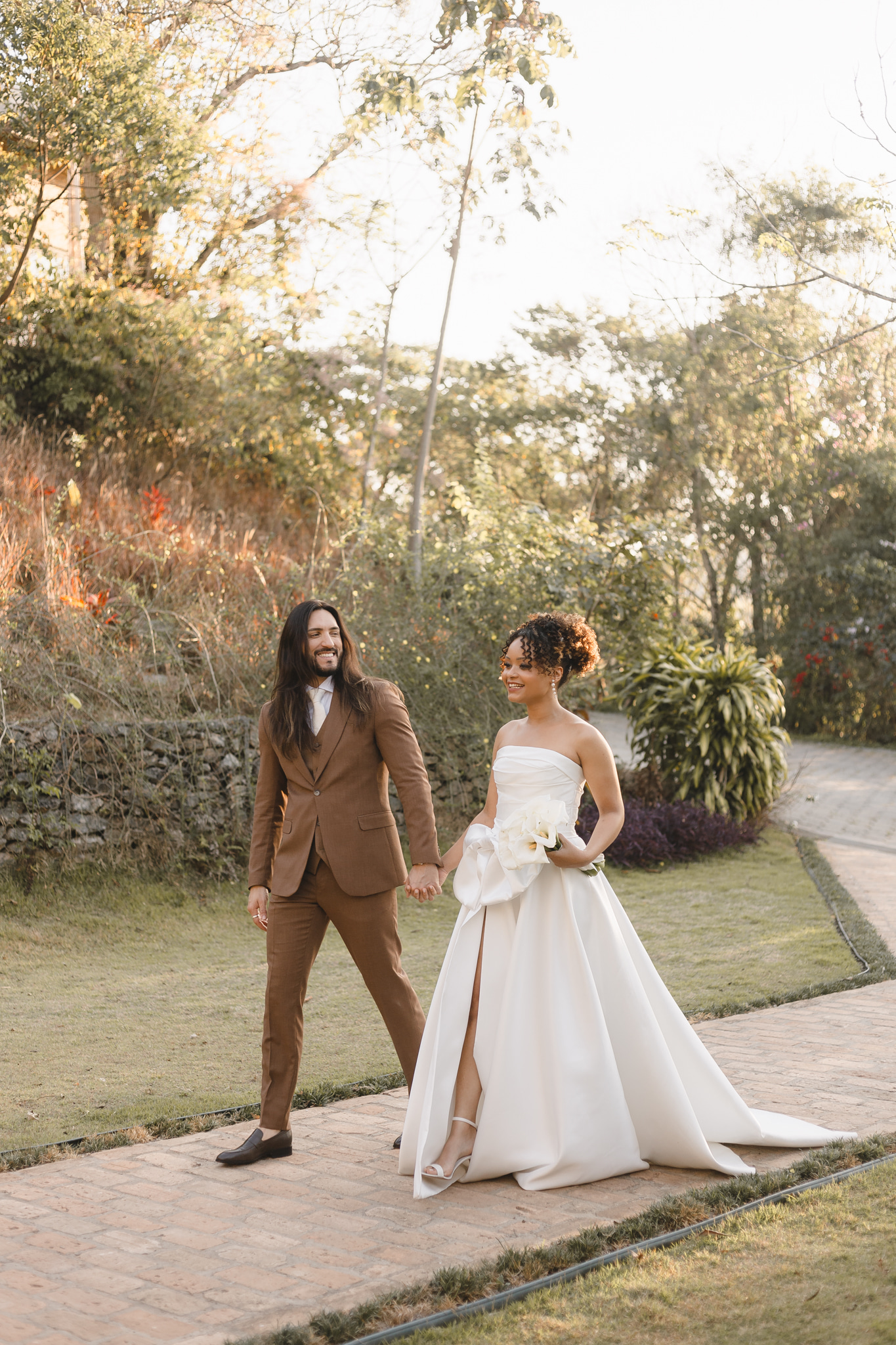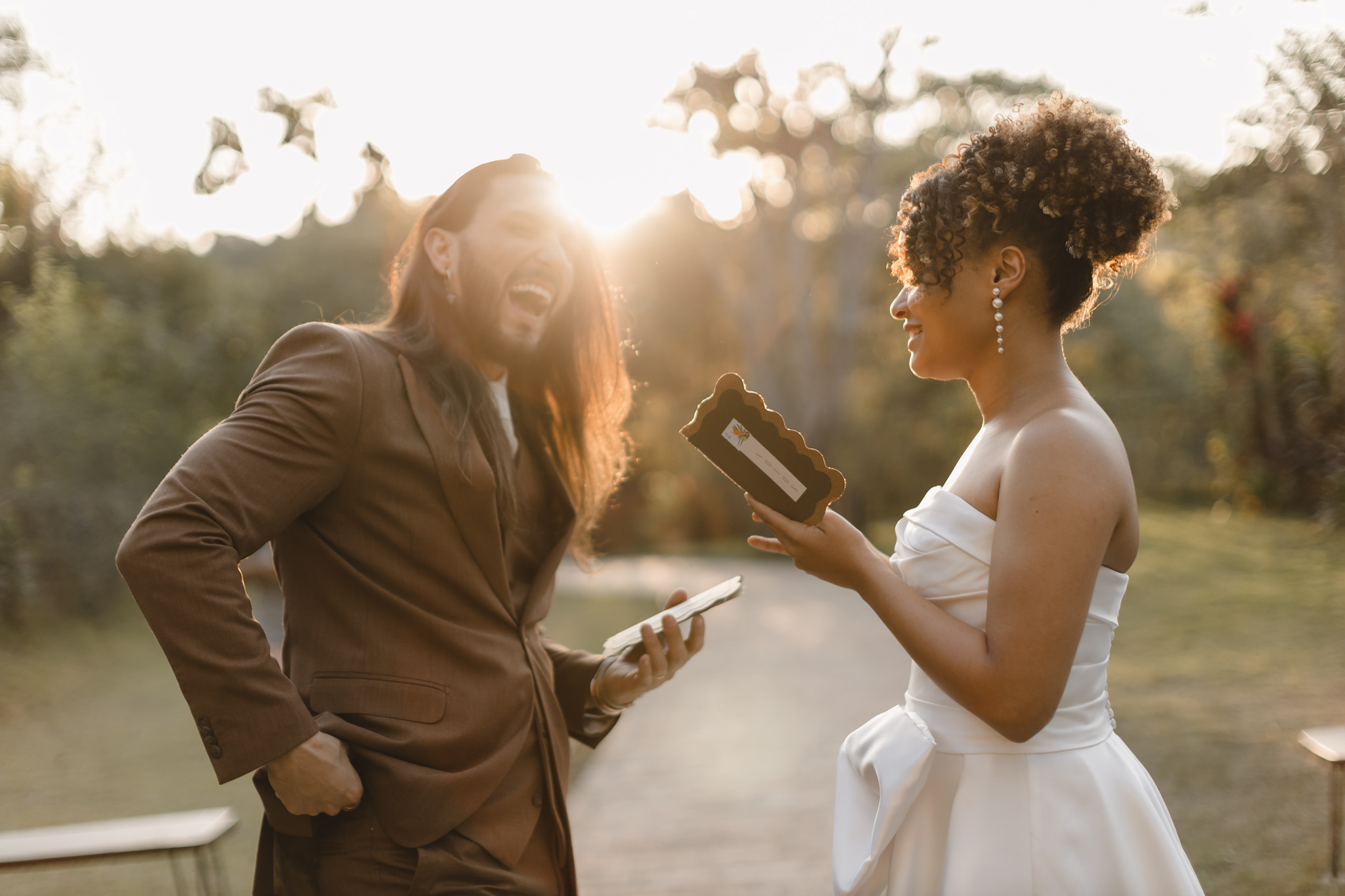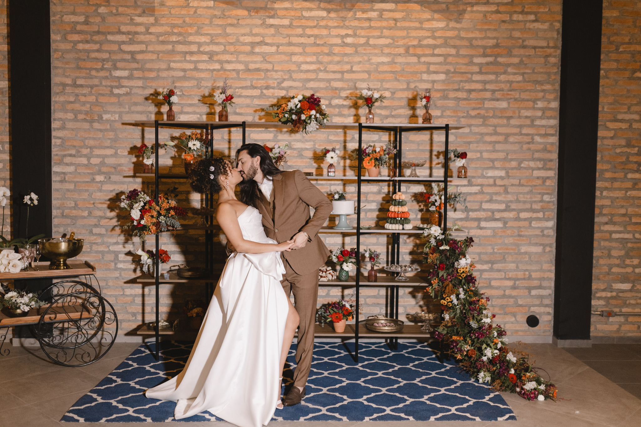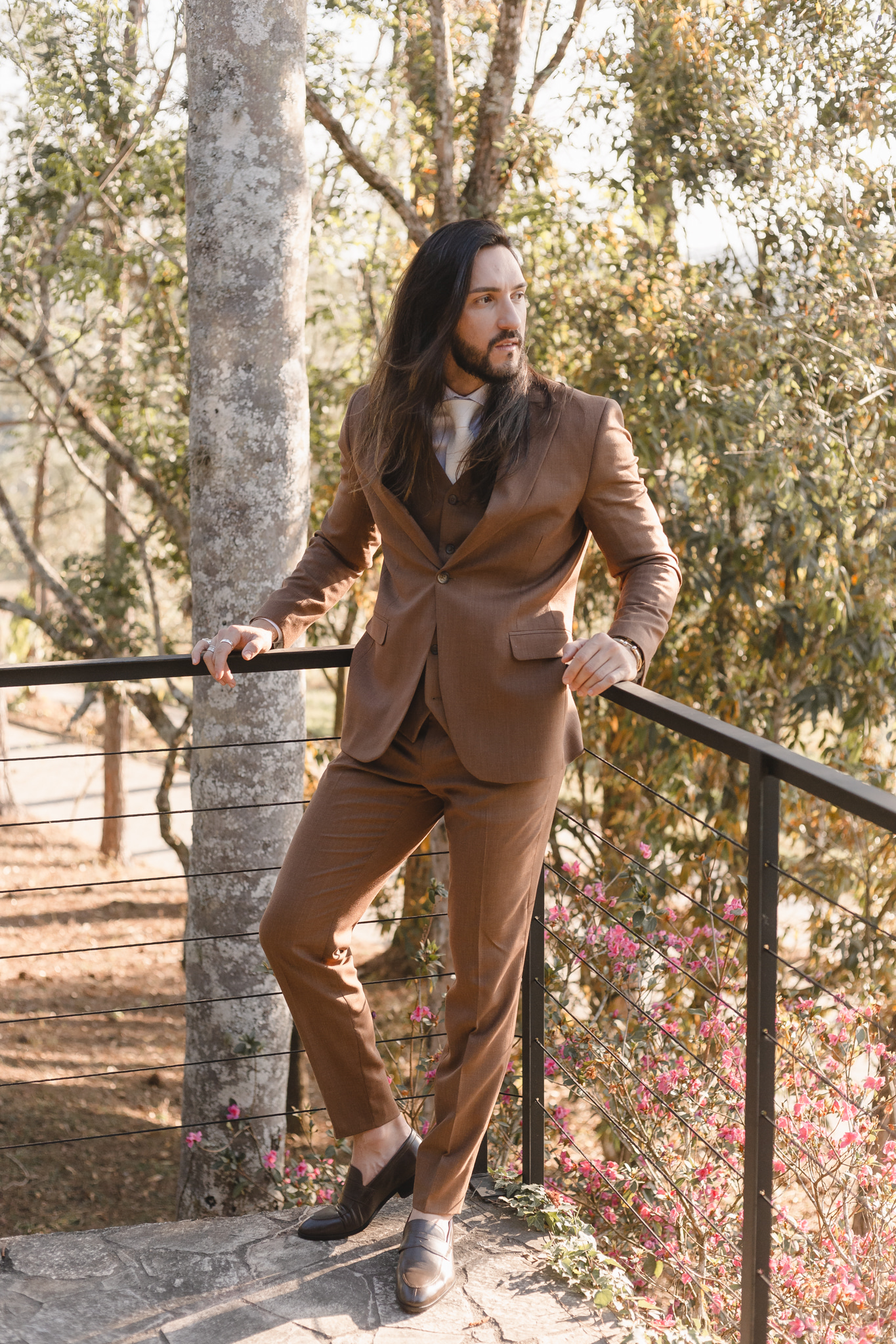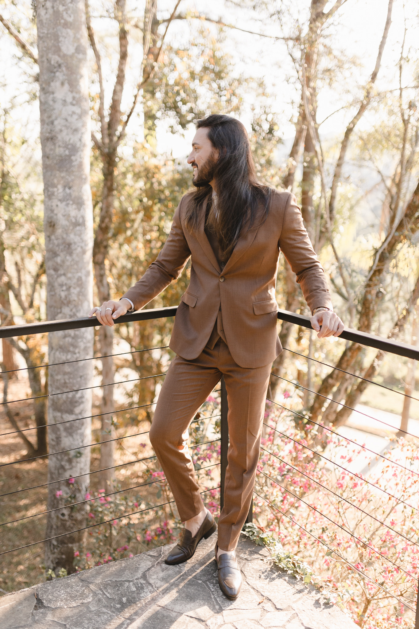 Enquanto isso, Ícaro usou traje marrom by P8 Noivos. A cor fora do comum, mas alinhadíssima com o estilo do noivo, ficou ótima!