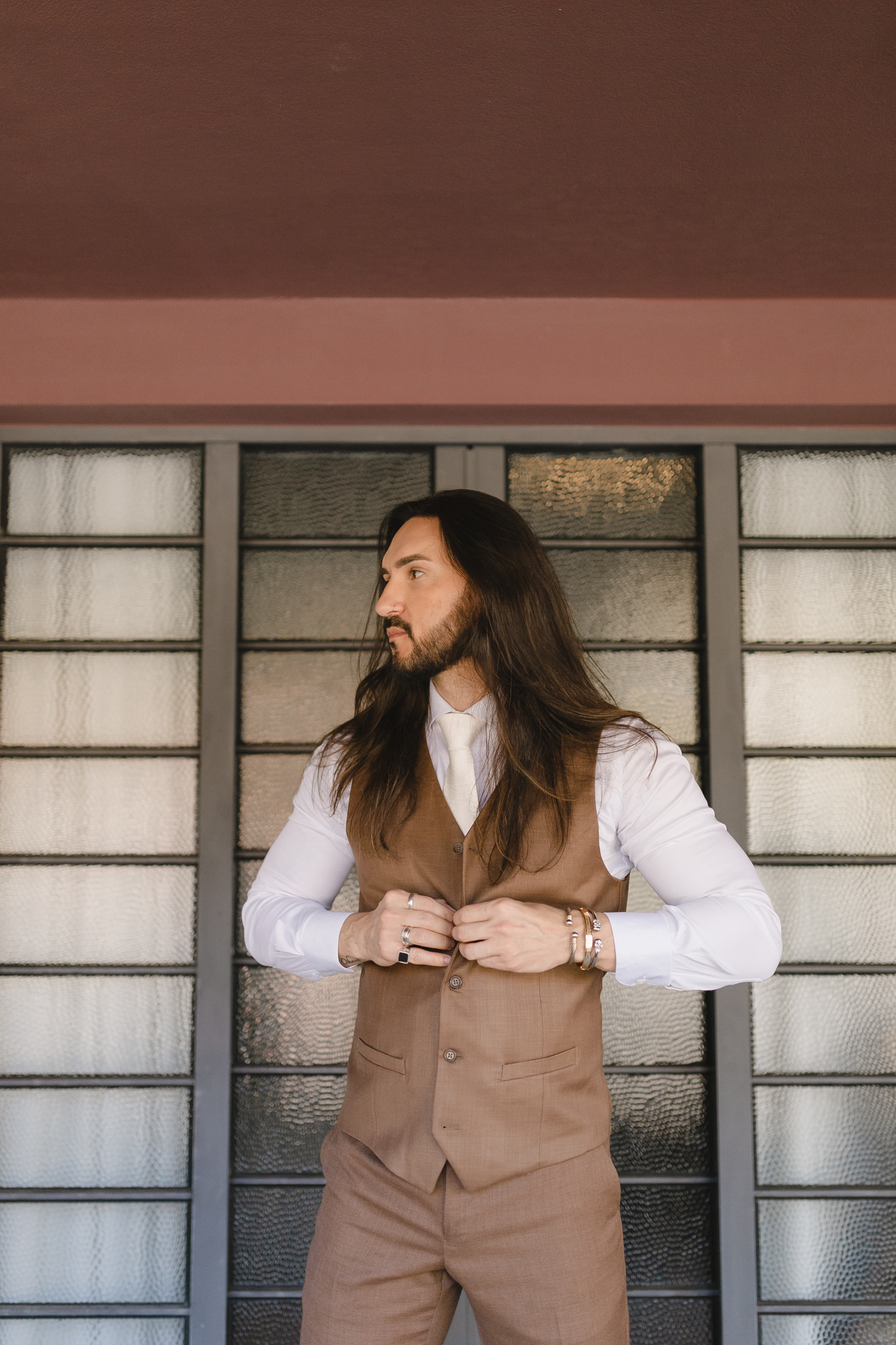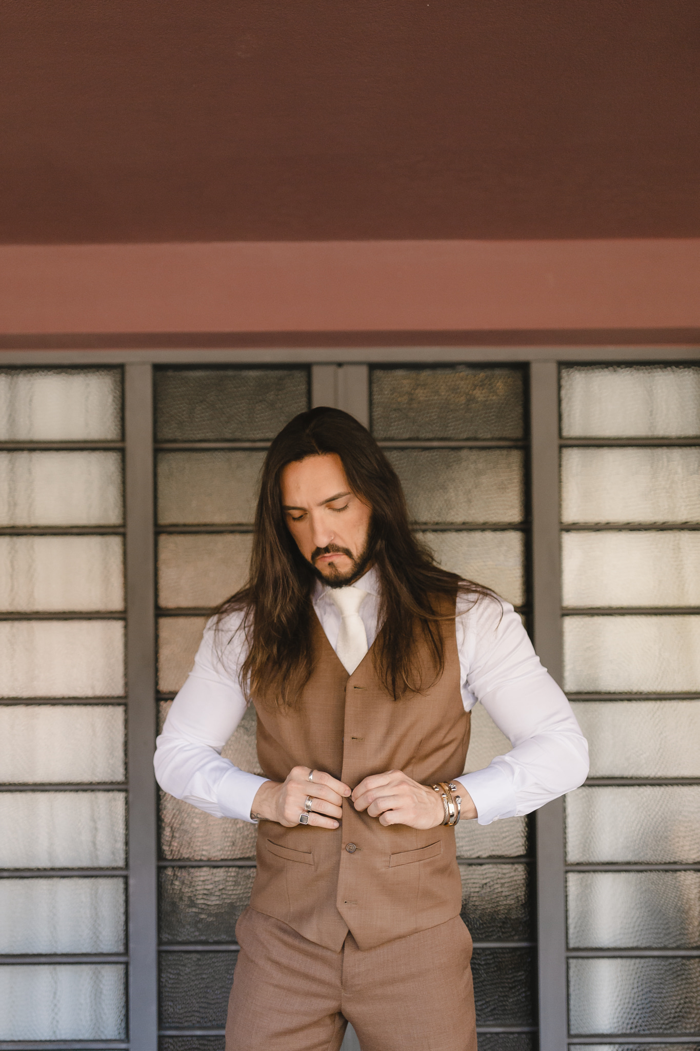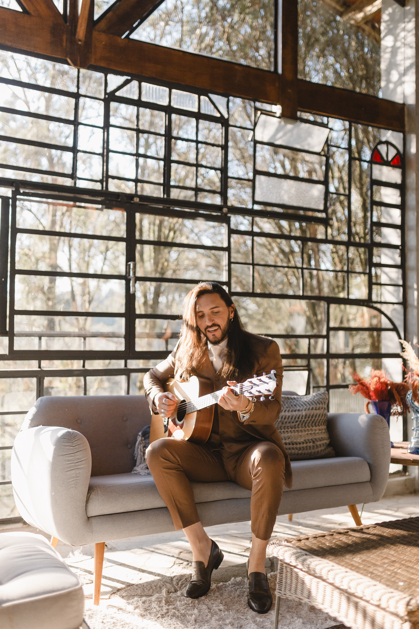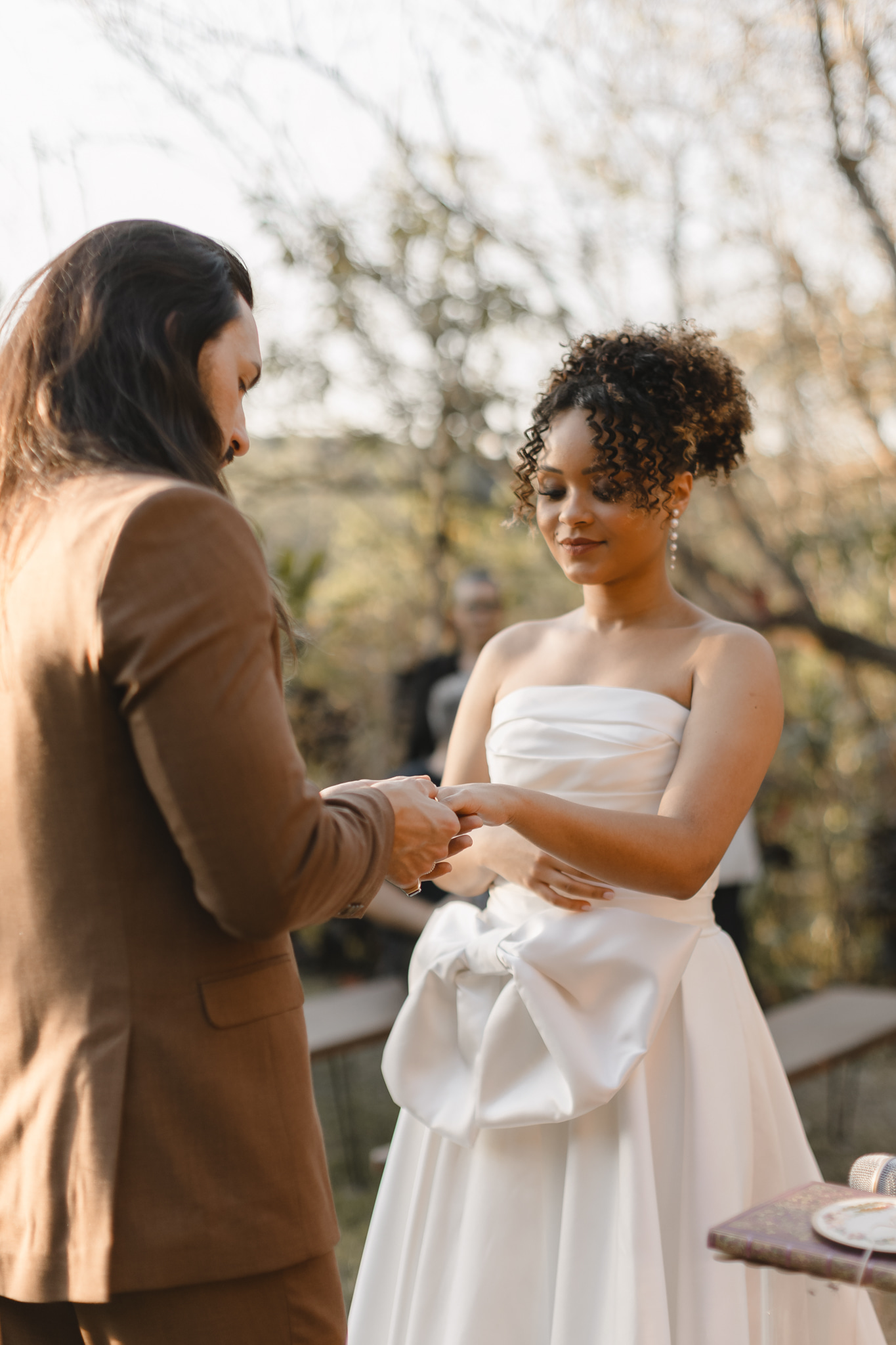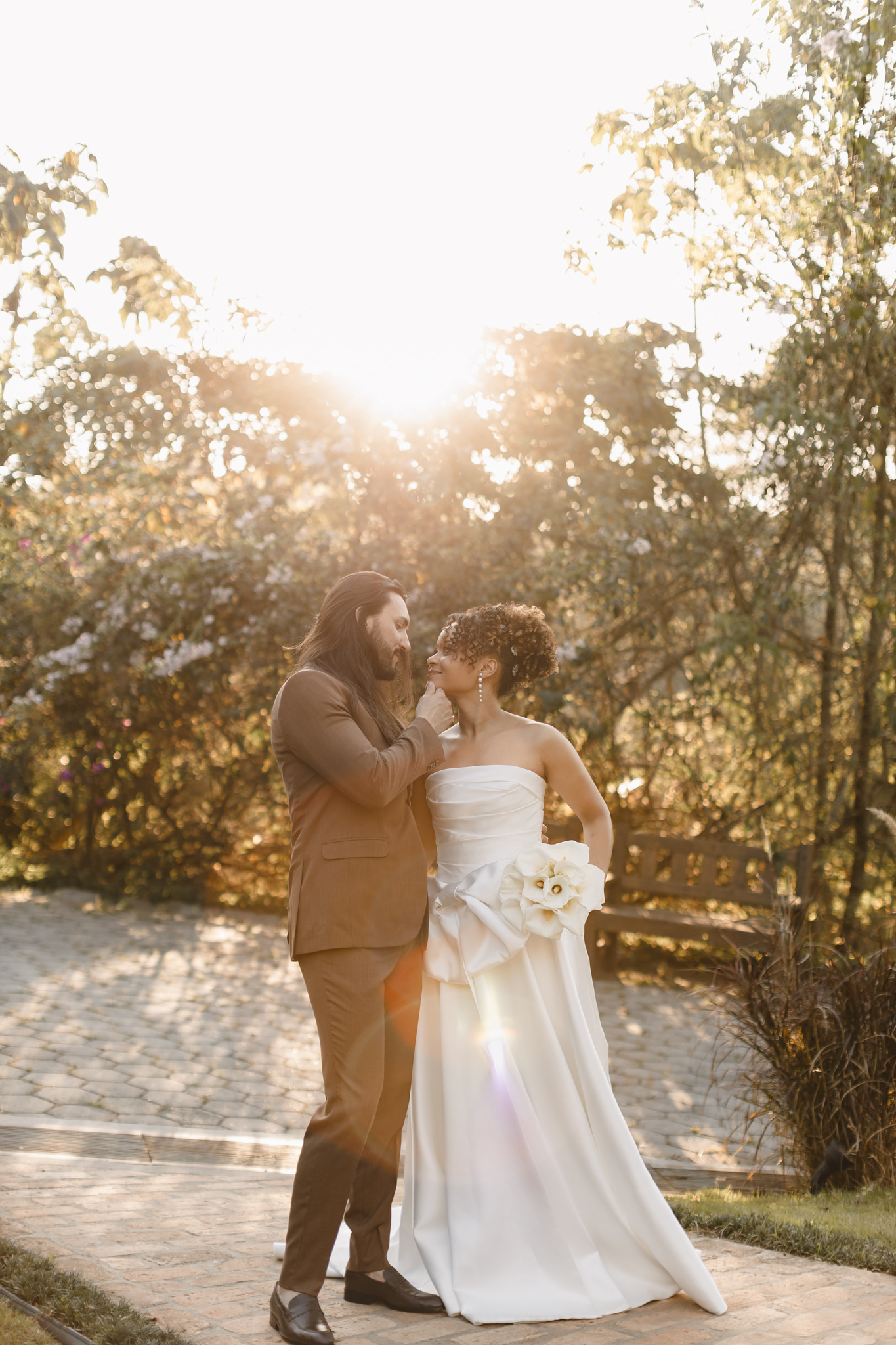 Enquanto isso, Ícaro usou traje marrom by P8 Noivos. A cor fora do comum, mas alinhadíssima com o estilo do noivo, ficou ótima!